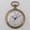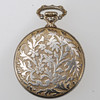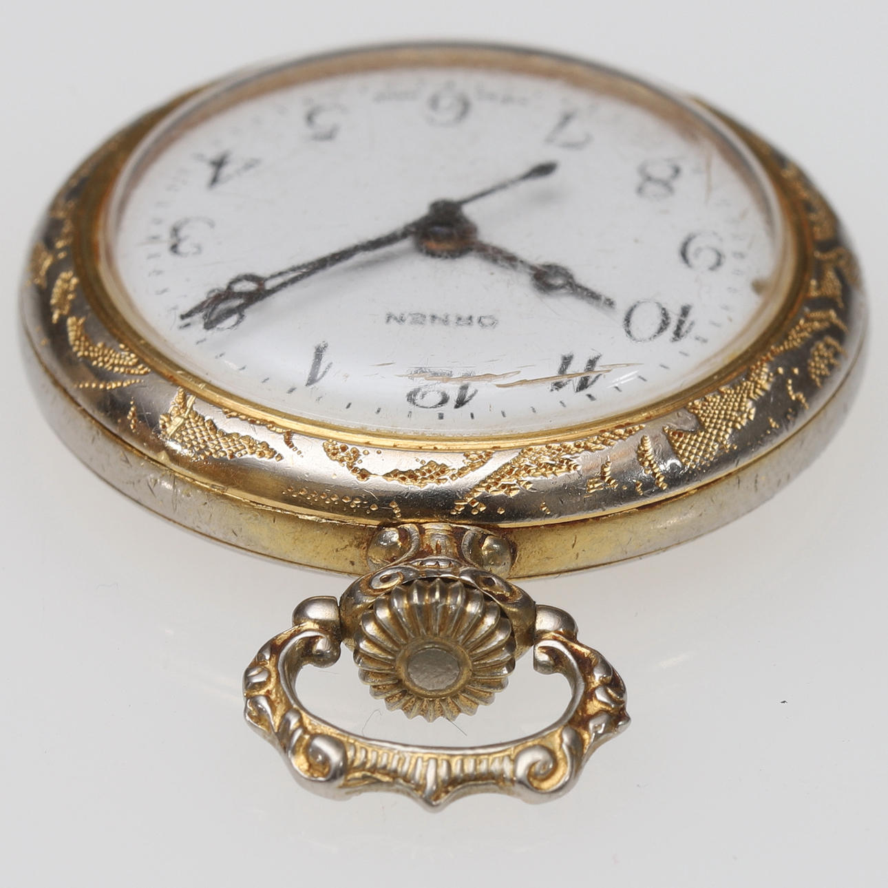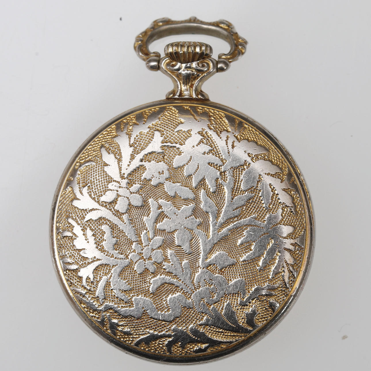 Förgylld metall, rikligt dekorerade baksida med blommor i relief. Uppdragbar. Diameter ca 32 mm, exkl krona och hänge.