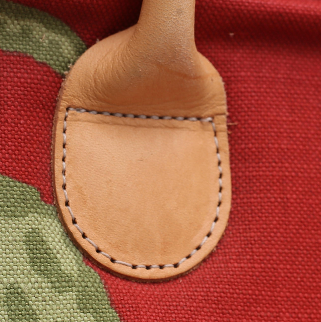 canvastyg med naturfärgade läderdetaljer.