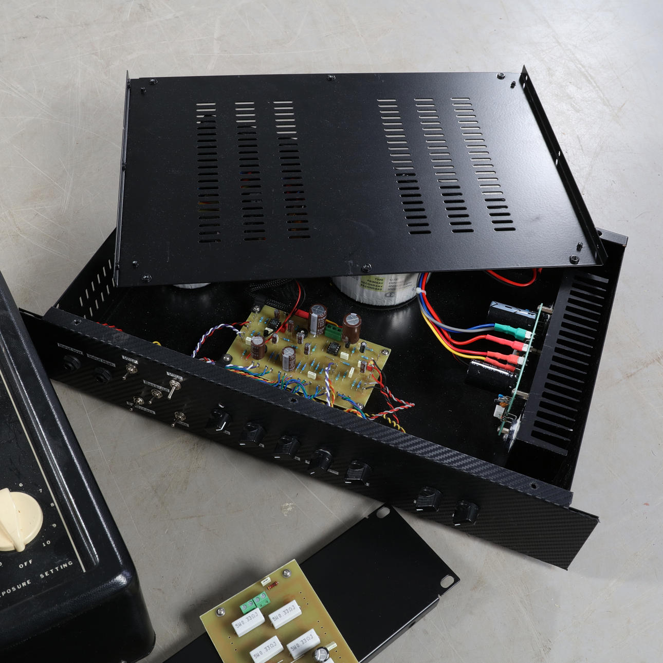 Metallhölje innehållande div. komponenter. Höljets mått: 43x31x10 cm. Saknar strömkabel.