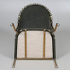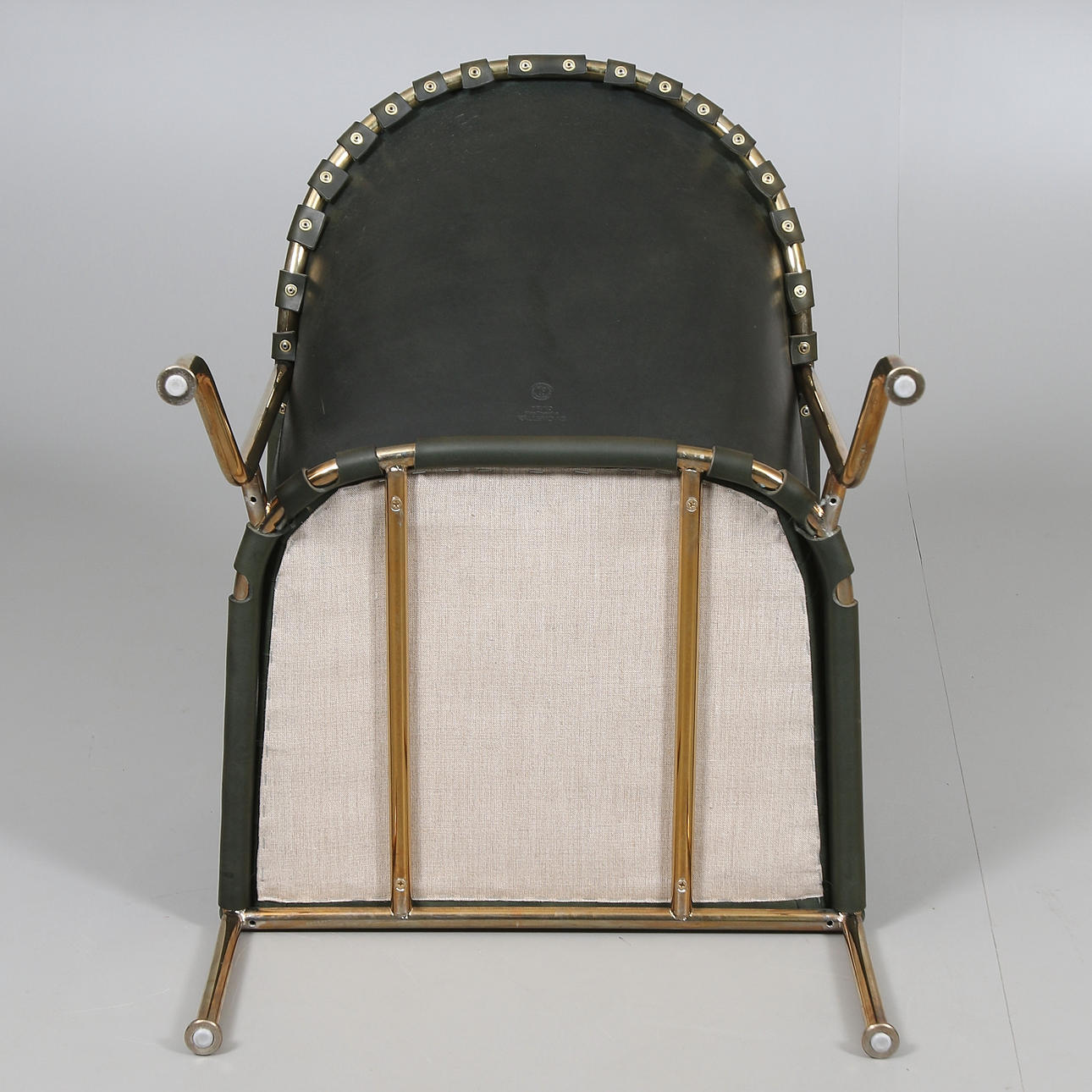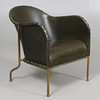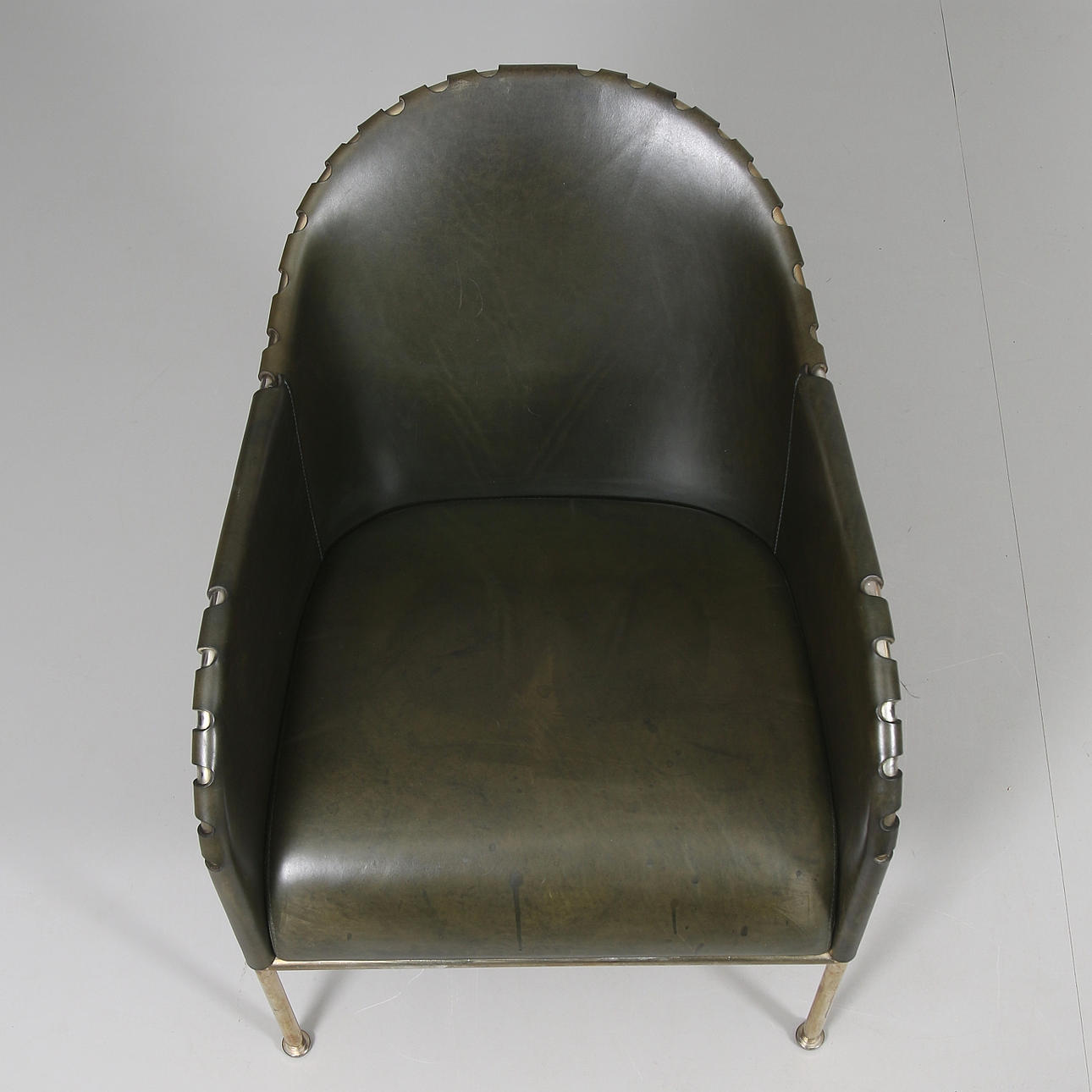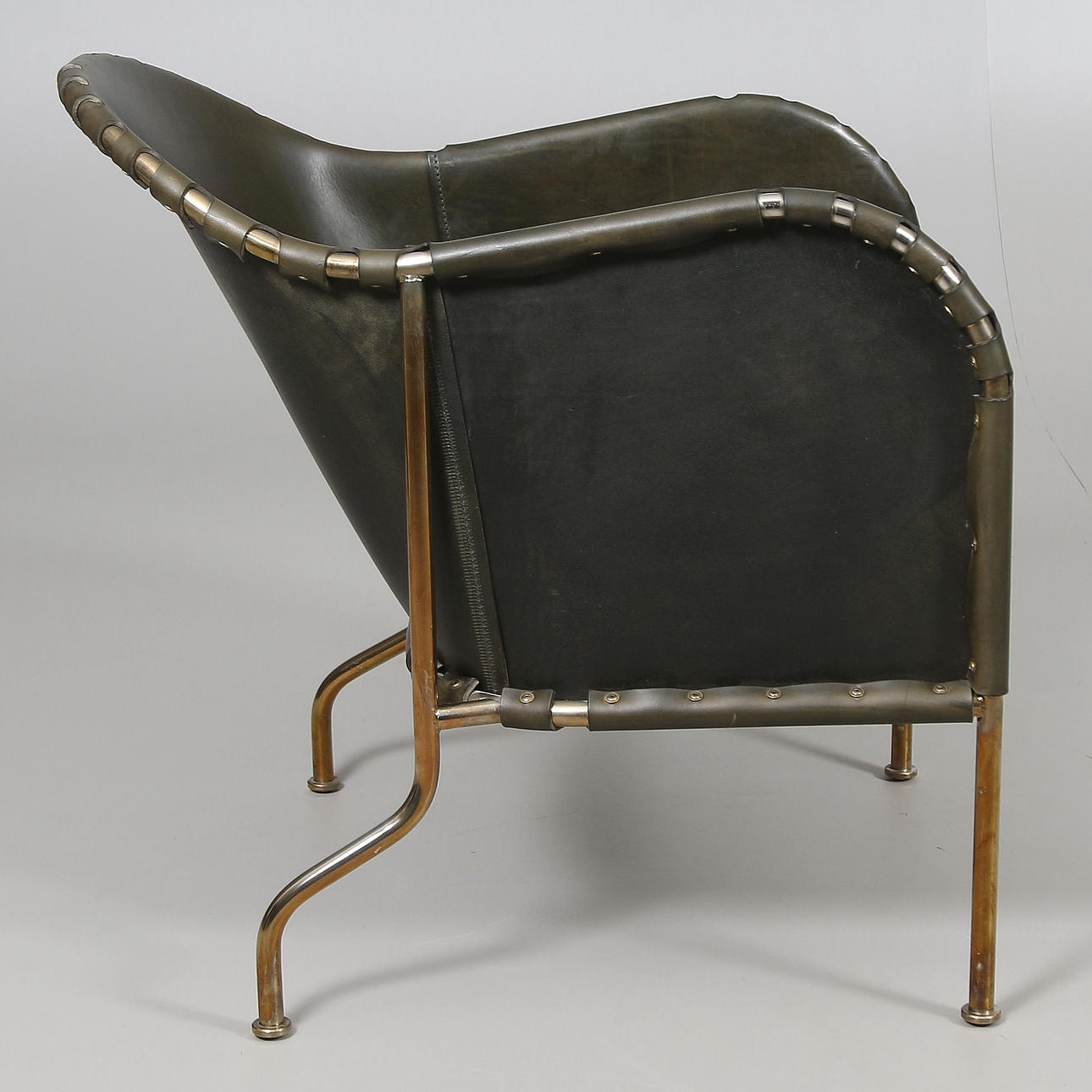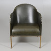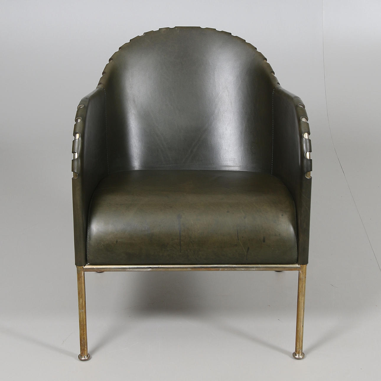 Stomme av mässing, fast stoppad sits, klädd med buteljgrön skinn. Stämpelmärkt "Bruno, Mats Theselius, KÄLLEMO AB", samt "Tärningsjö Garveri AB". Modellen formgiven år 1997. Sitthöjd 38, höjd 71 cm.