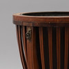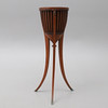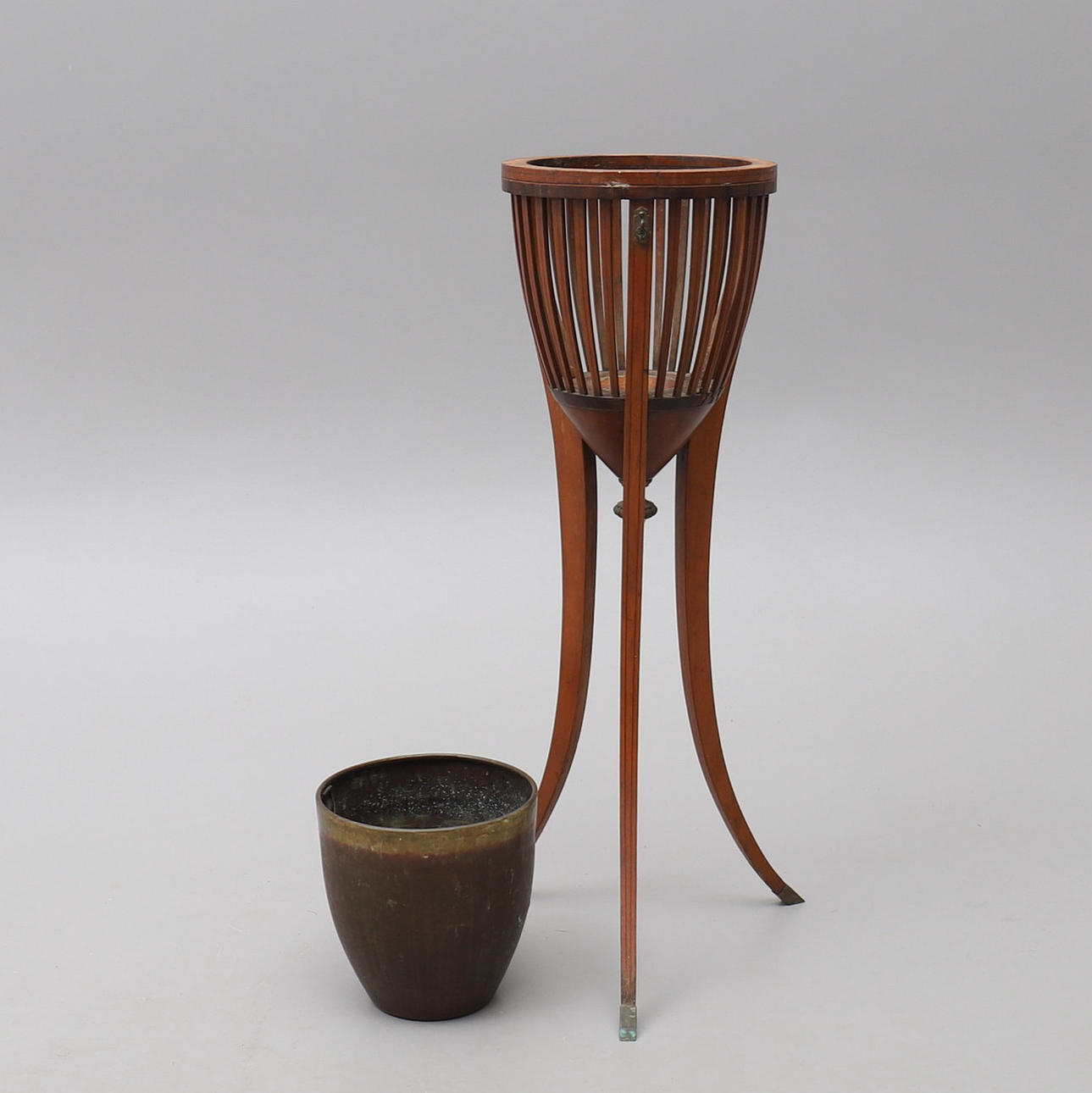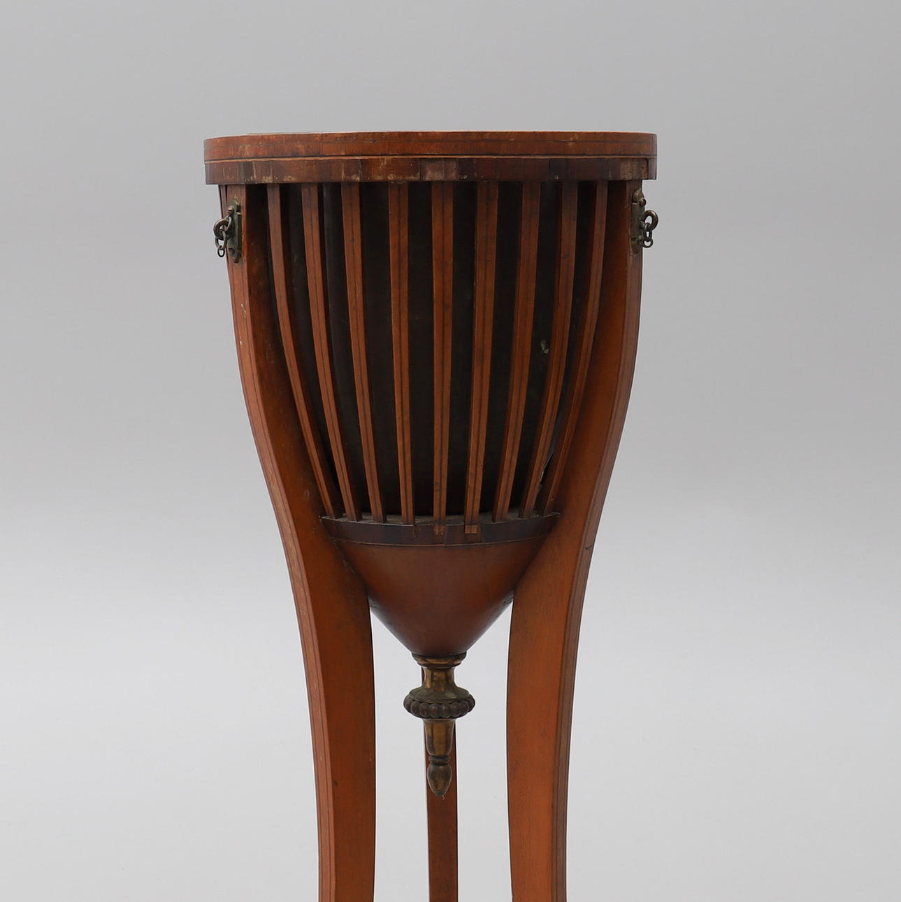 Fanerad med olika träslag, insats av mässing, mässingsskodda fötter, beslag för kedjor som saknas, 1800-talets första hälft, höjd 81 cm.