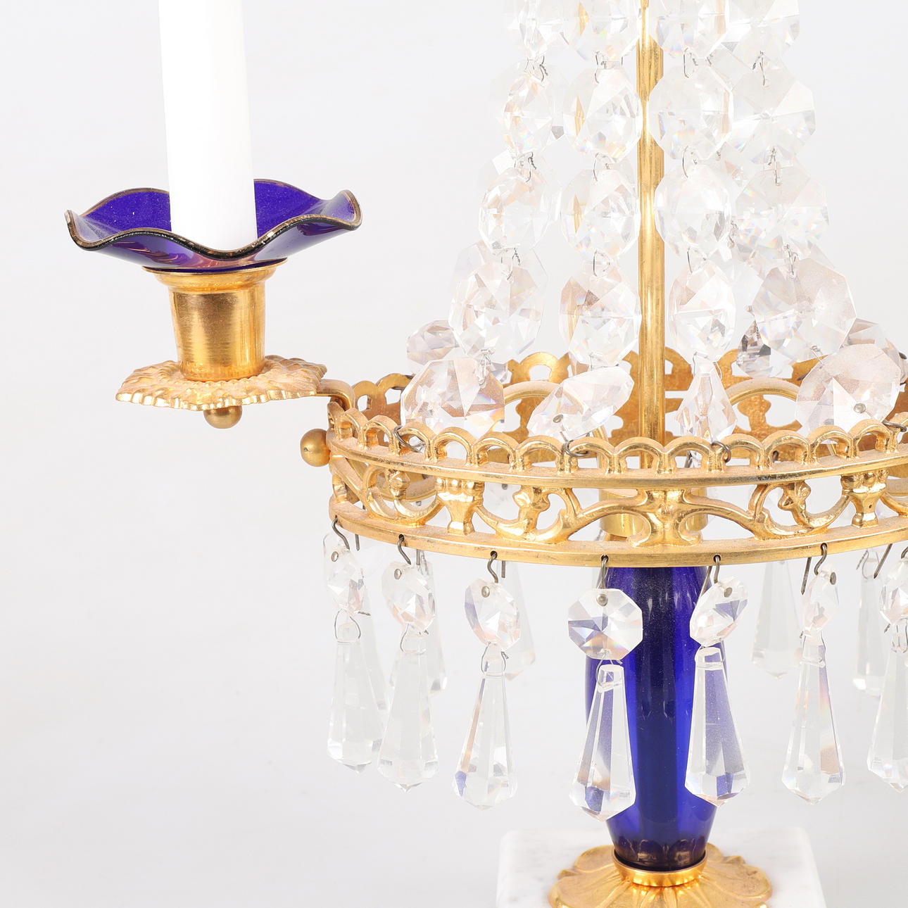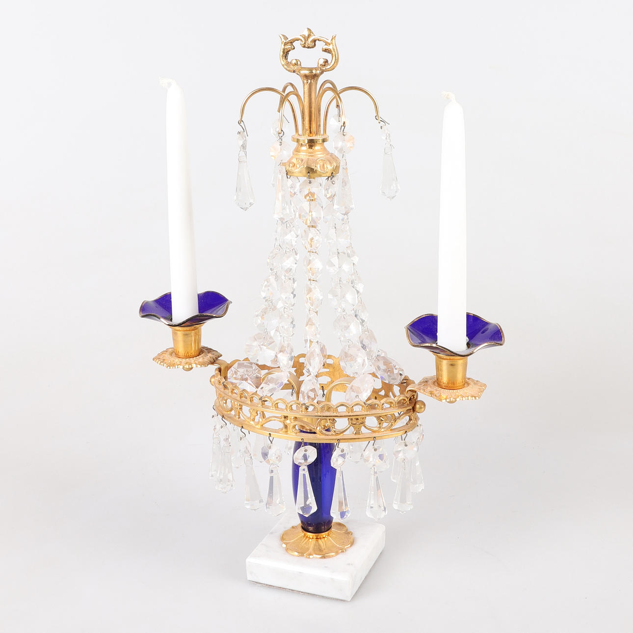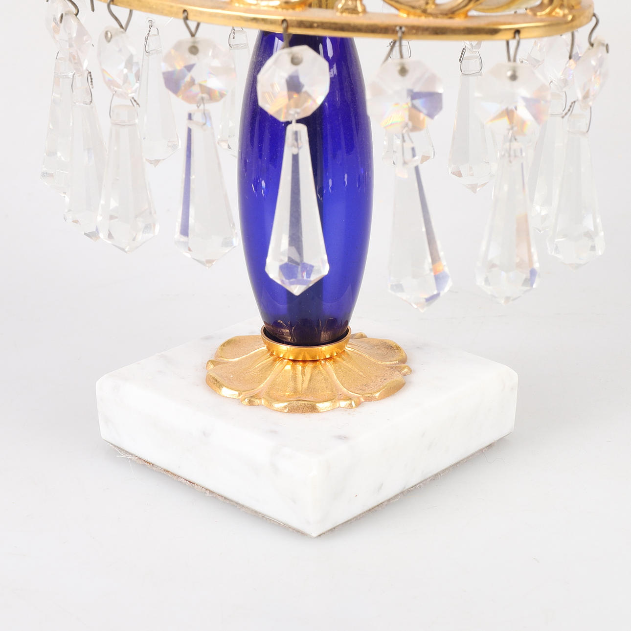 Stomme i förgylld mässing, sockel i vit marmor, detaljer i blått glas, höjd 38 cm, bredd 23 cm.
