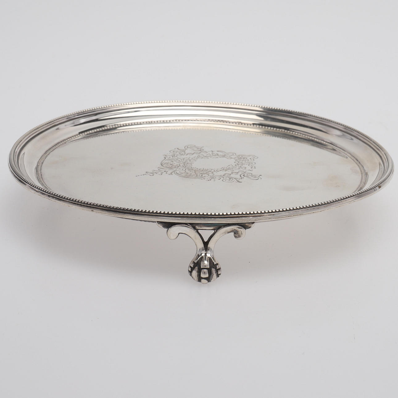 Silver med graverad dekor, stämplad Sheffield 1875, diameter 20,5 cm, vikt 368 gram.