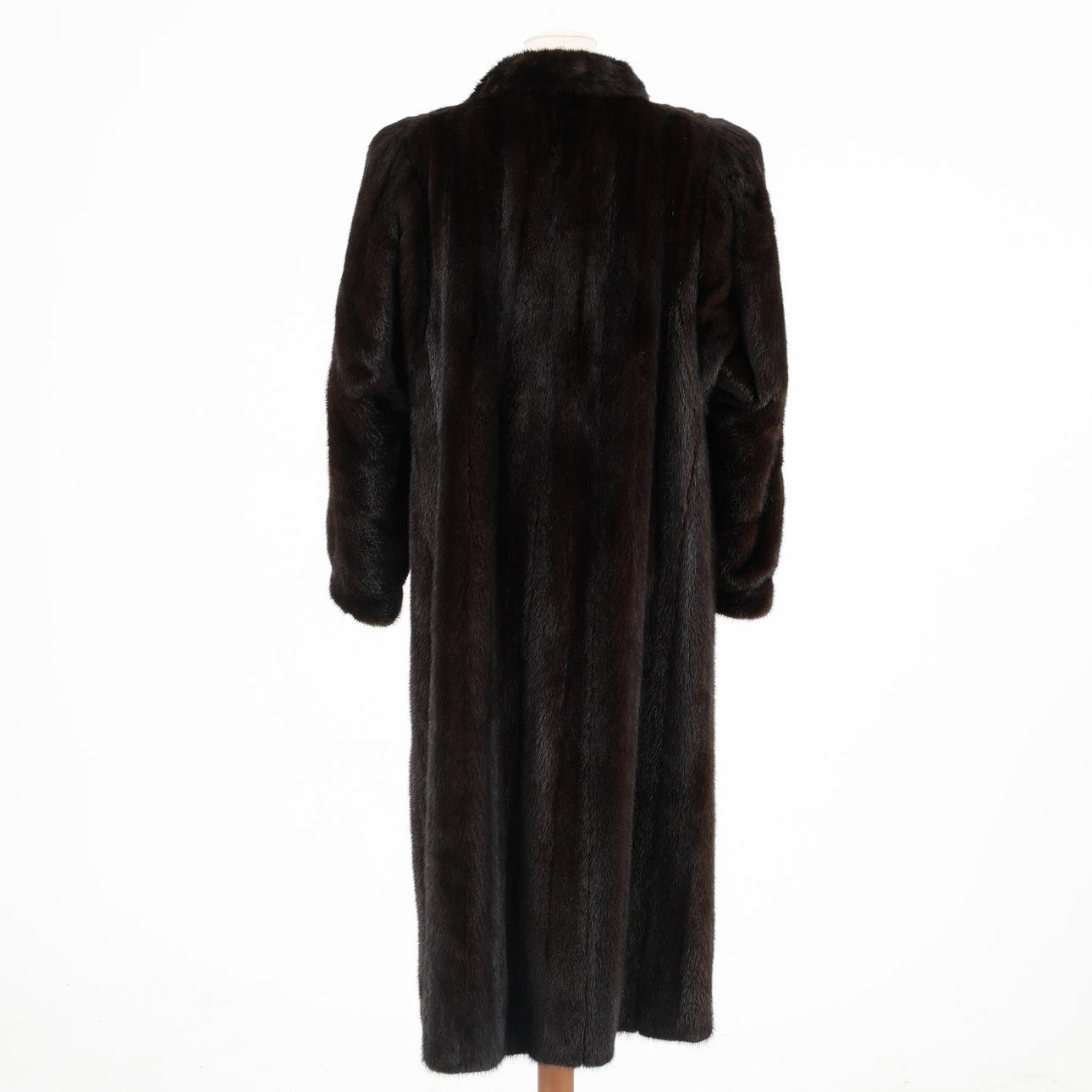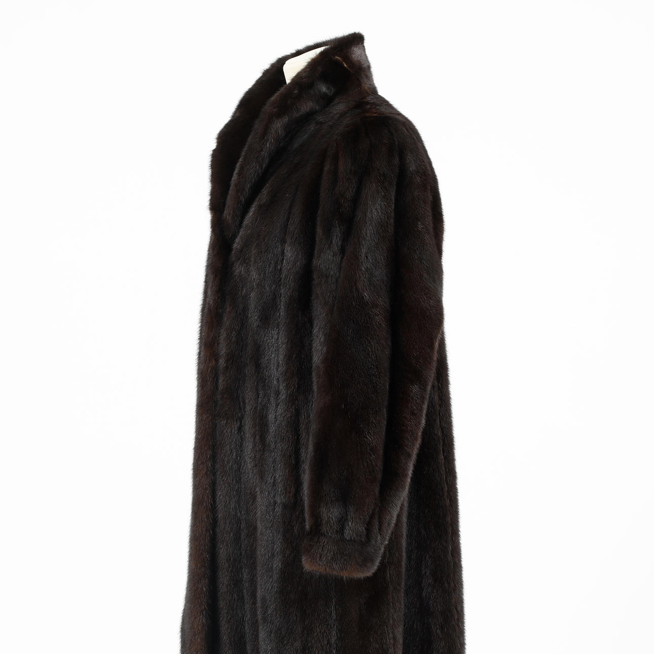 Brun minkpäls. Fastsättning med hakar, två sidofickor. Etikettmärkt "SAGAMINK" "Cassels modehus Kungsbacka".