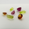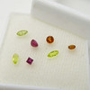 En samling av grön peridot, orange turmalin och röd rubin ädelstenar totalt 0,97 karat, boxed.