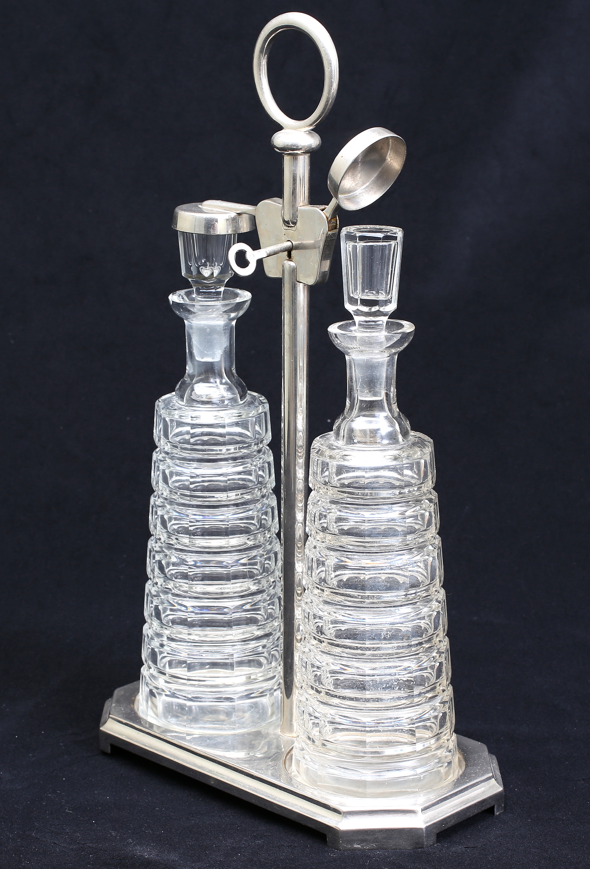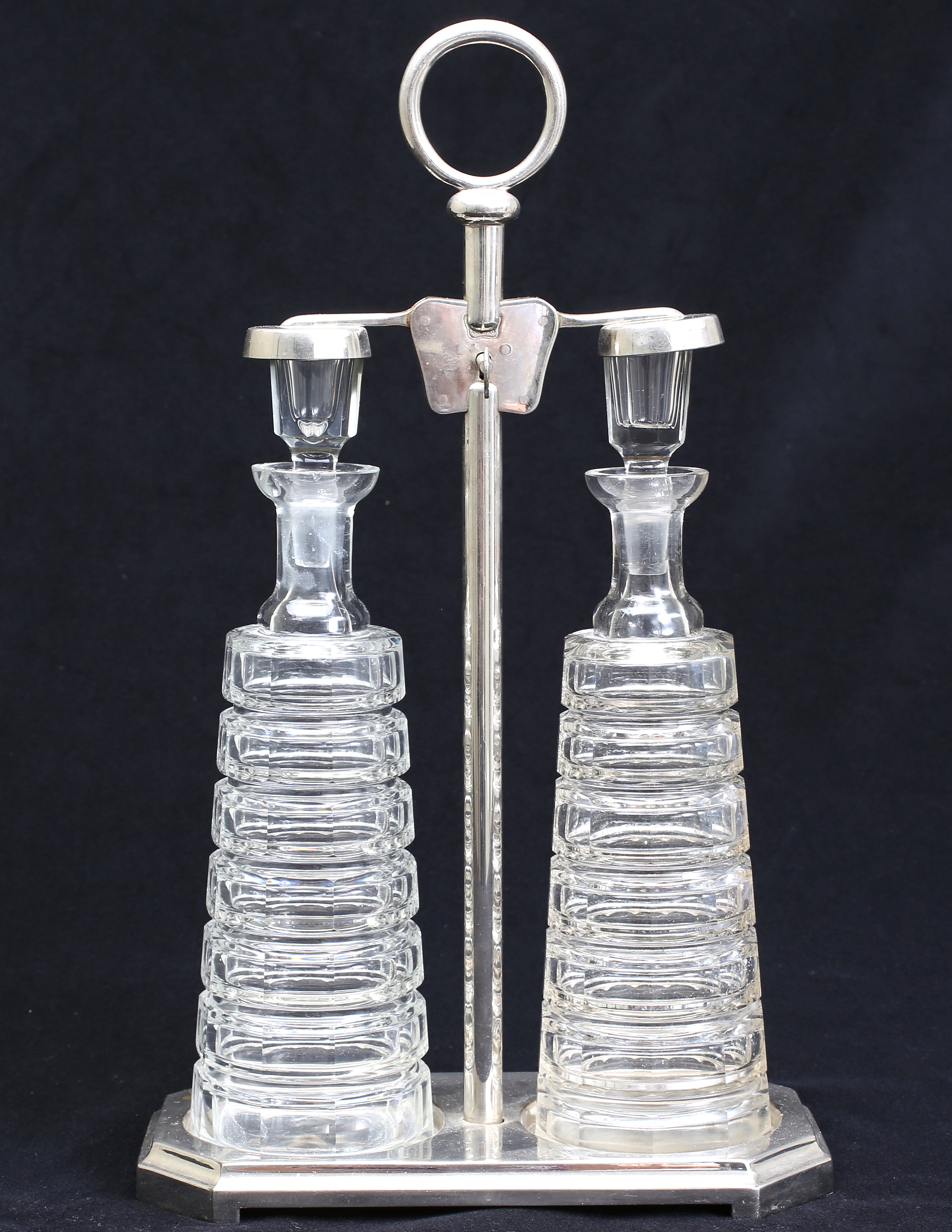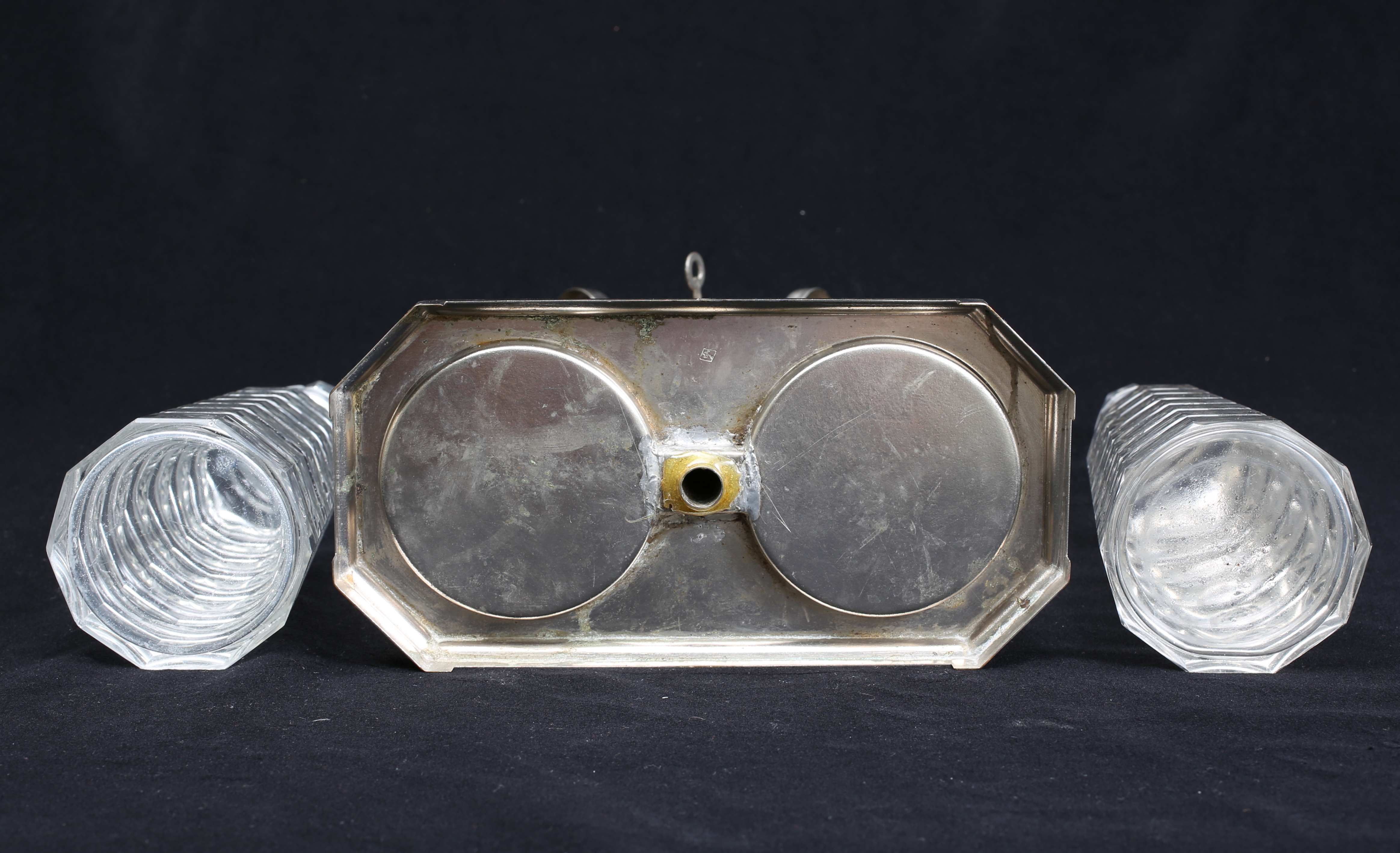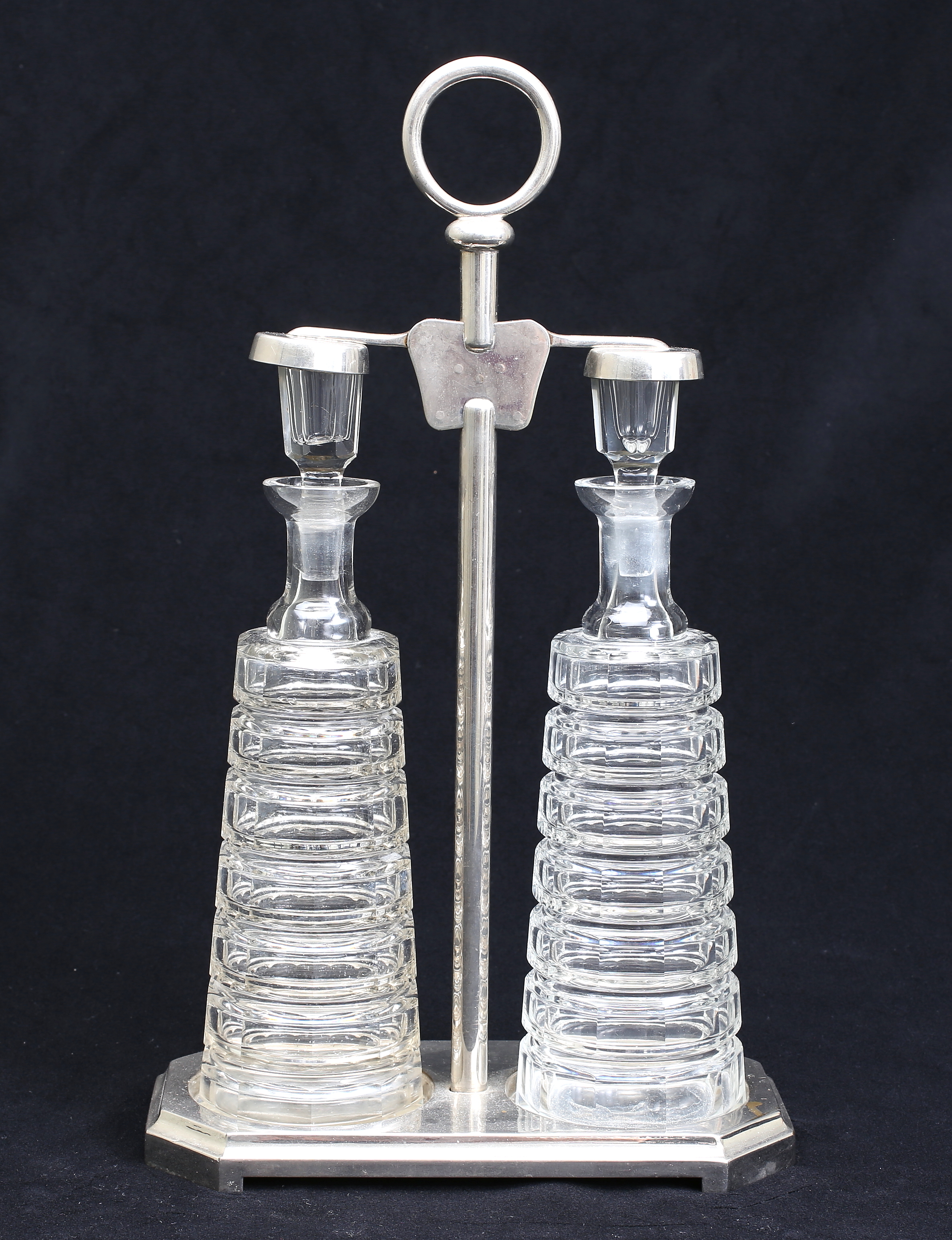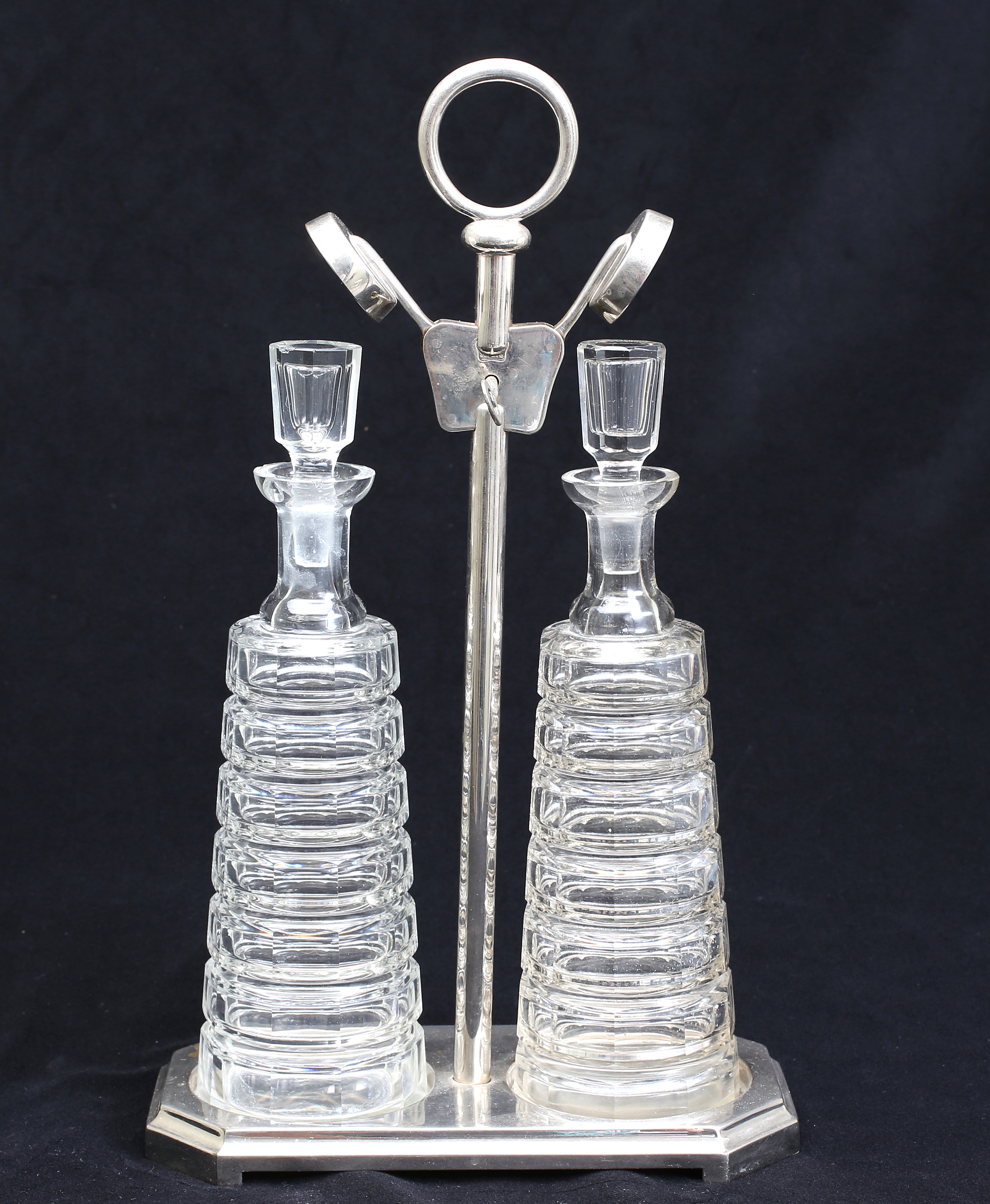 153073. FLASKSTÄLL, Nysilver, 2 flaskor, ca 1920-30 tal.