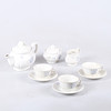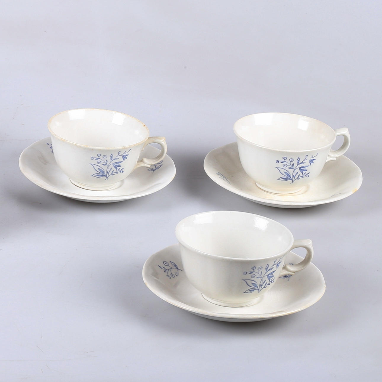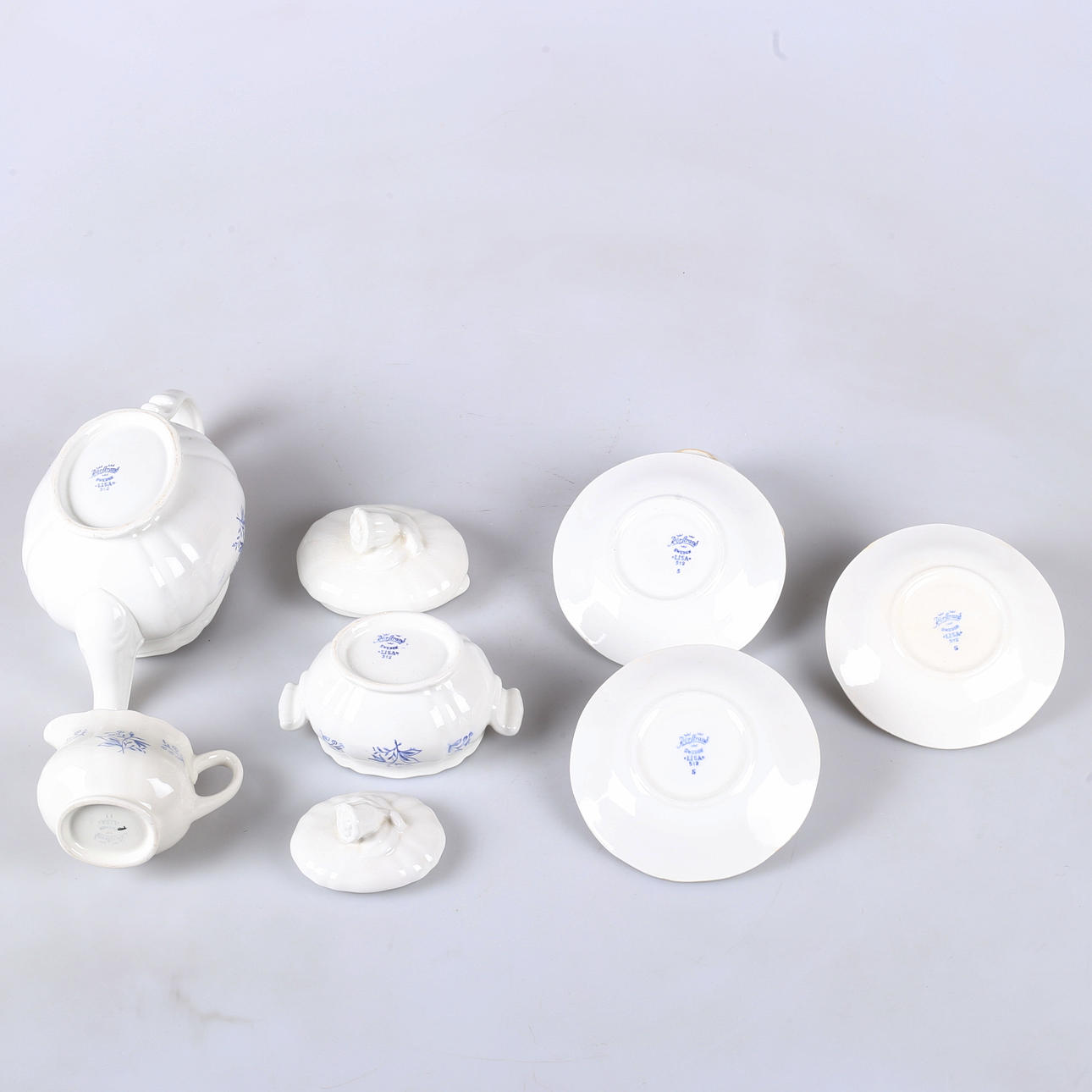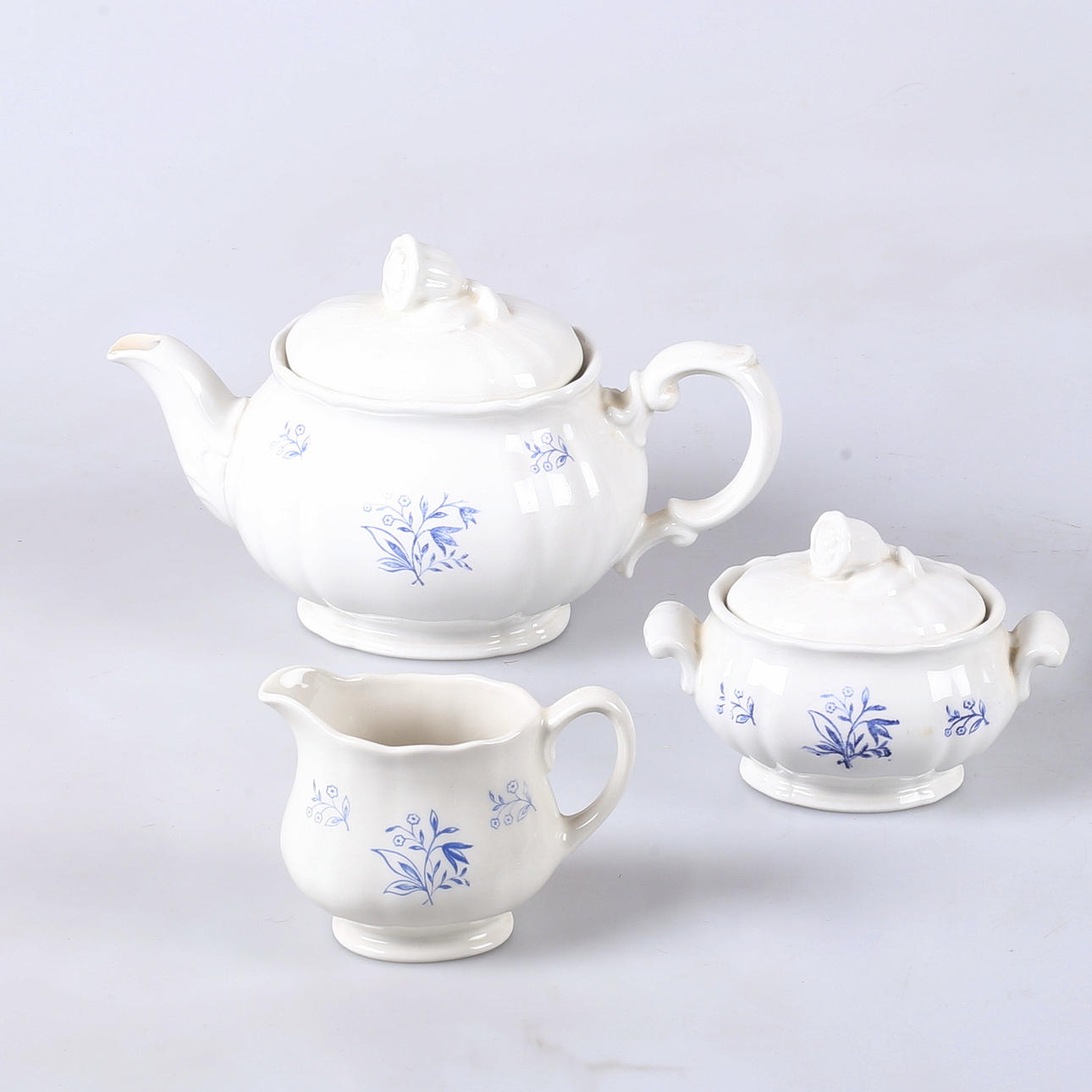 Flintgods med blå blomdekor. Tekanna, sockerskål med lock, mjölkkanna, 3 koppar med 3 underfat.