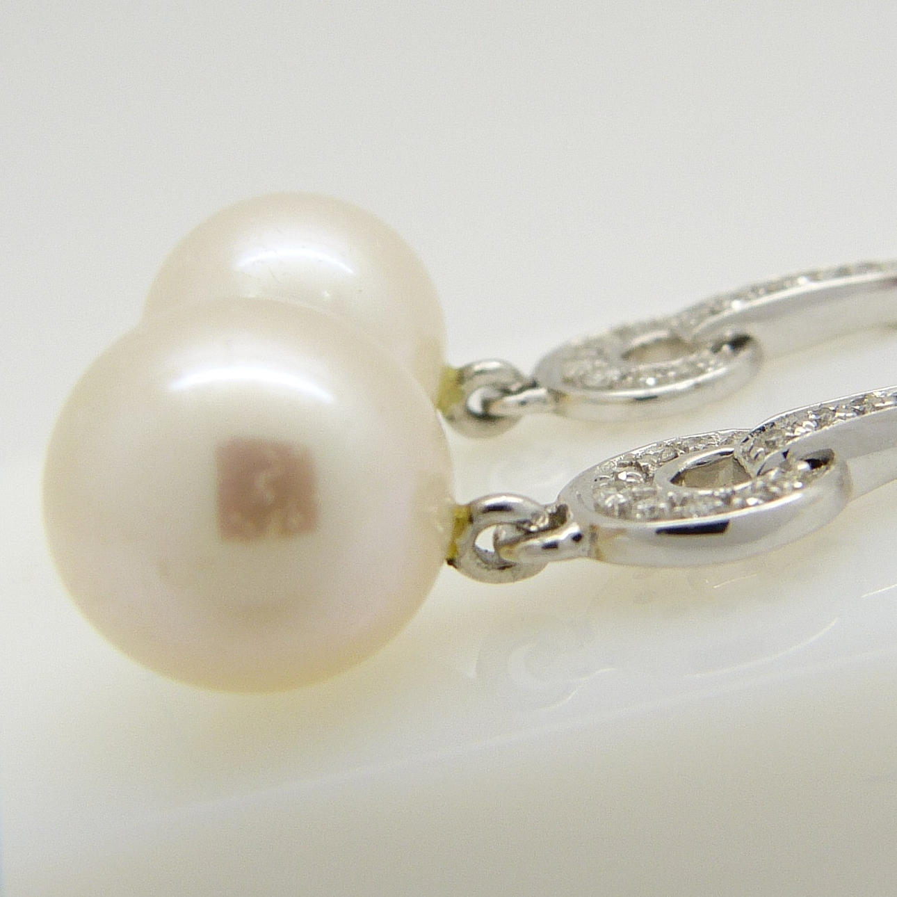 Ett par örhängen i Art Deco-stil 9k vitguld med odlade pärlor och diamanter, med fjärilsryggar.