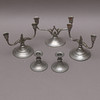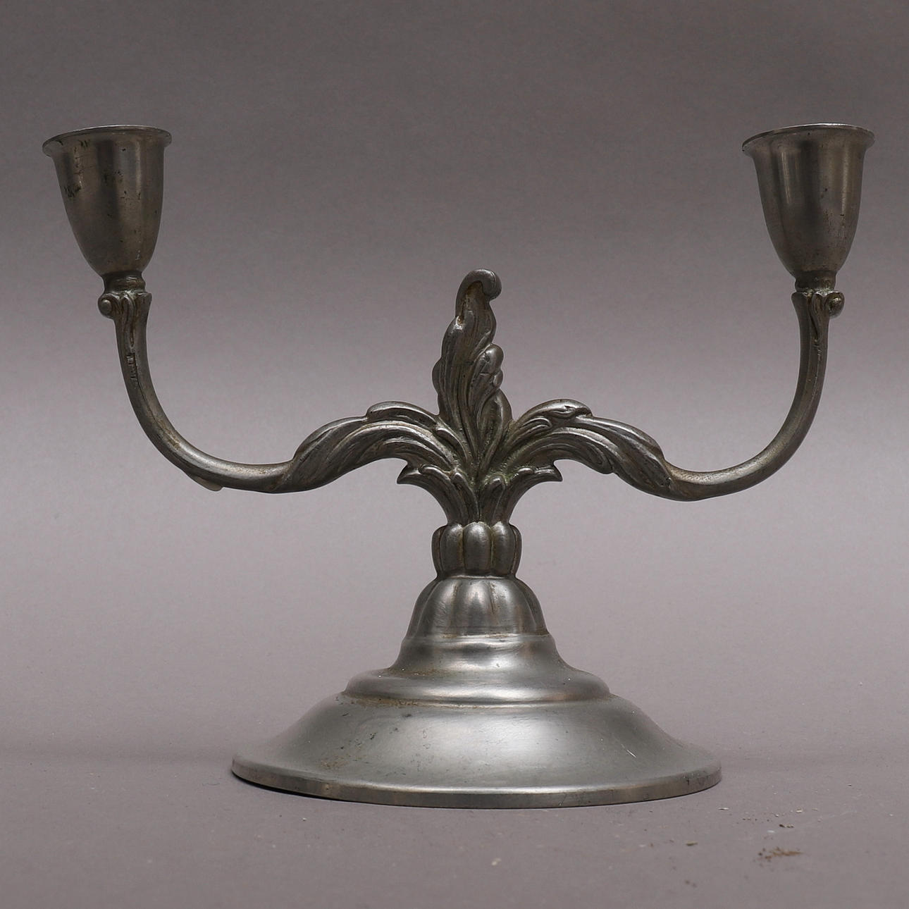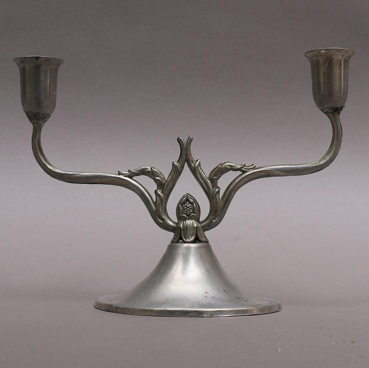Ett par ljusstakar, tvåarmade, stämplade Modern metallkonst Svenskt tenn, H8 (1934), ca 18.5 cm breda.
