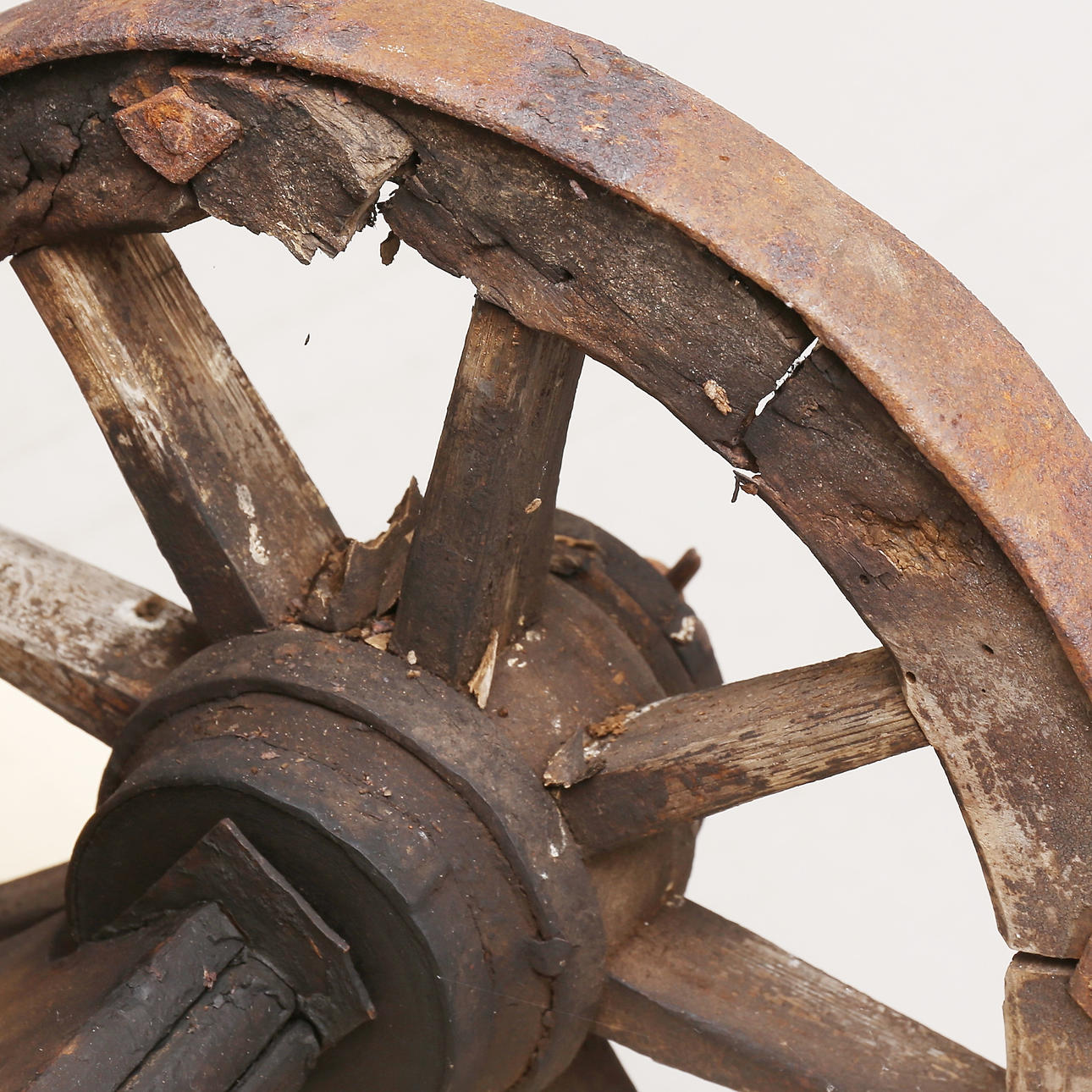 Åldersslitage, träet delvis murket, rostangrepp.