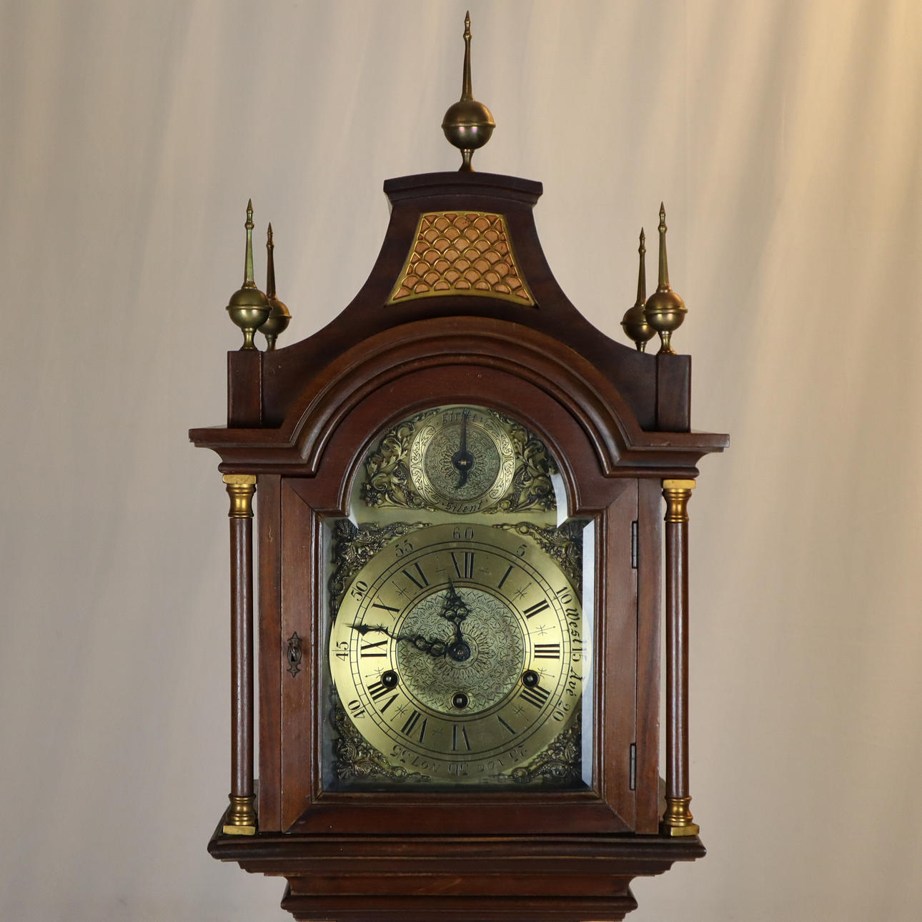 rektangulär träkropp, rund kolonn dekoration med versaler, med lockigt pediment, glaserade, arkitektoniskt strukturerad topp, metall urtavla med svarta romerska siffror och arabiska minut bitar, urtavla märkt”London”, omgiven av mässingstillämpningar, kvarts timmars slag på lera barer, klocka inställd ”Portugal Reguladora”, nyckel ingår, HxBxD: ca. 200x38.5x25 cm.