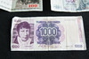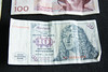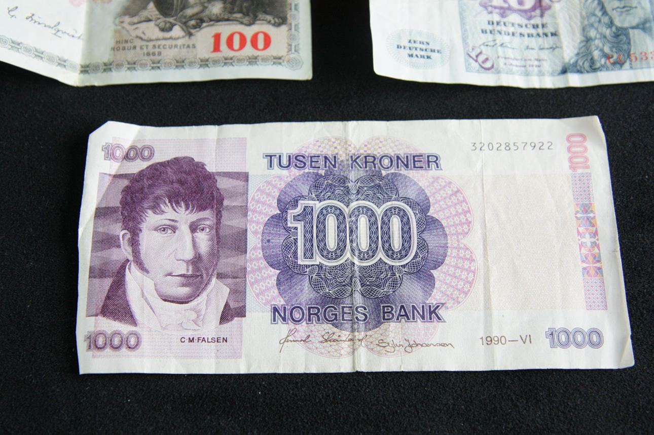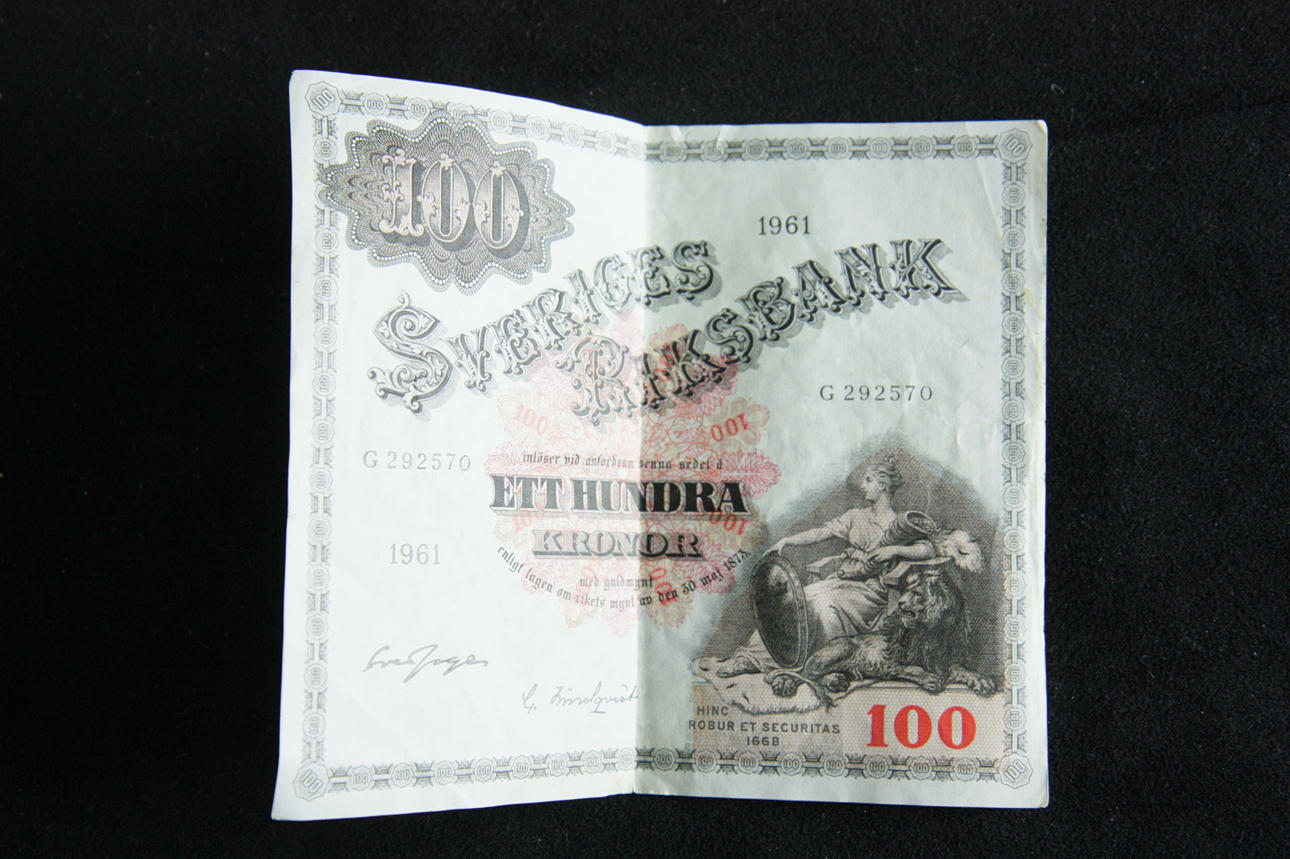 1 st tusen kroner, Norge, 1990 1 st hundre kroner, Norge, 1998 1 st zehn deutsche mark, Tyskland, 1970 1 st 100kr sedel, Sverige 1961.