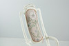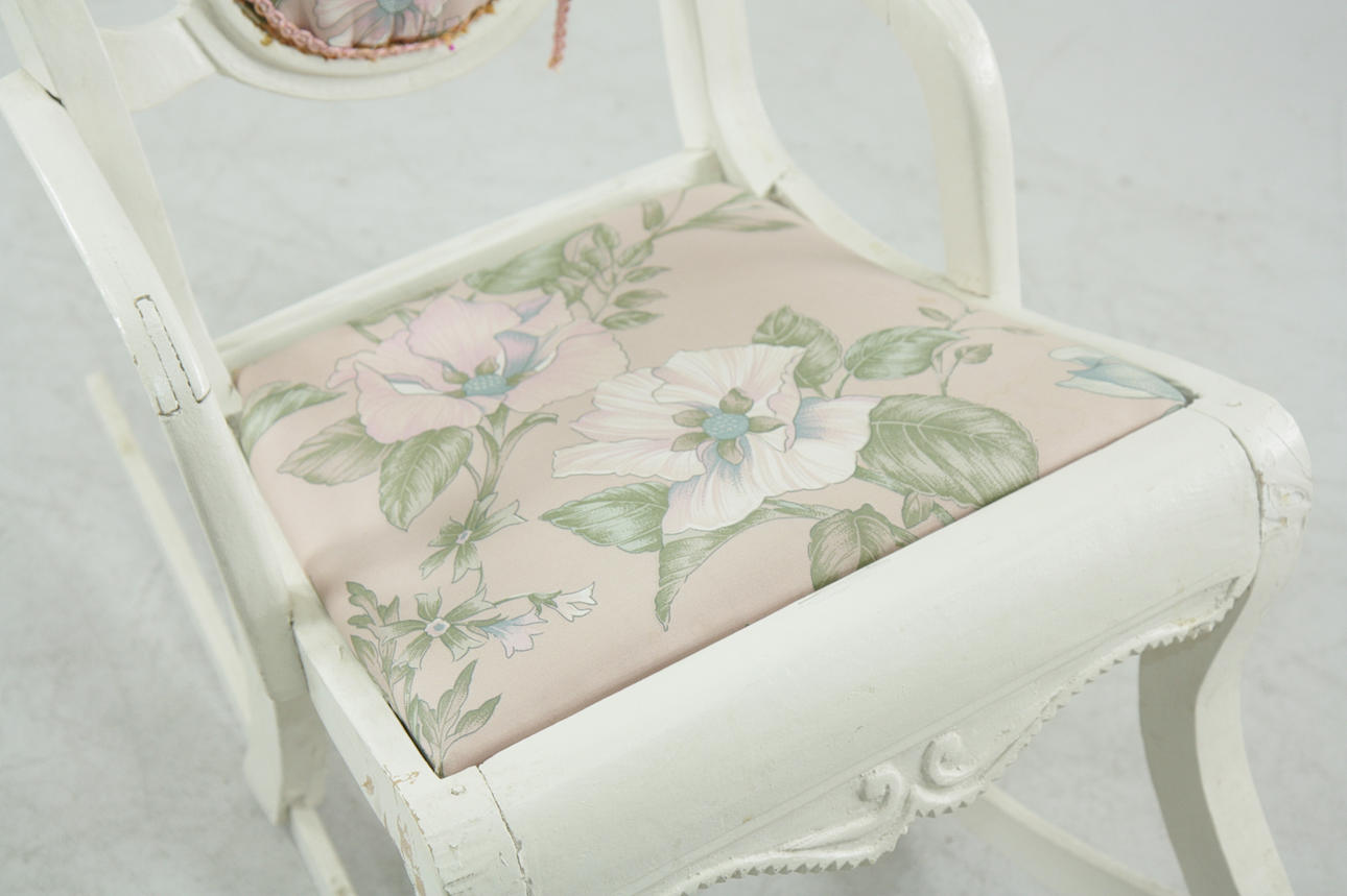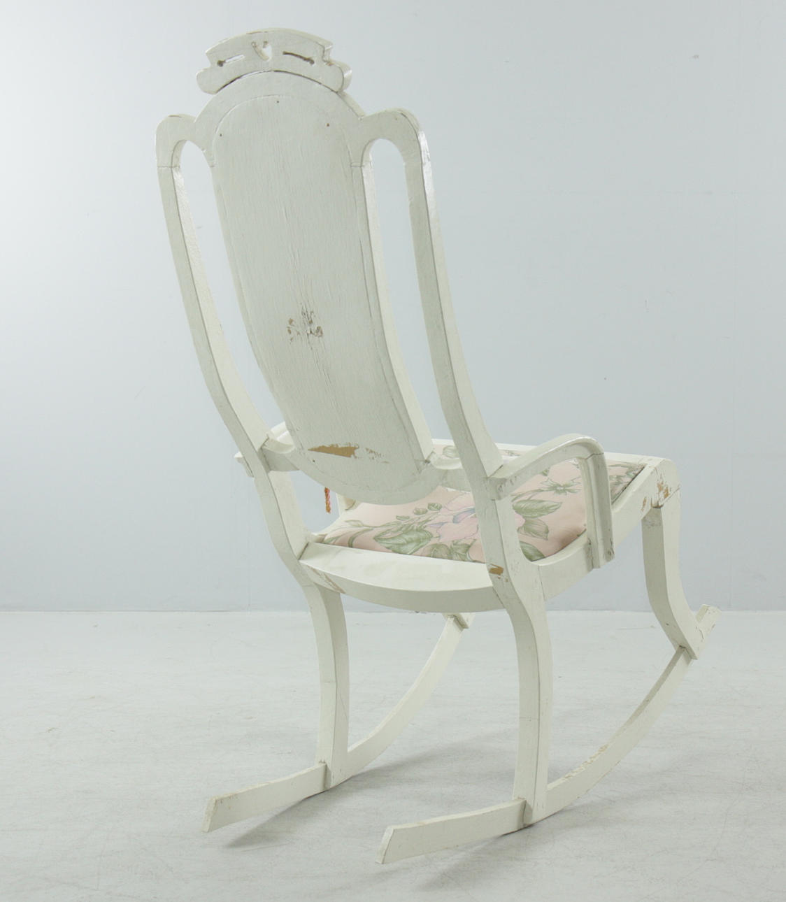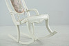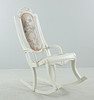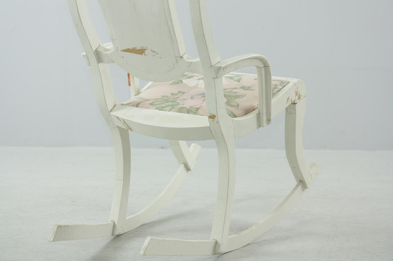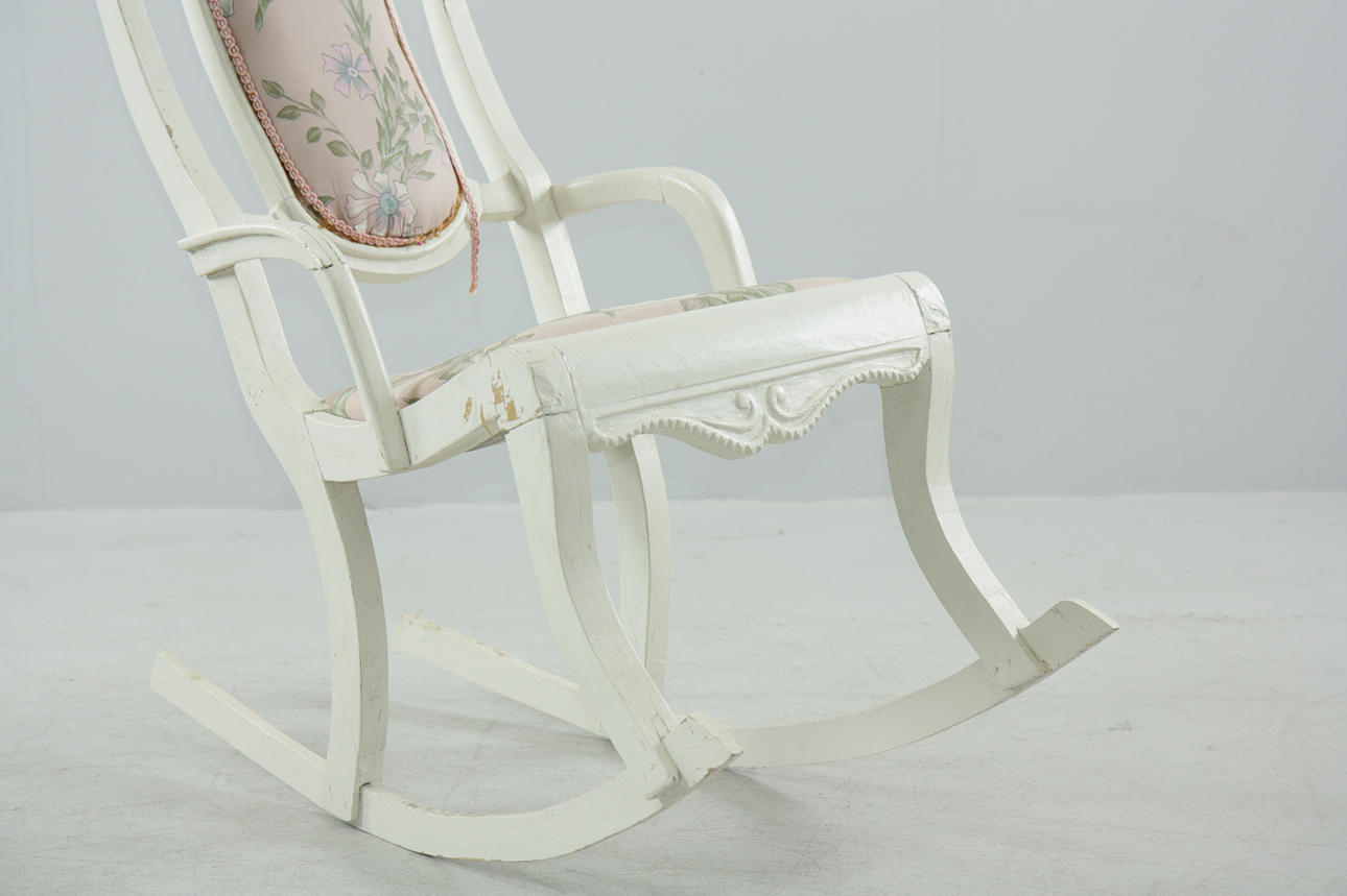 Målad gungstol i trä, fast stoppad klädsel i rygg och sits. Träpluggar som sammanfogar.