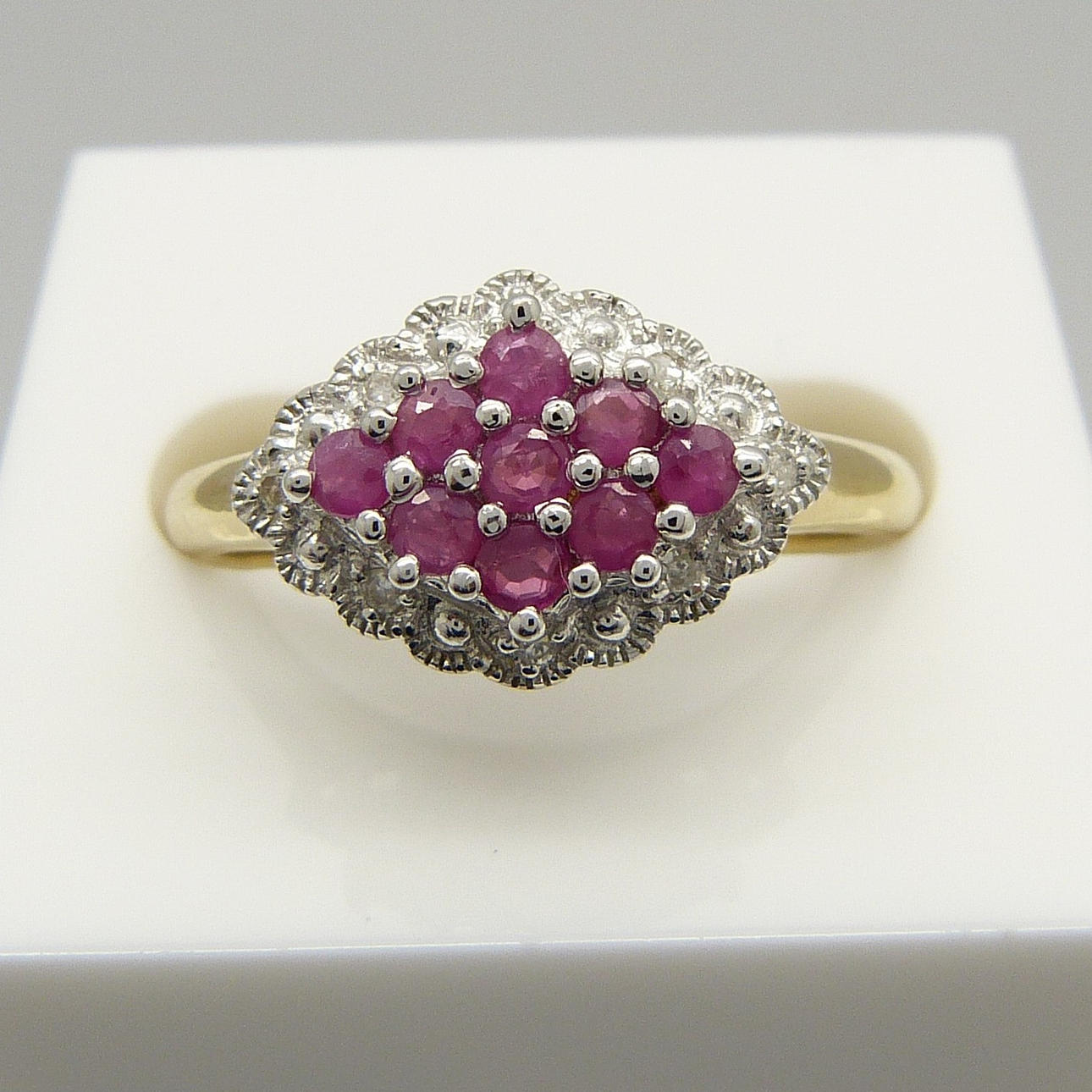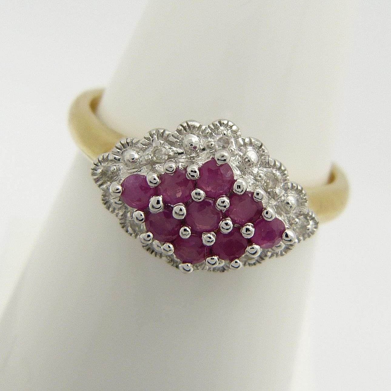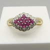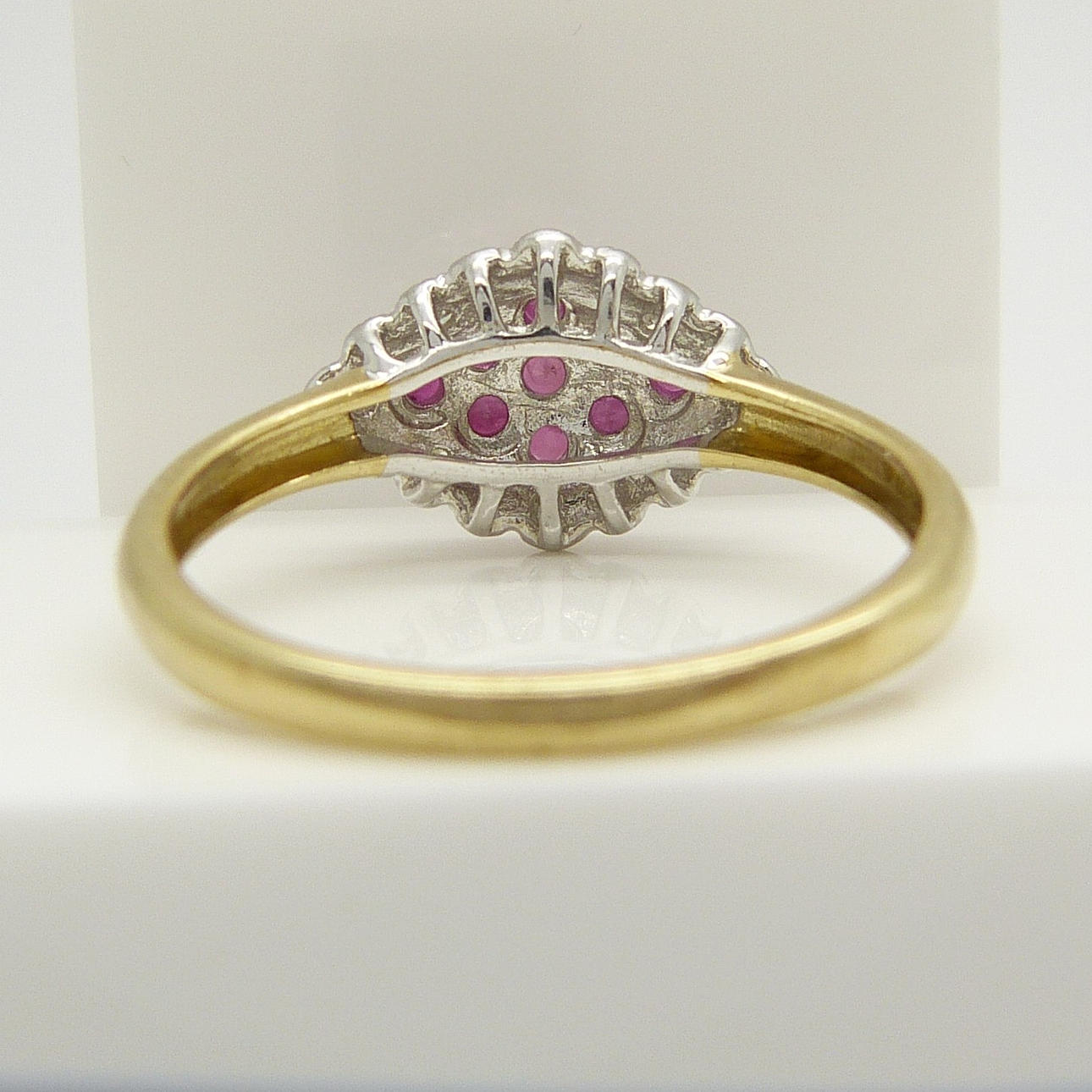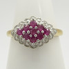 Klor-set i denna ring är 9 runda-cut röd rubin ädelstenar. Den totala karatvikten av rubinerna är 0.28ct ca.