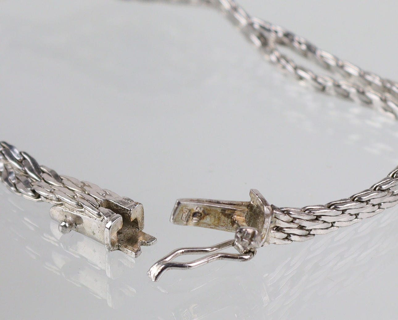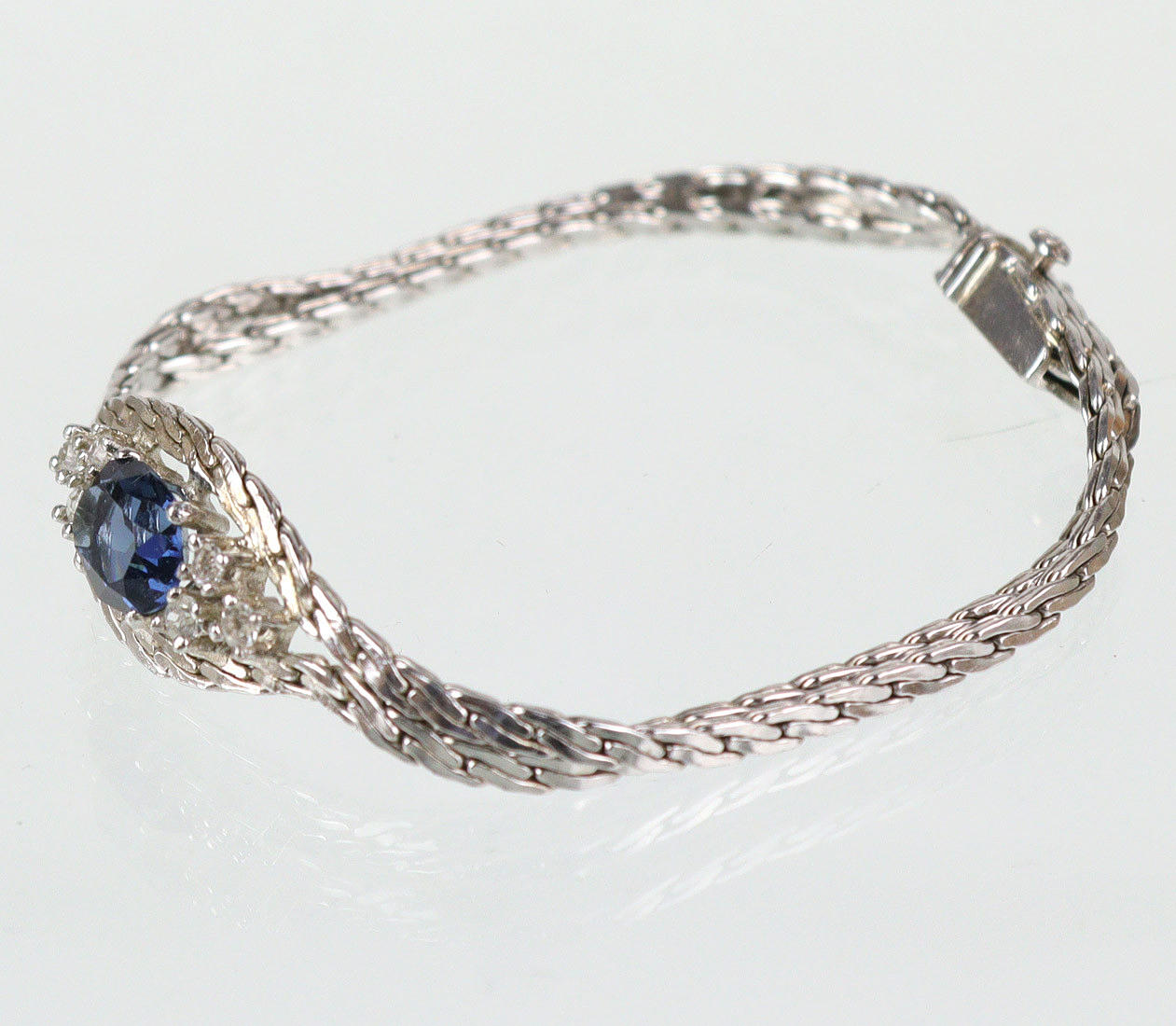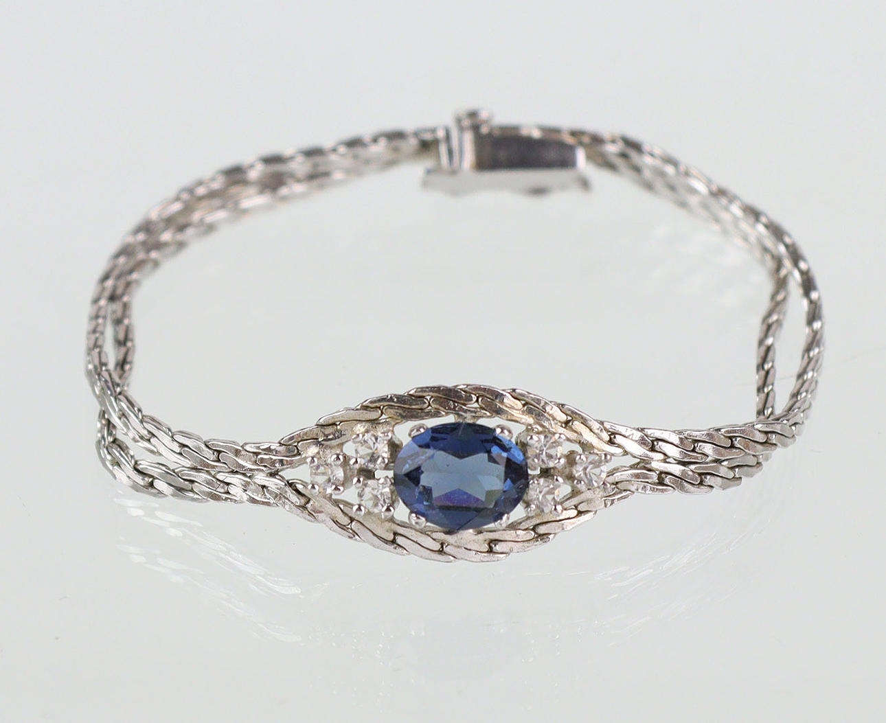 800 silverarmband, tvådelat armband centralt med safirblå sten, 3 zirkonier på vardera sida, spänne med säkerhetsförsegling, längd 18 cm, bredd i mitten 14 mm, sten 8 x 10 mm, vikt 13,55 gram.