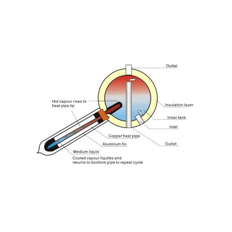 Ångan flyttar värmen via värmeledningsröret (heat pipe) och värmer på så vis vattnet i tanken.