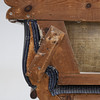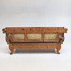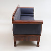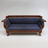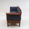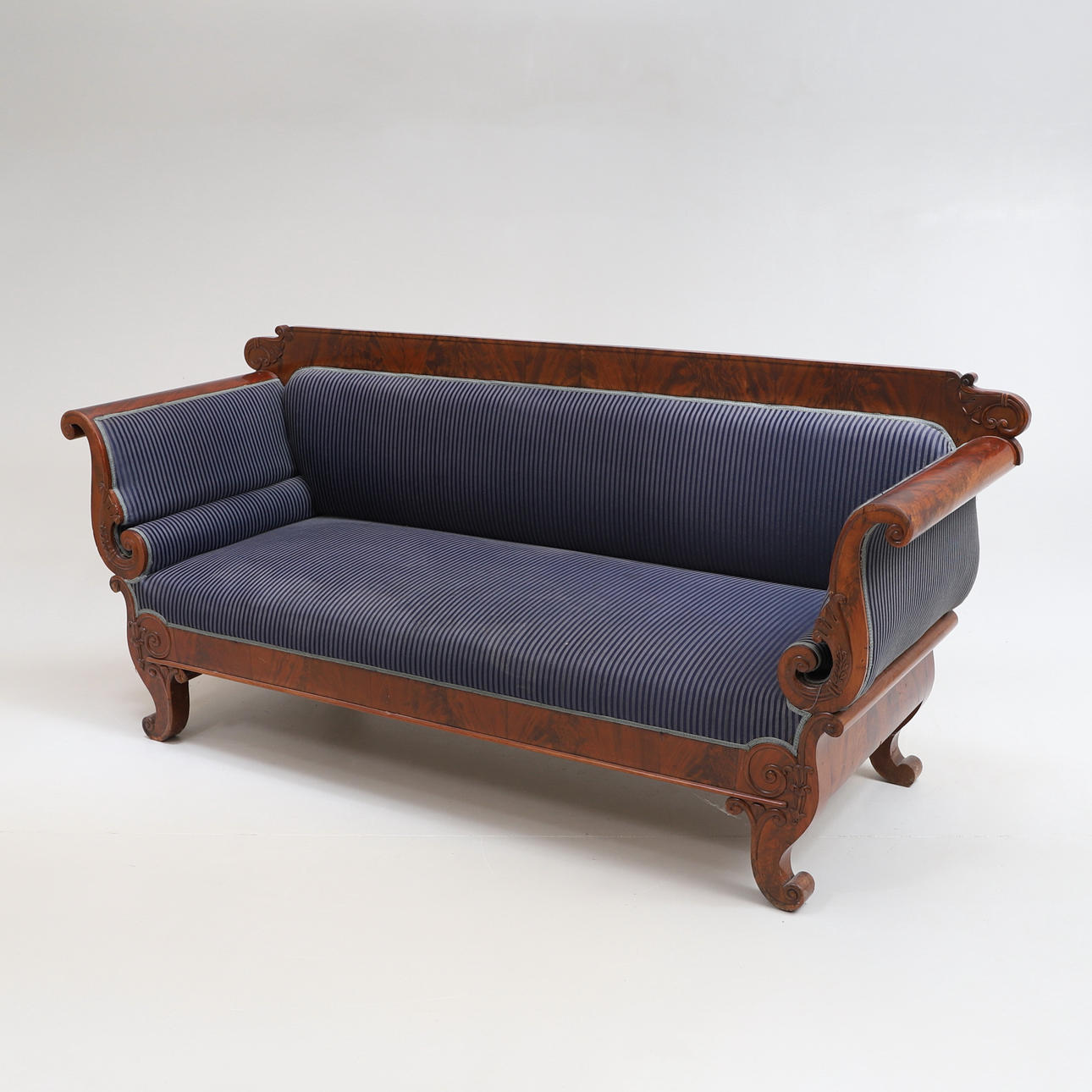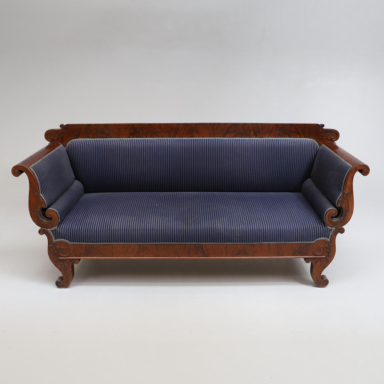 Fanerad med mahogny. Skuren dekor. Fast stoppad rygg och sits. Längd ca 225 cm.