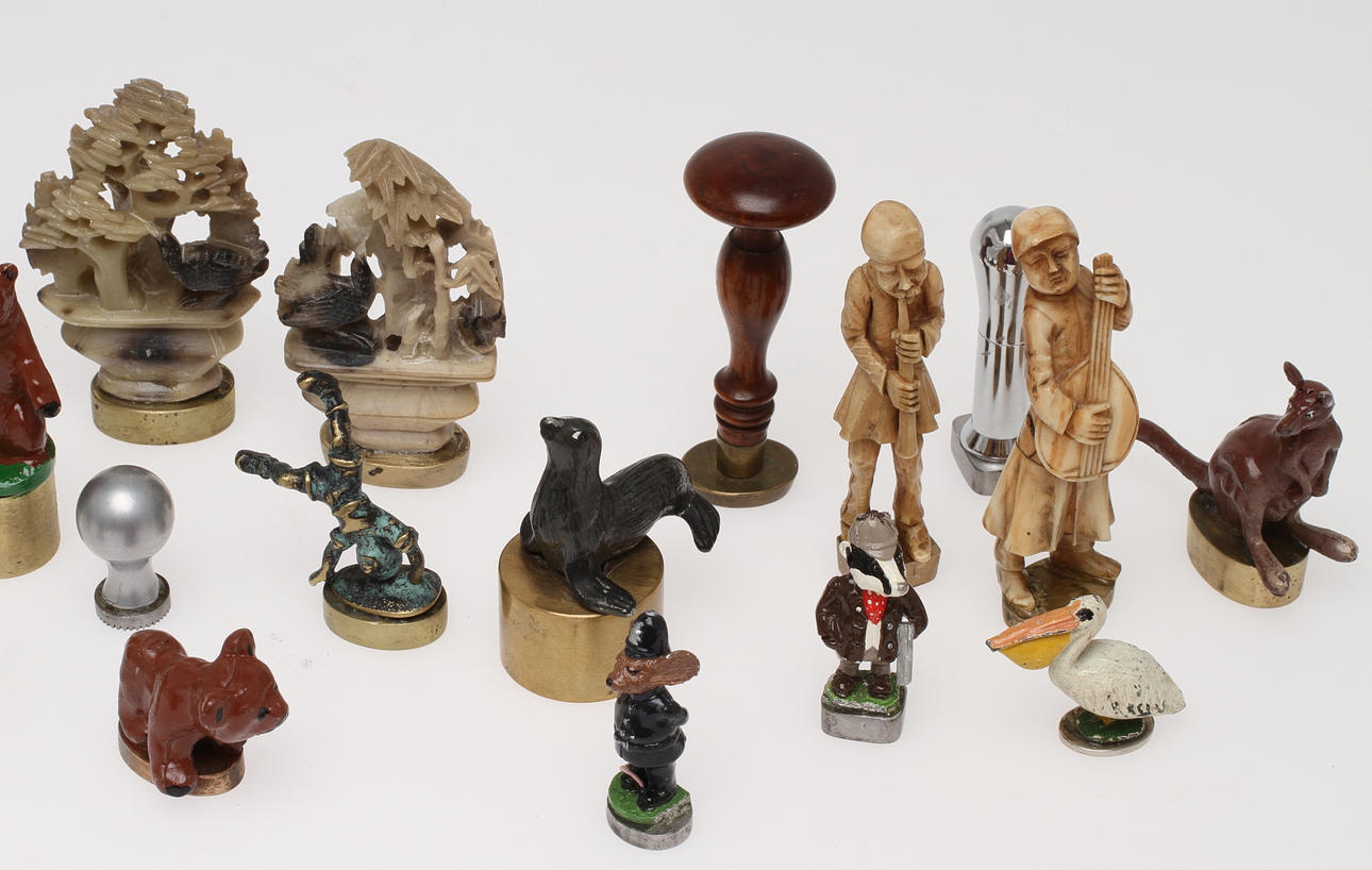 Bestående av bland annat sigill med stampar och sigill limmande på diverse figurer i olika material.