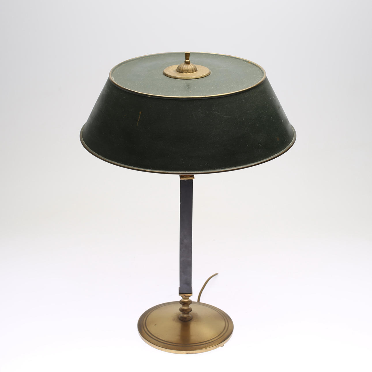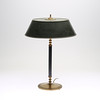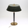 Stomme i mässing, skaft i svärtat trä. Skärm i målad mässing. Två ljuspunkter. Höjd ca 51 cm.
