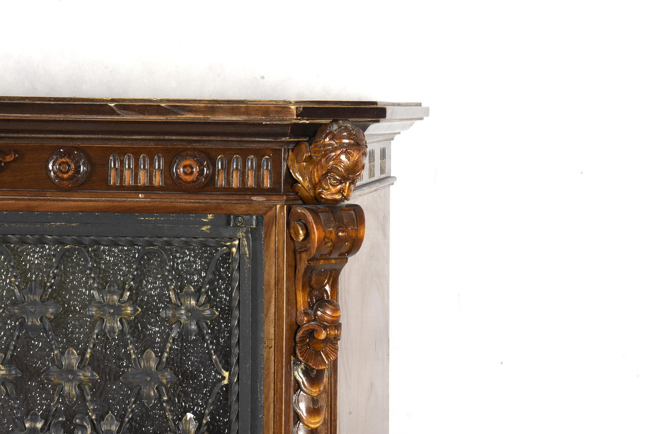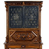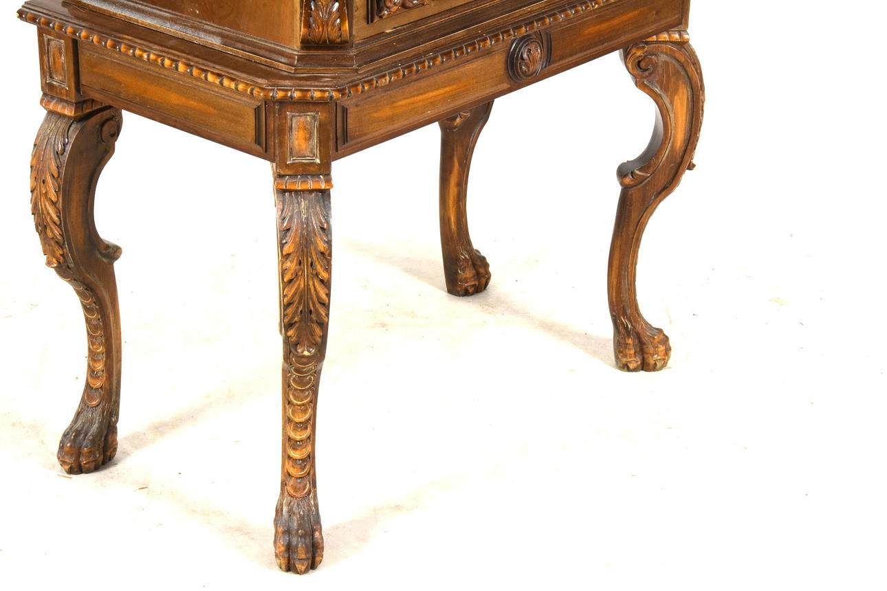 Rik dekor av bland annat maskaroner, blommor och blad. På böjda ben. Längd ca 90, djup ca 52, höjd ca 167 cm.