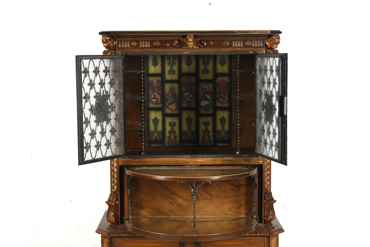 Skåp på benställning. Glasat dörrpar med ramande spröjs i metall. Under dessa, en utsvängbar hylla i form av låda.