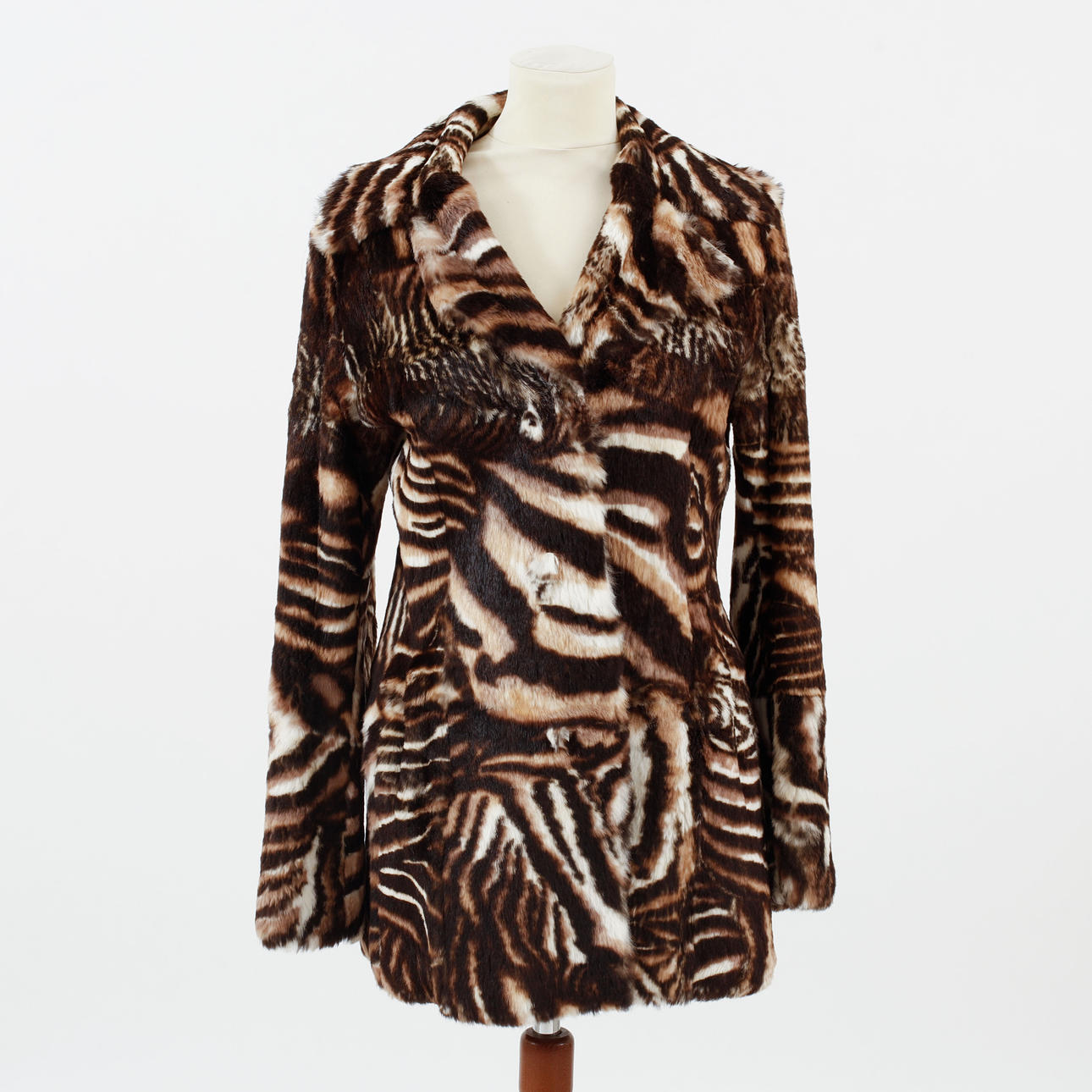 Vändbar päls med zebramotiv på en sida. Kort modell, knäppes med hyskor, två fickor. Storlek motsvarande svensk 36. Bystvidd ca 88, armlängd ca 60, rygglängd ca 75 cm. Liten i modellen.