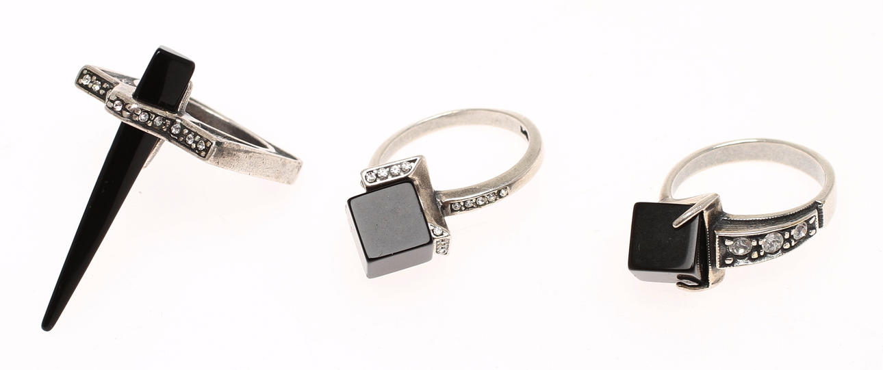 3 ringar i silver med svarta stenar.