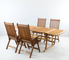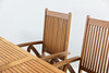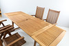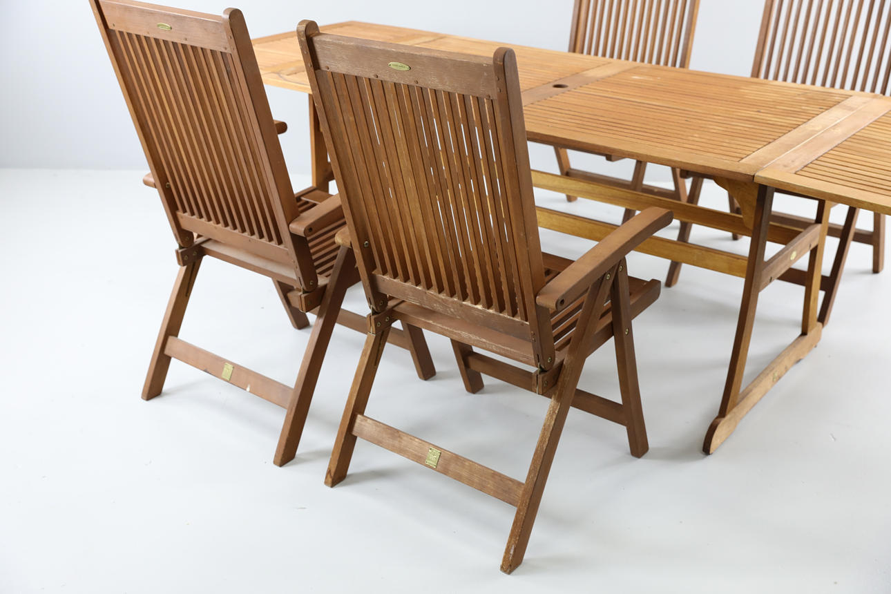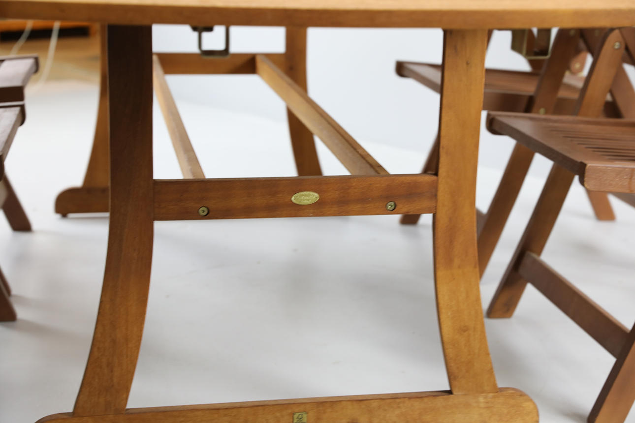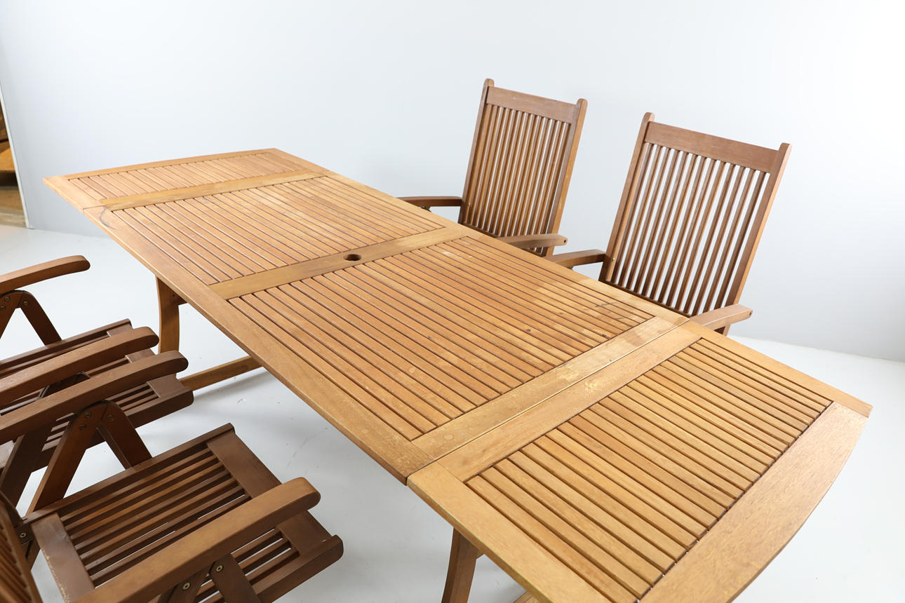 1 st bord med hål för parasoll, samt två lösa skivor att fästa på kortsidor för att kunna förlänga bordet. Höjd 75 cm, längd 150 cm, bredd 89 cm.