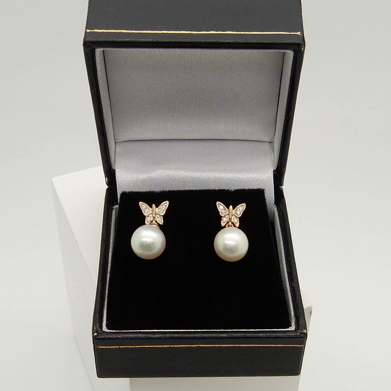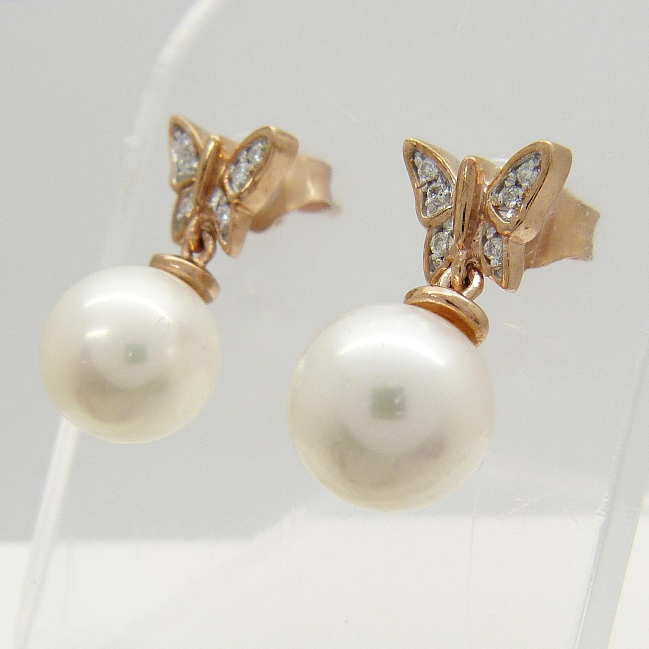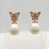 Ett par 9k roséguld fjäril designade odlade pärlor och diamanter örhängen med presentask.