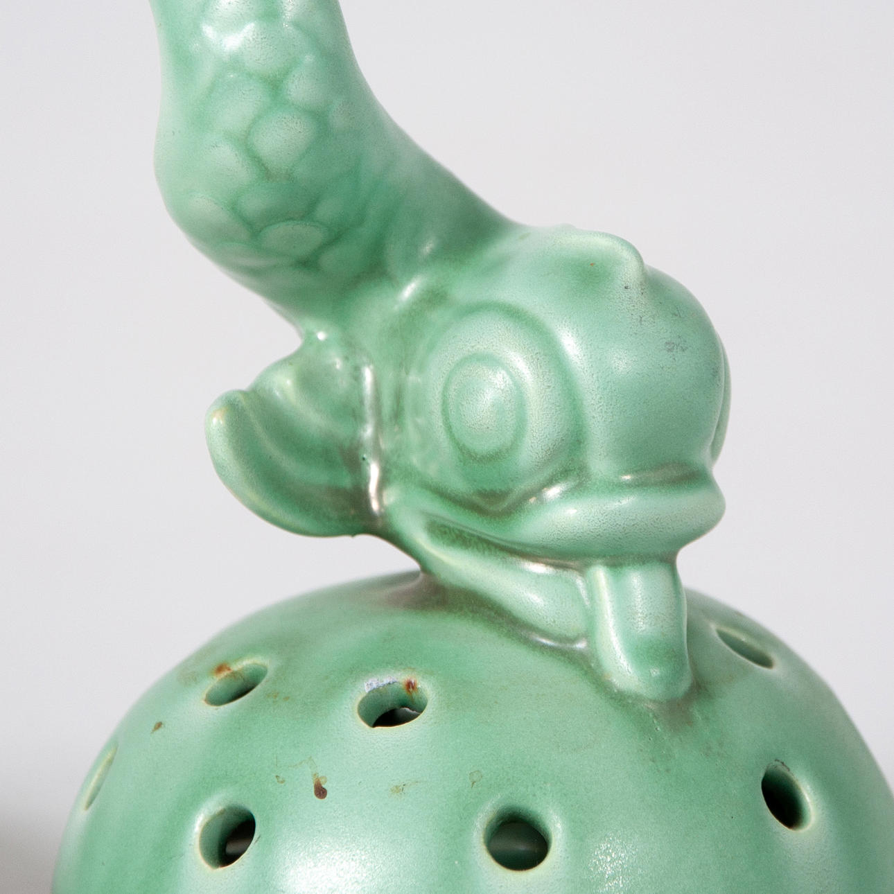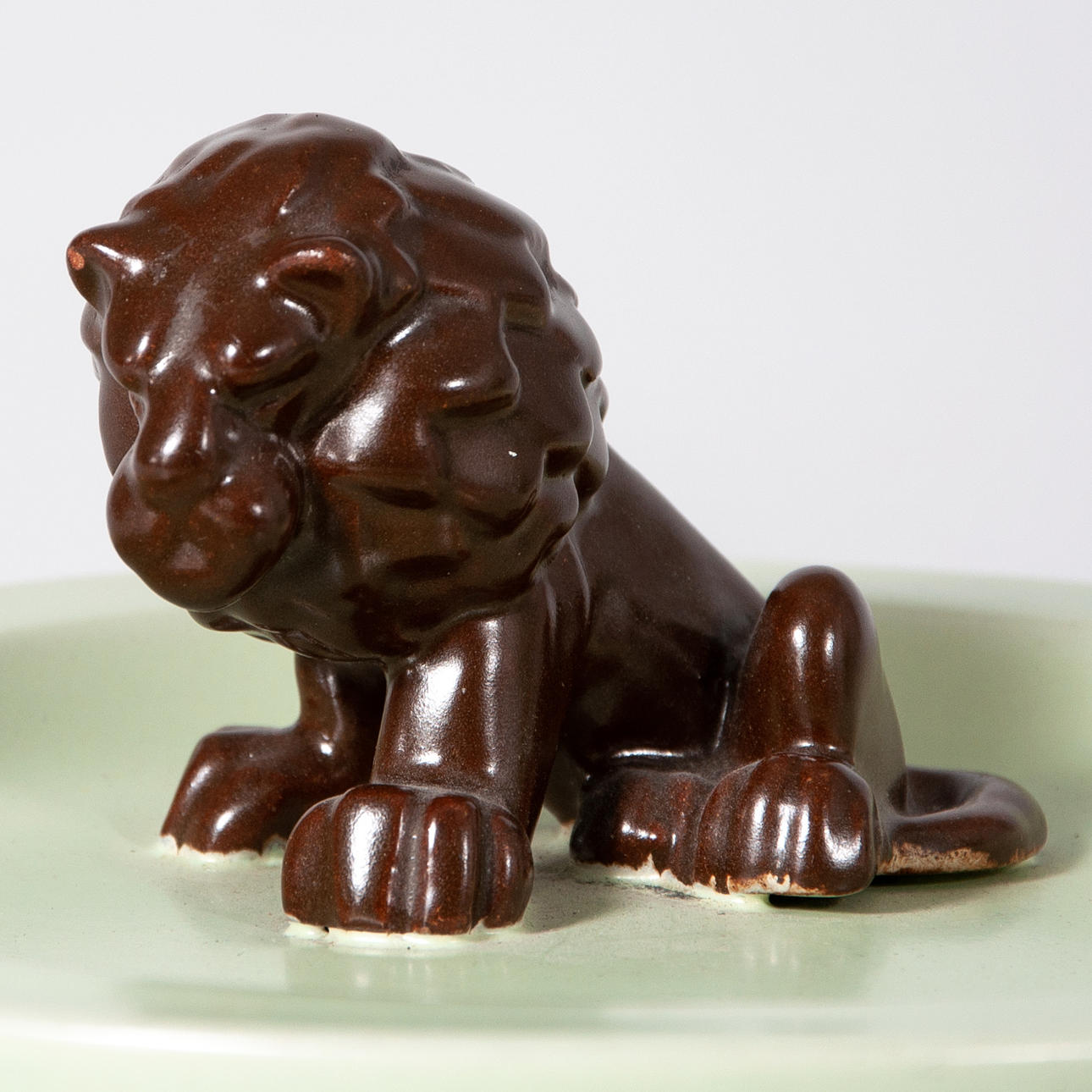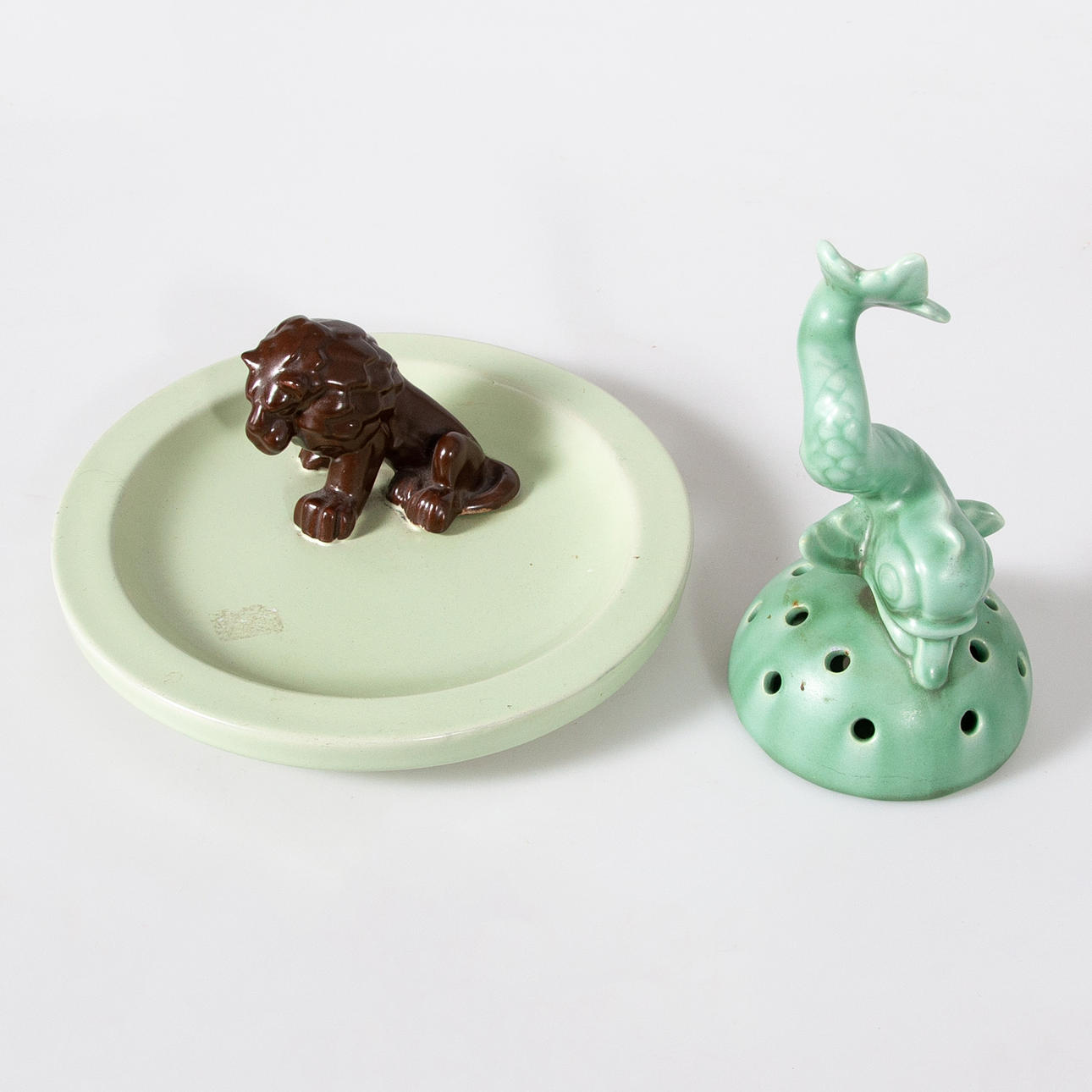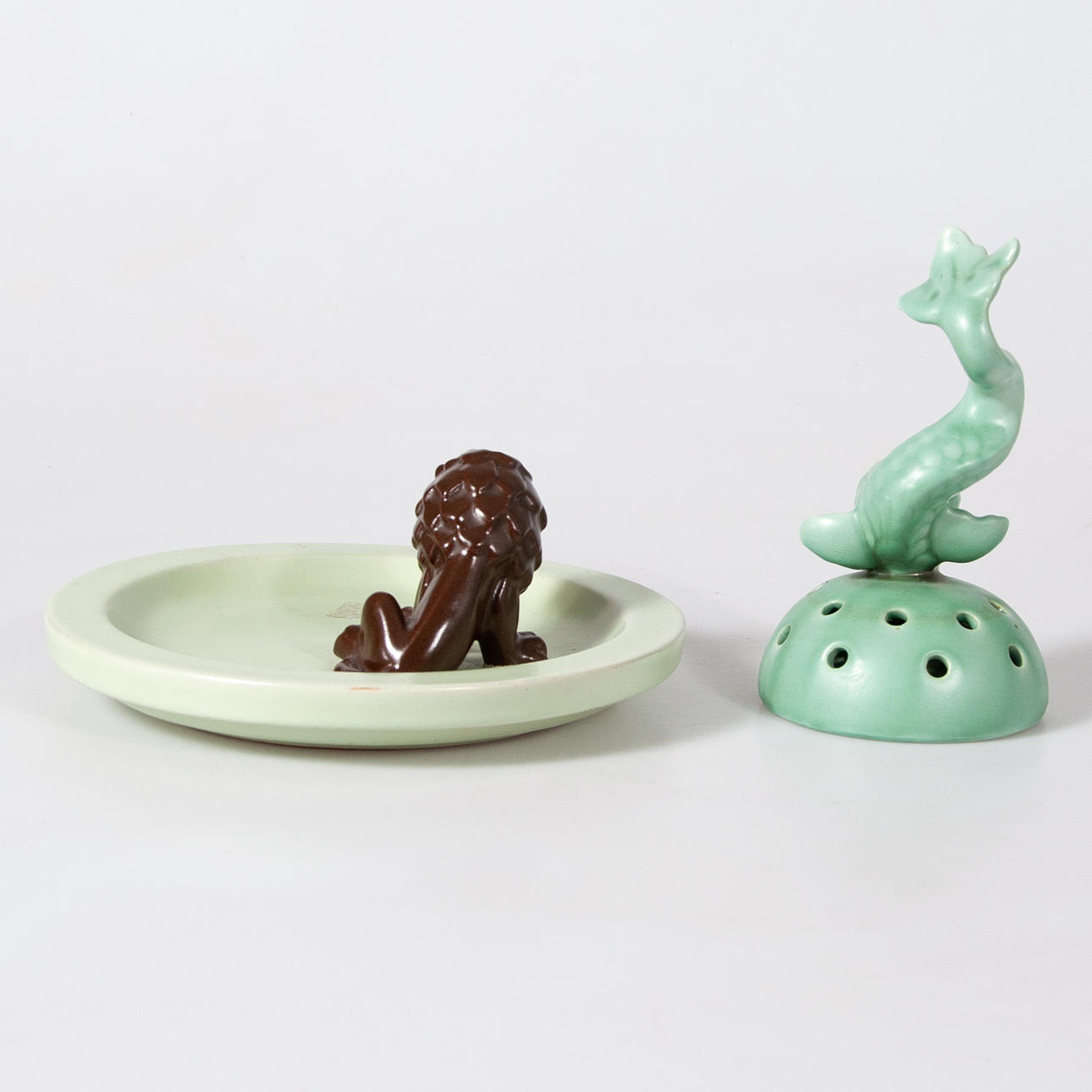 Blomsterhållare i grönt lergods, stämplad Gefle. Fat stämplat EKEBY, grön glasyr med ett lejon i brun glasyr.