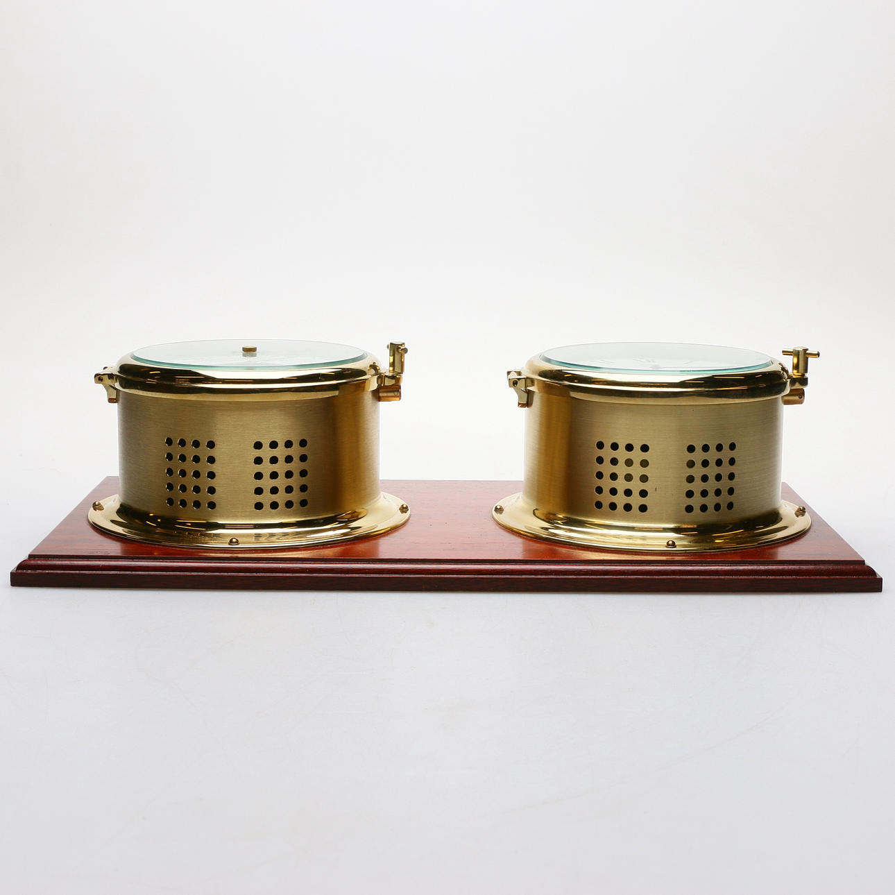 Skeppsklocka med glasslag, batteridrift. Diameter 13 cm vardera, platta längd ca 45 cm.