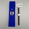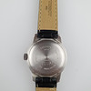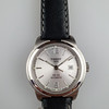 Rostfritt stål fallet, datum på ”3", svart läderband, diameter utan krona ca. 28 mm, med ask och garantihäfte, inköpsdatum 31.12.2001 Armband med smärre tecken på slitage.