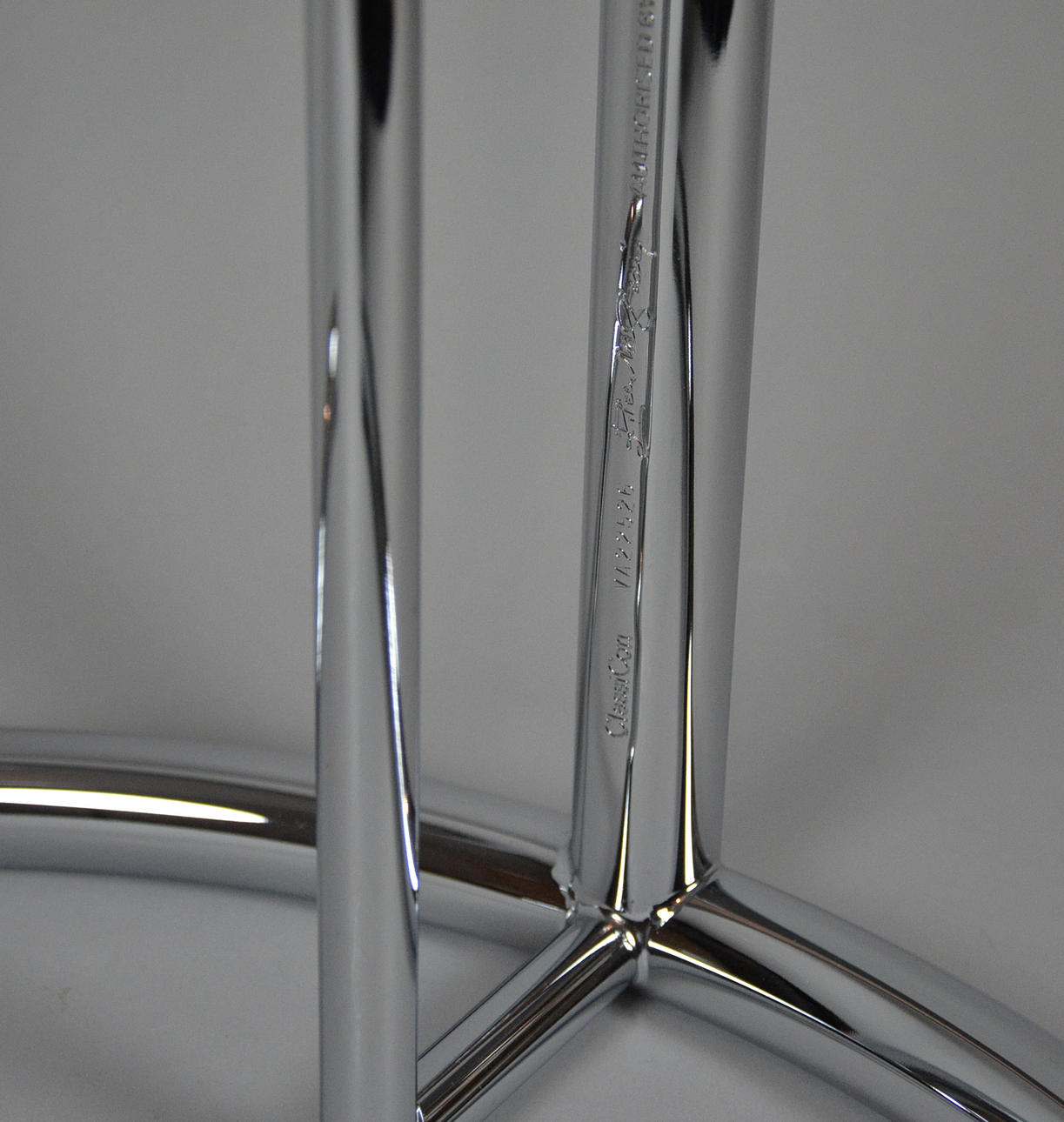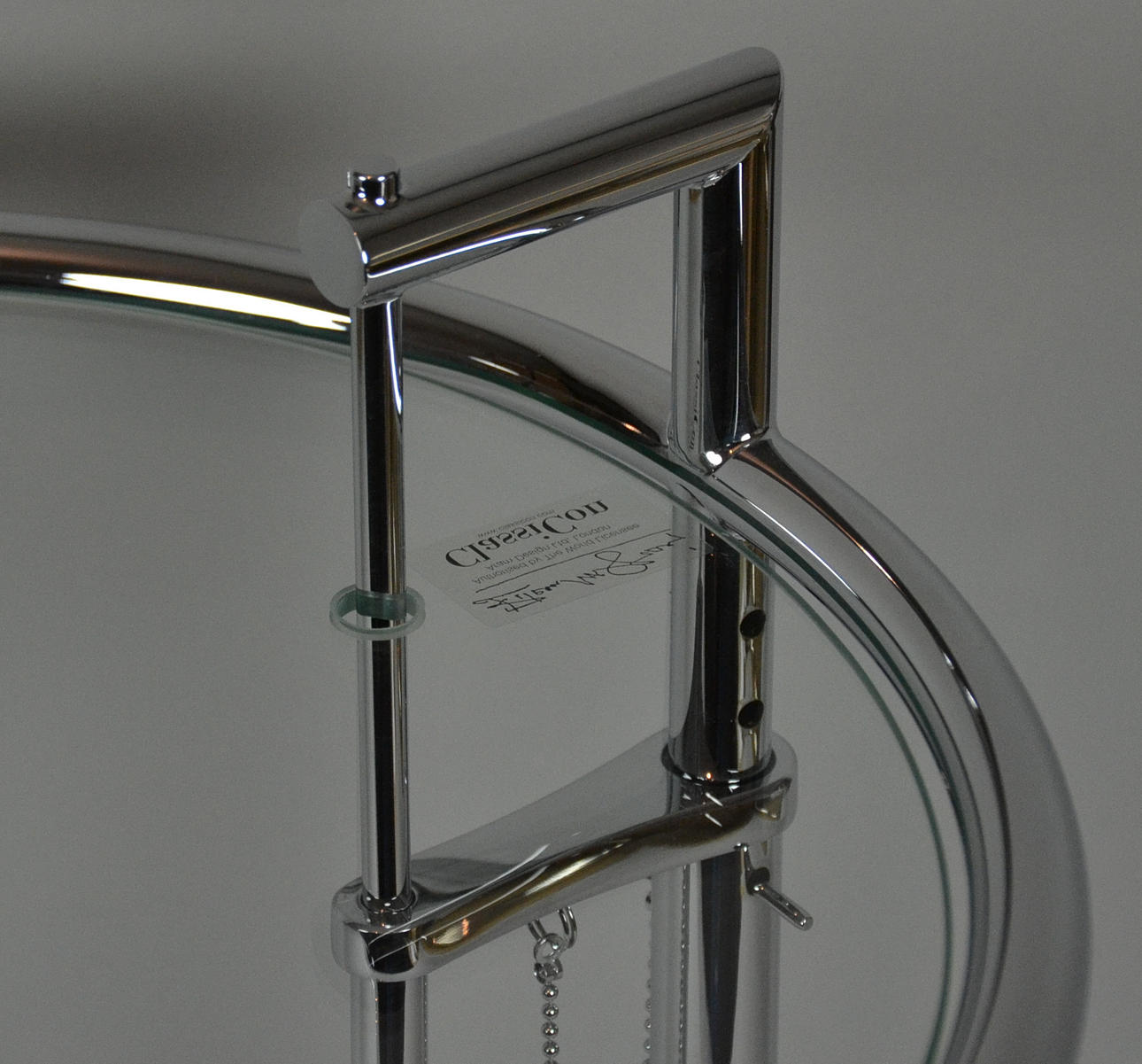 Förkromad metallram, glasskiva.