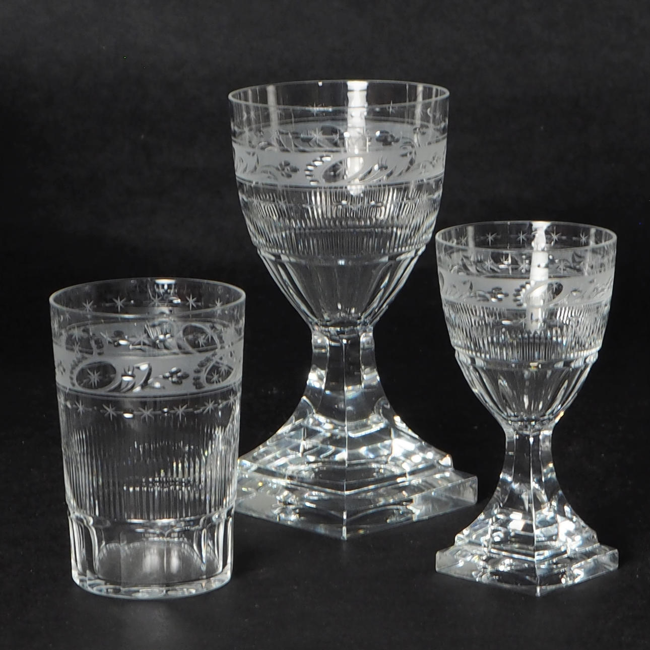 10 vinglas, höjd 13,5 cm 8 seltersglas, höjd 8,5 cm 8 starkvinsglas, höjd 10 cm.
