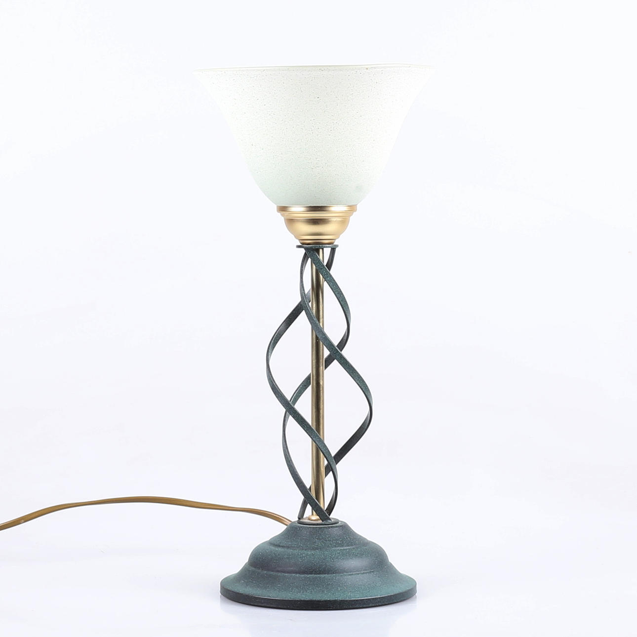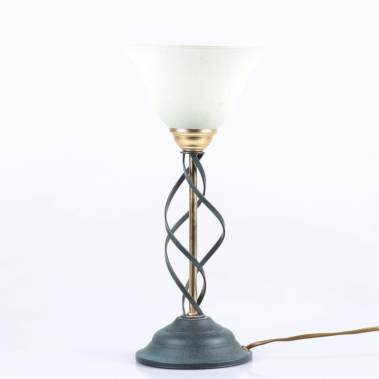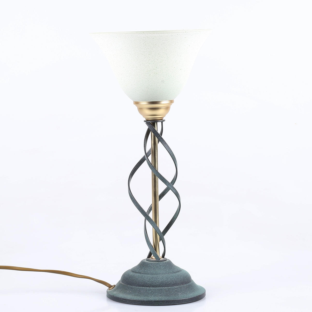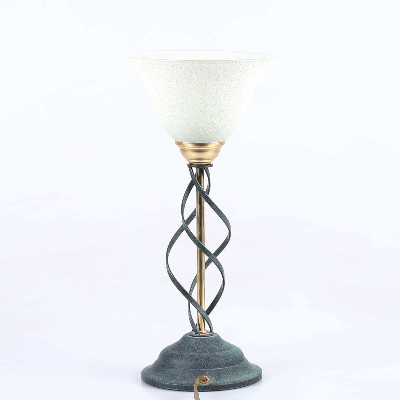 Grönpatinerad metall och mässingsfinish, klockad glaskupa, höjd 37 cm.
