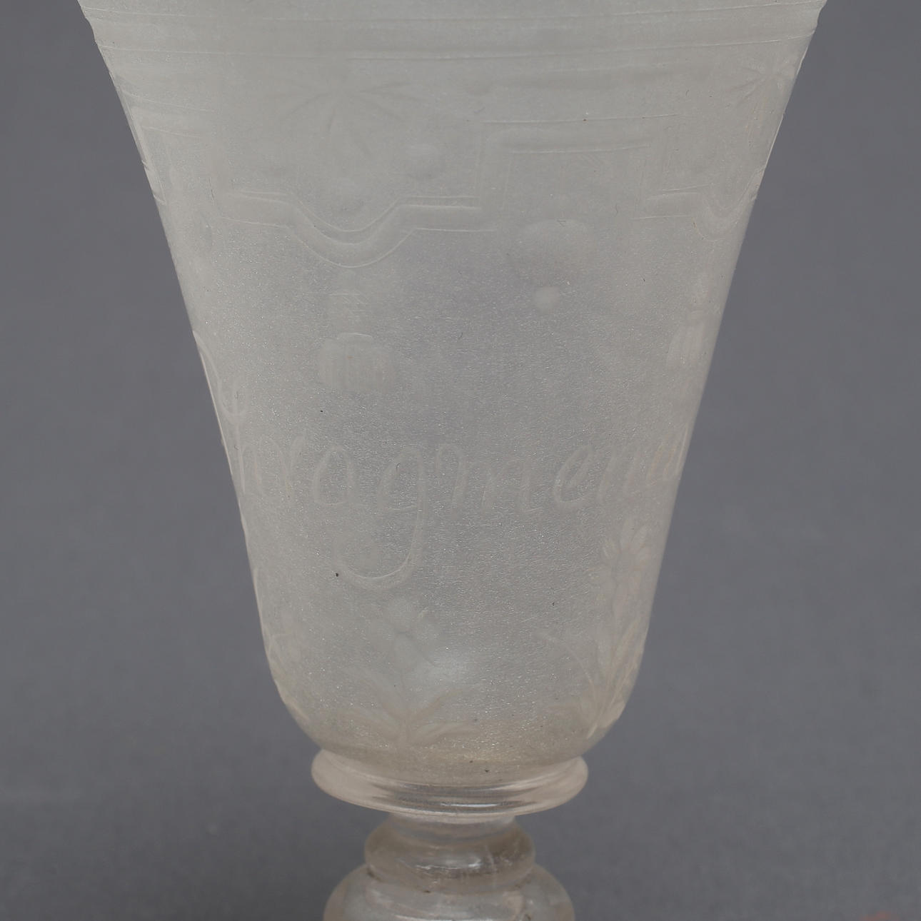 Graverad beraindekor och "Catharina Phragmenia" (troligen Catharina Phragmenia (född i Gävle 1683-1753). Höjd 13 cm.