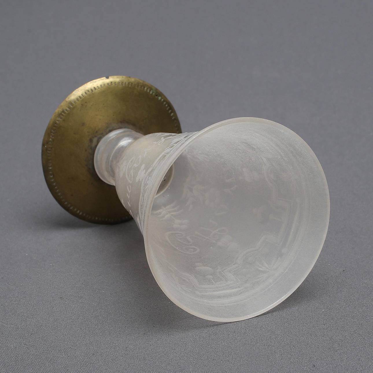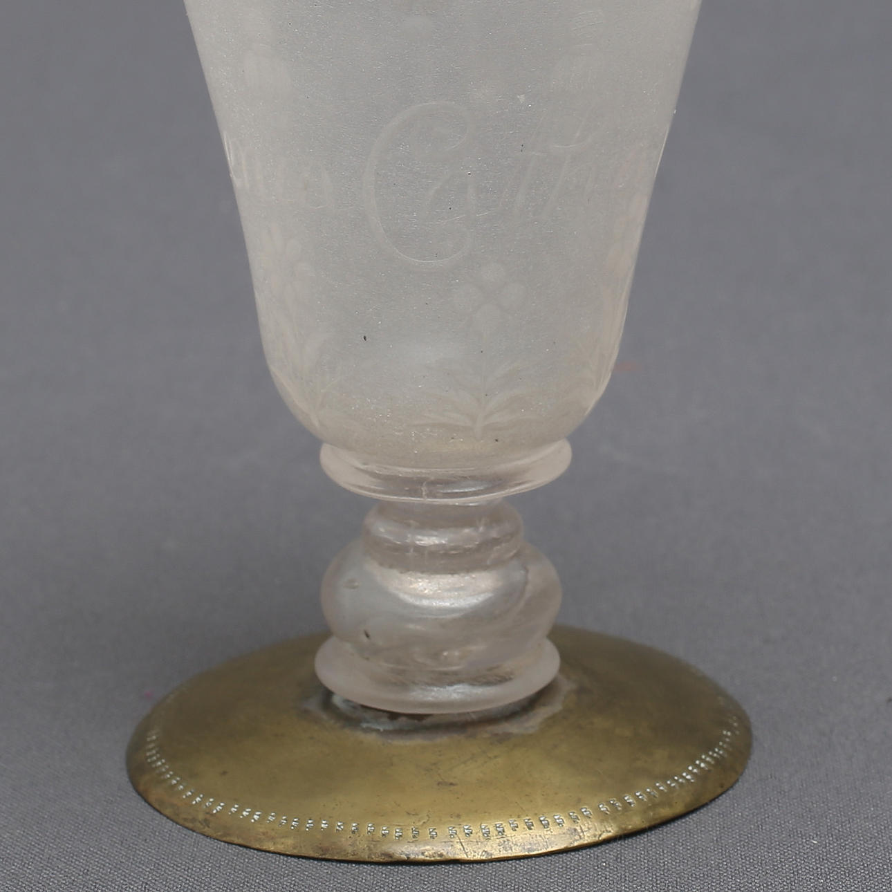 Glassjuk, fot saknas, kompletterad med mässingsfot.