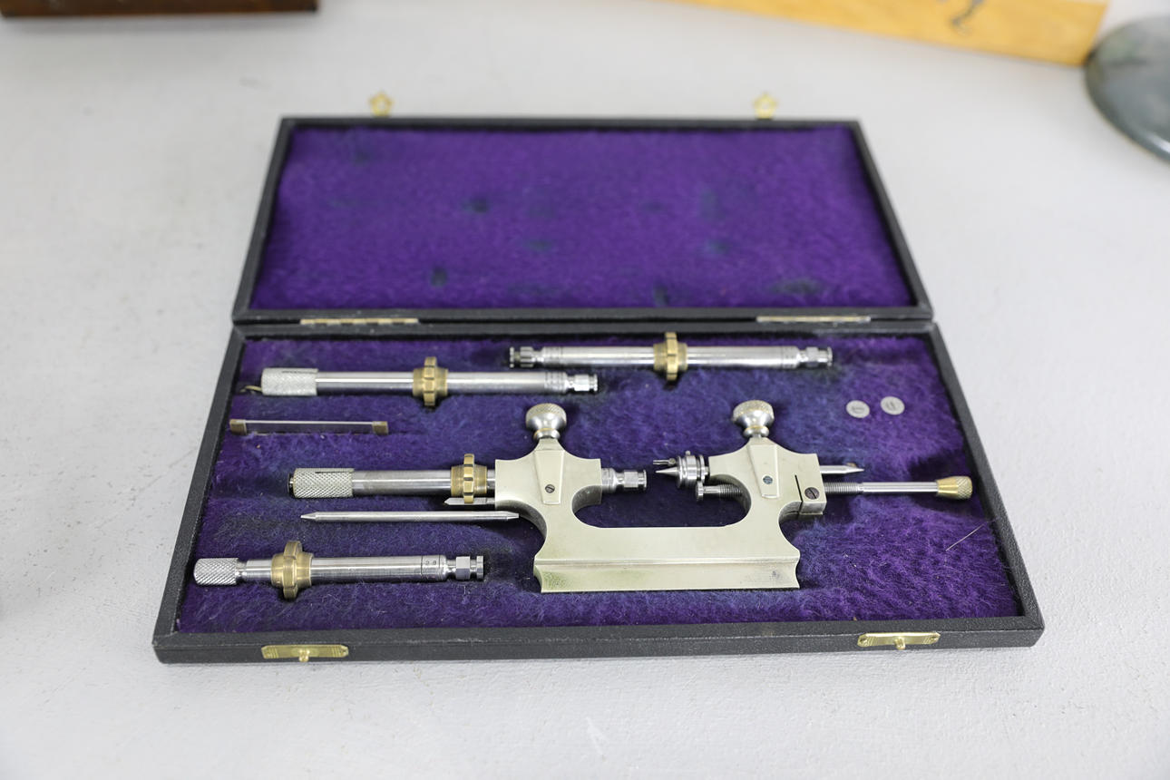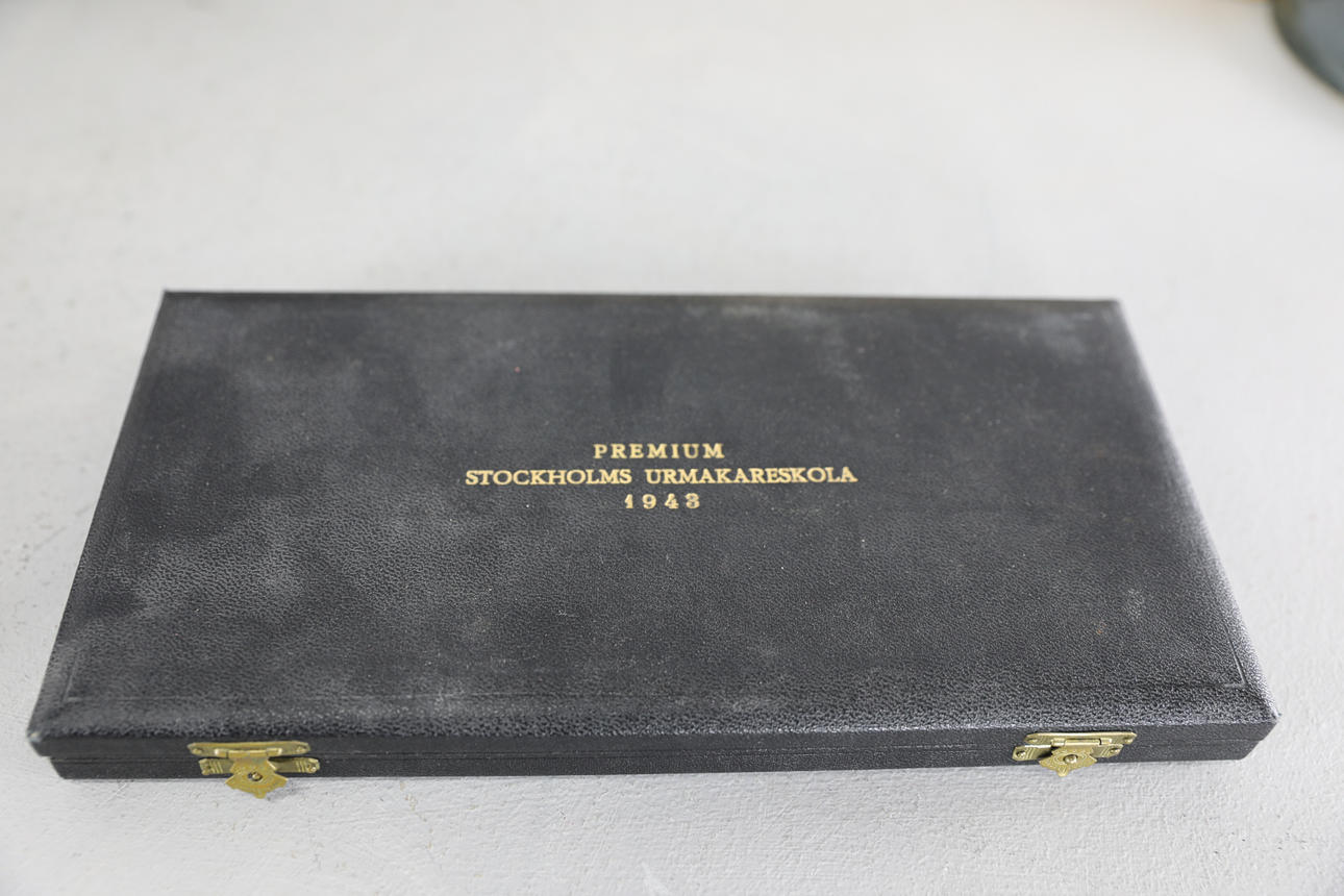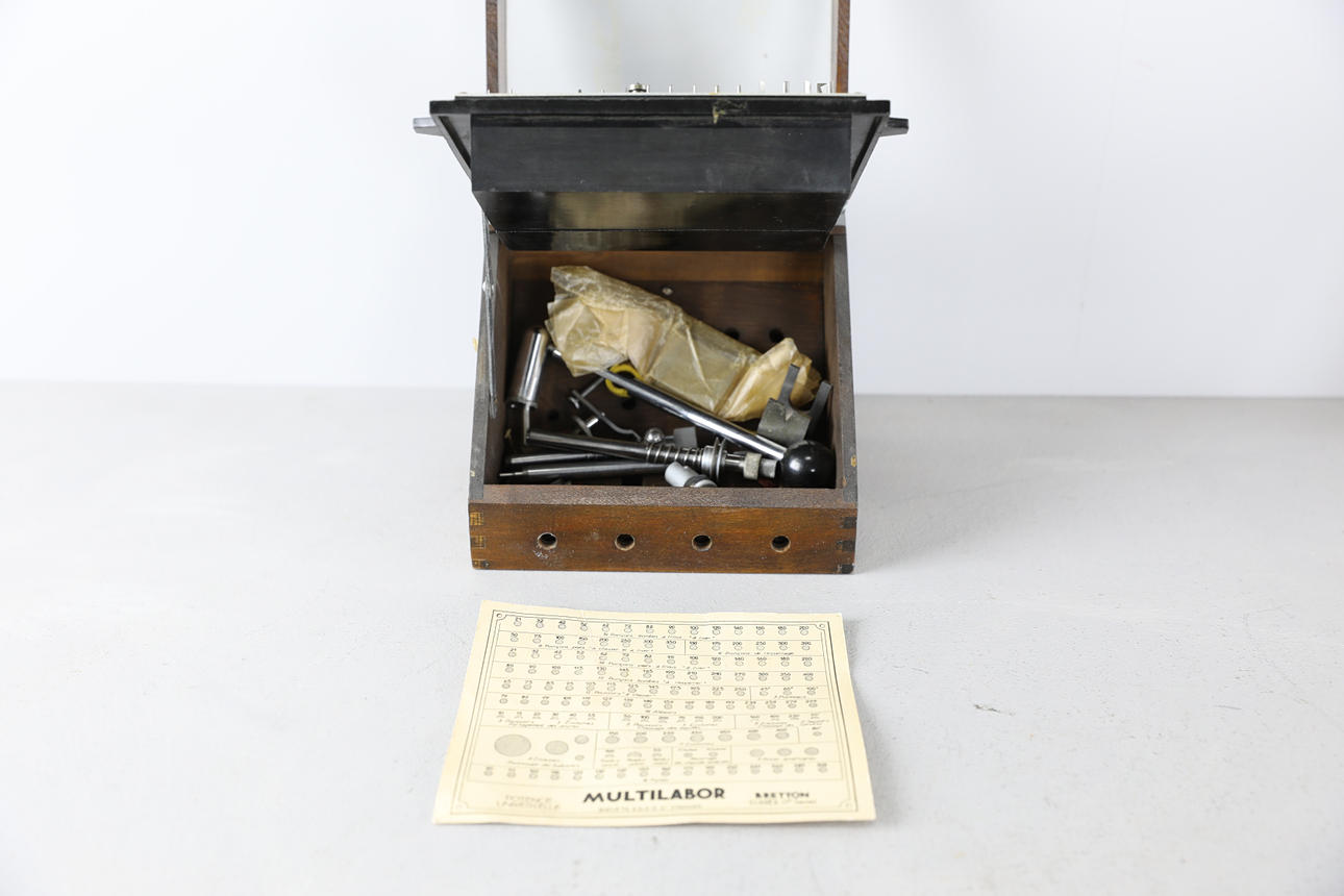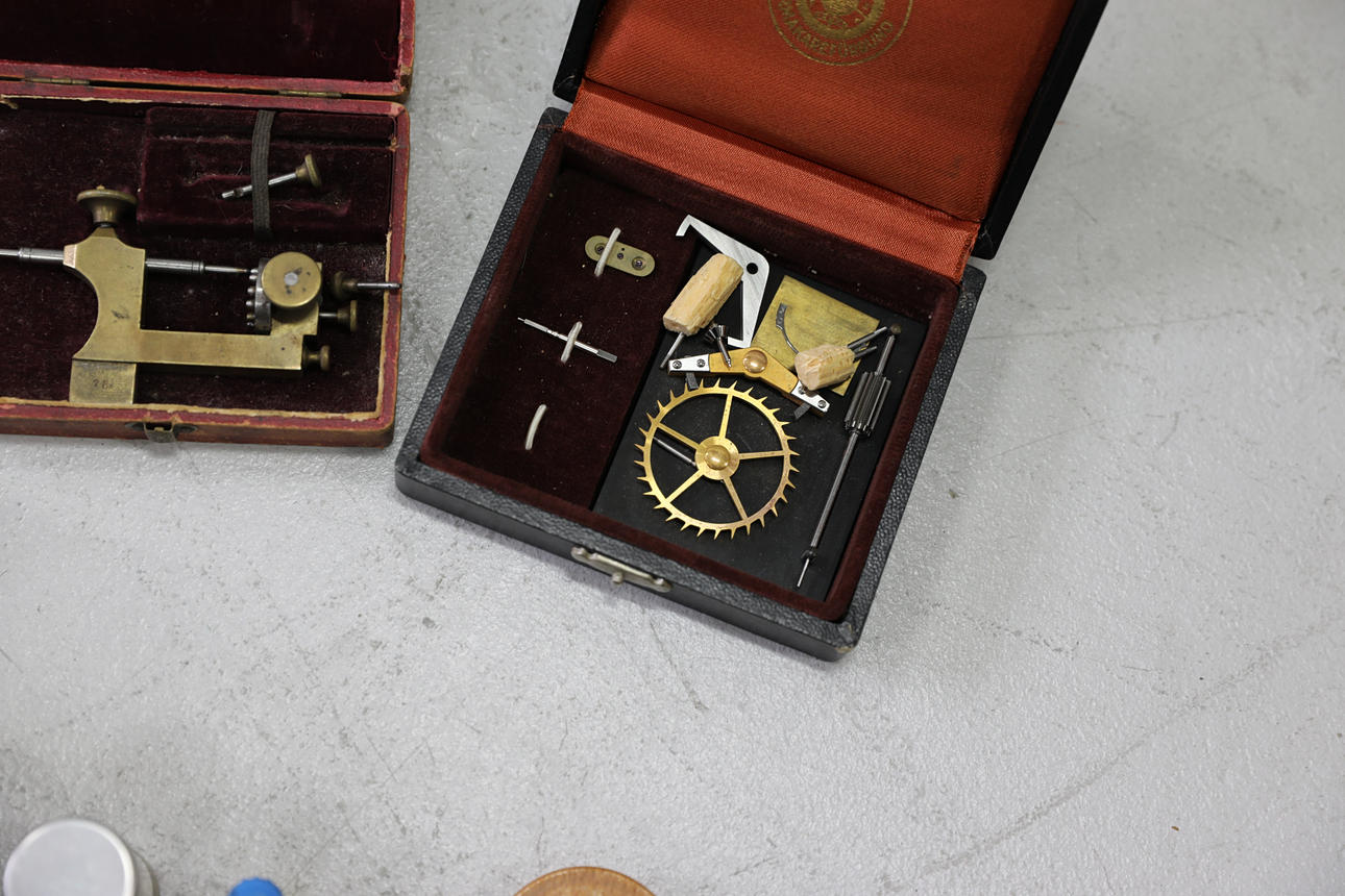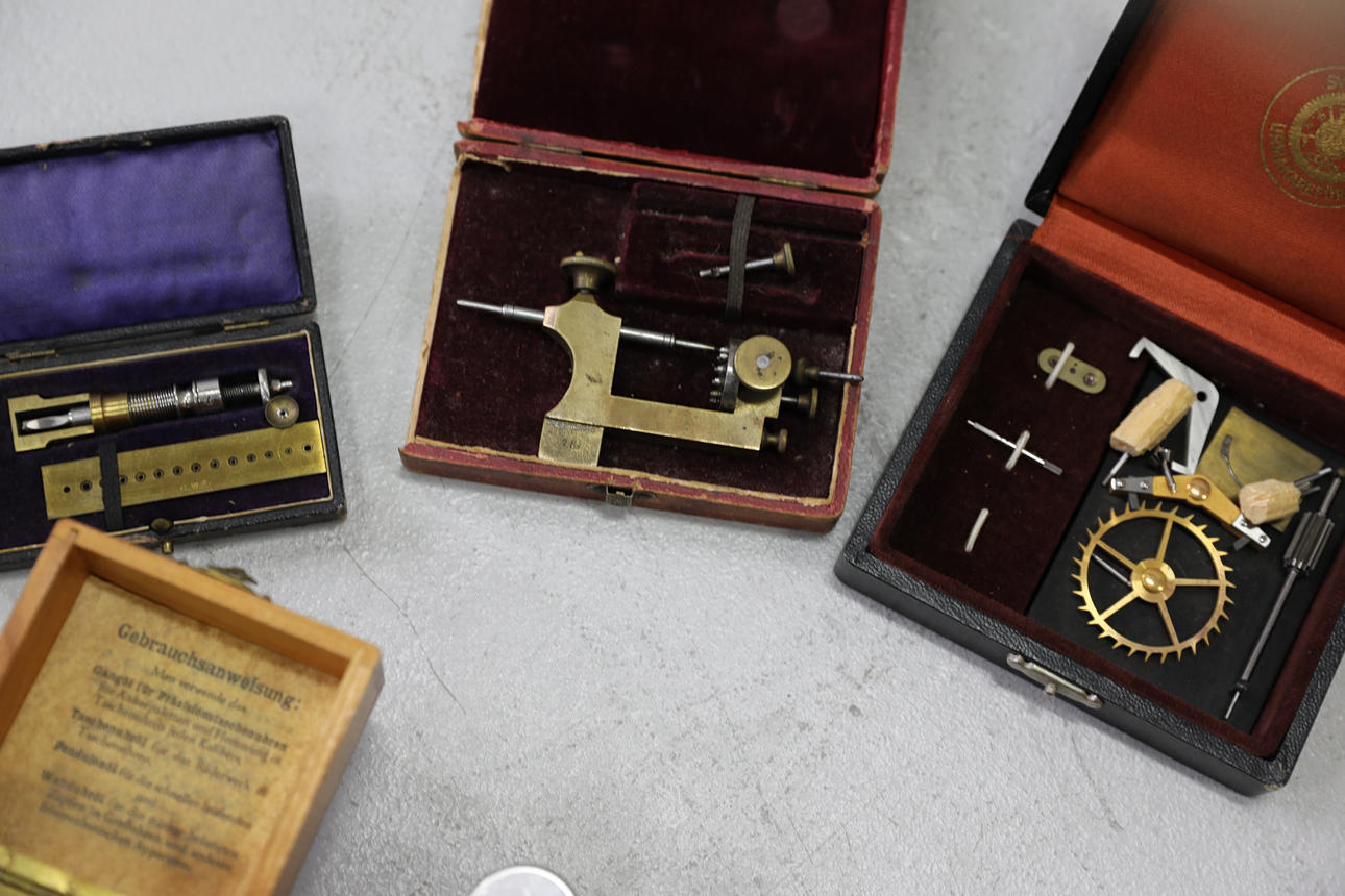 Mätklockor, Hållare, tillbehör, verktyg, reservdelar, tour a pivoter, balansvåg, Multilabor Potence universelle Bretton, diverse litteratur.