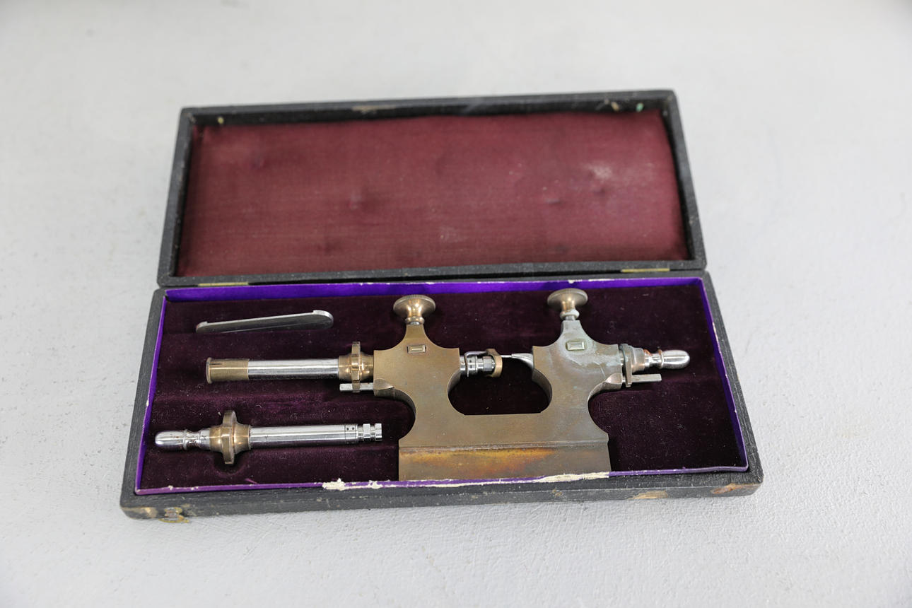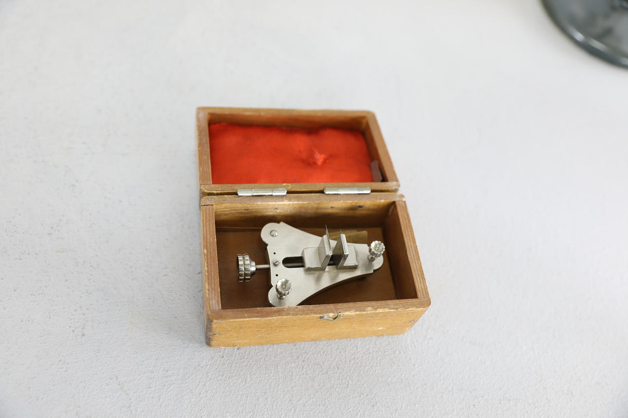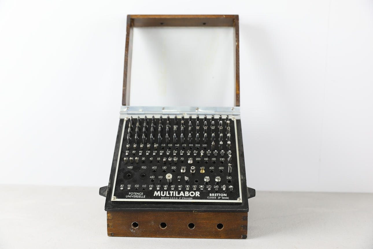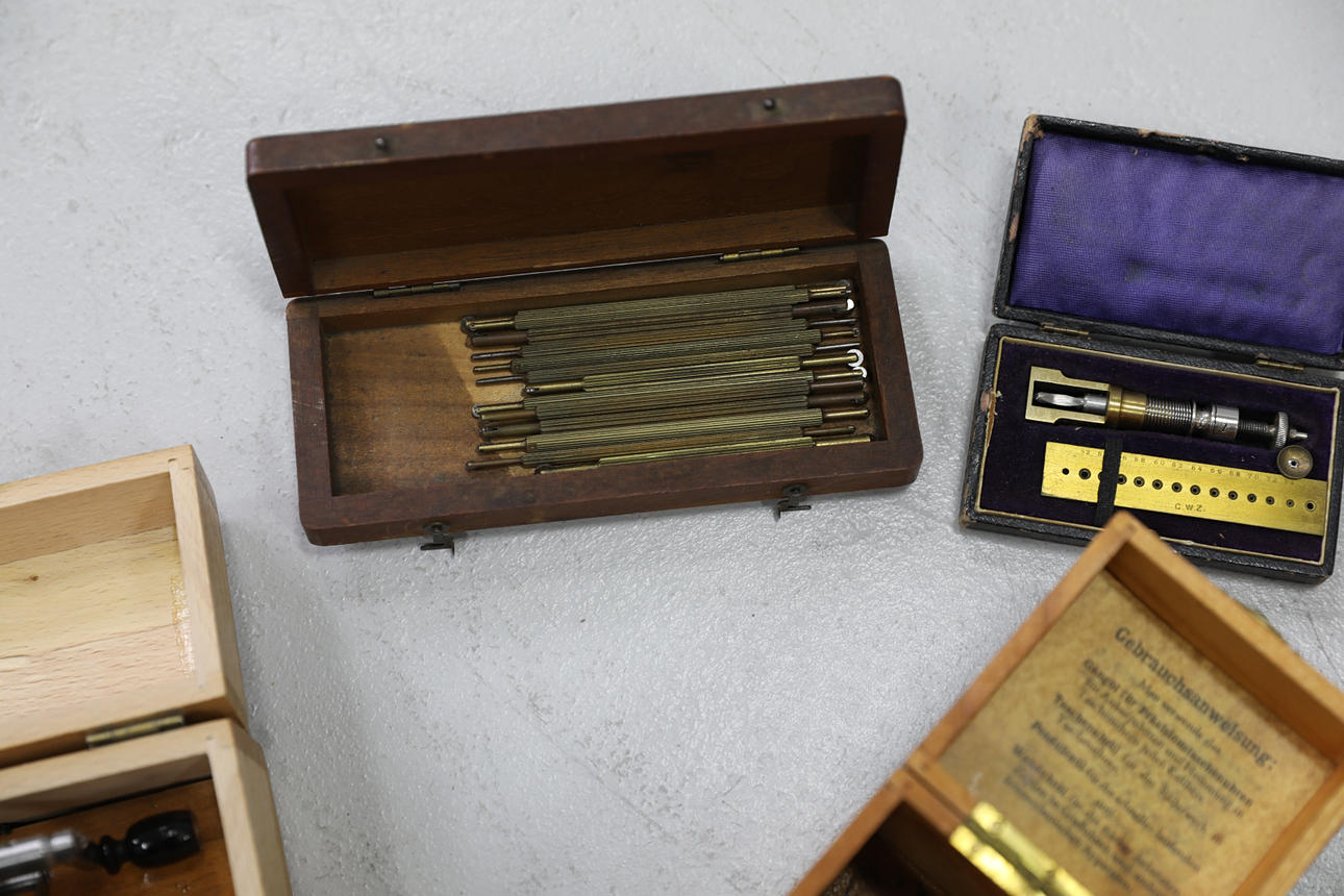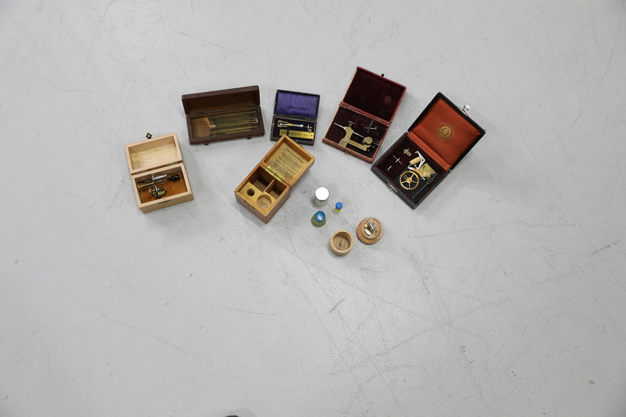 Mätklockor, Hållare, tillbehör, verktyg, reservdelar, tour a pivoter, balansvåg, Multilabor Potence universelle Bretton, diverse litteratur.