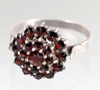 Ringen är gjord av 925 silver, så stämplad i ringbandet. Det något upphöjda ringhuvudet på 14 mm diameter är i en rund tvåstegs blommaform helt täckt med rosenskurna granater, ringstorlek 59, innerdiameter 19 mm, vikt ca.. 3,7 gram, mittsten med små tecken på slitage.