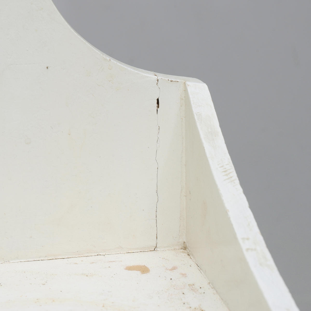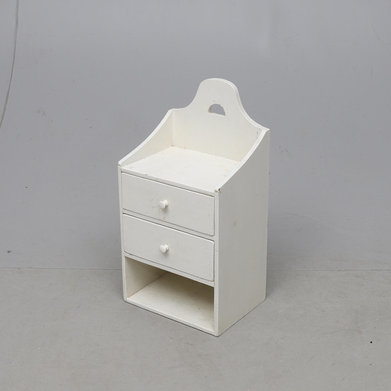 Målat trä. Två lådor och ett hyllplan. Längd 31. Bredd 25. Höjd 59 cm.