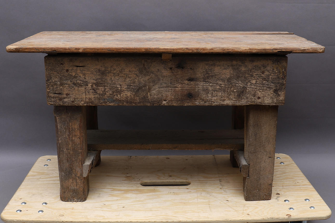 Bruk- och åldersslitage. Skador; avslag på trä, sprickor.