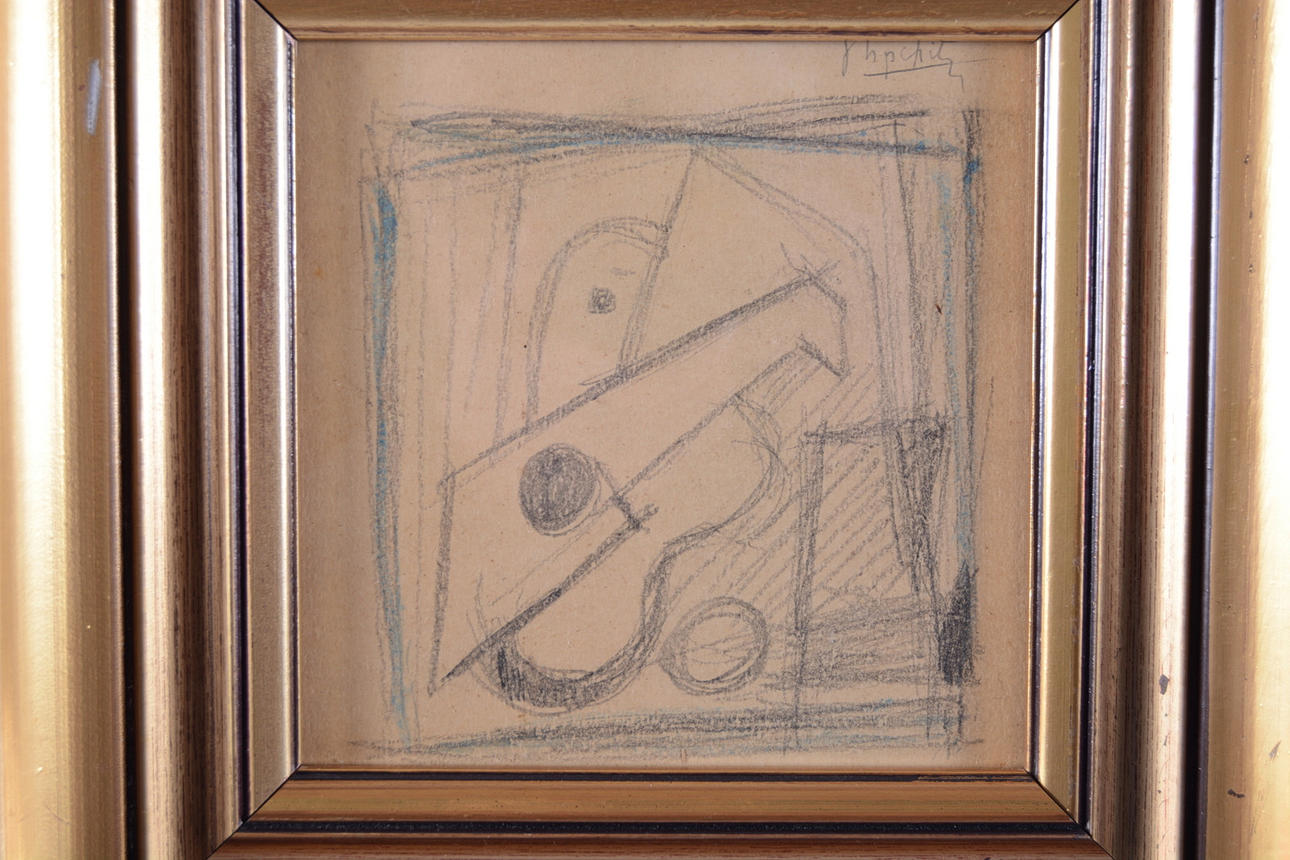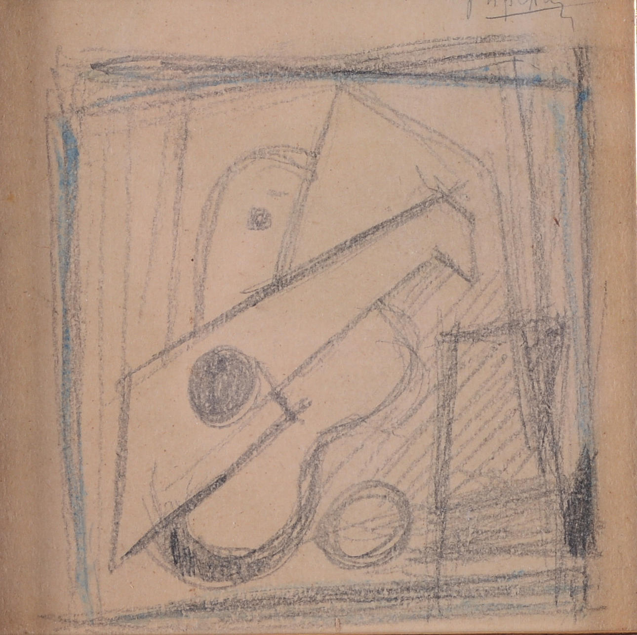 Kubistisk kompositon med gitarr, signerad 14x14 cm.
