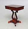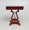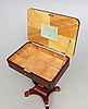 Fanerat i mahogny. Uppfällbar skiva med underliggande fack. Längd 56, bred 38, höjd 63 cm.