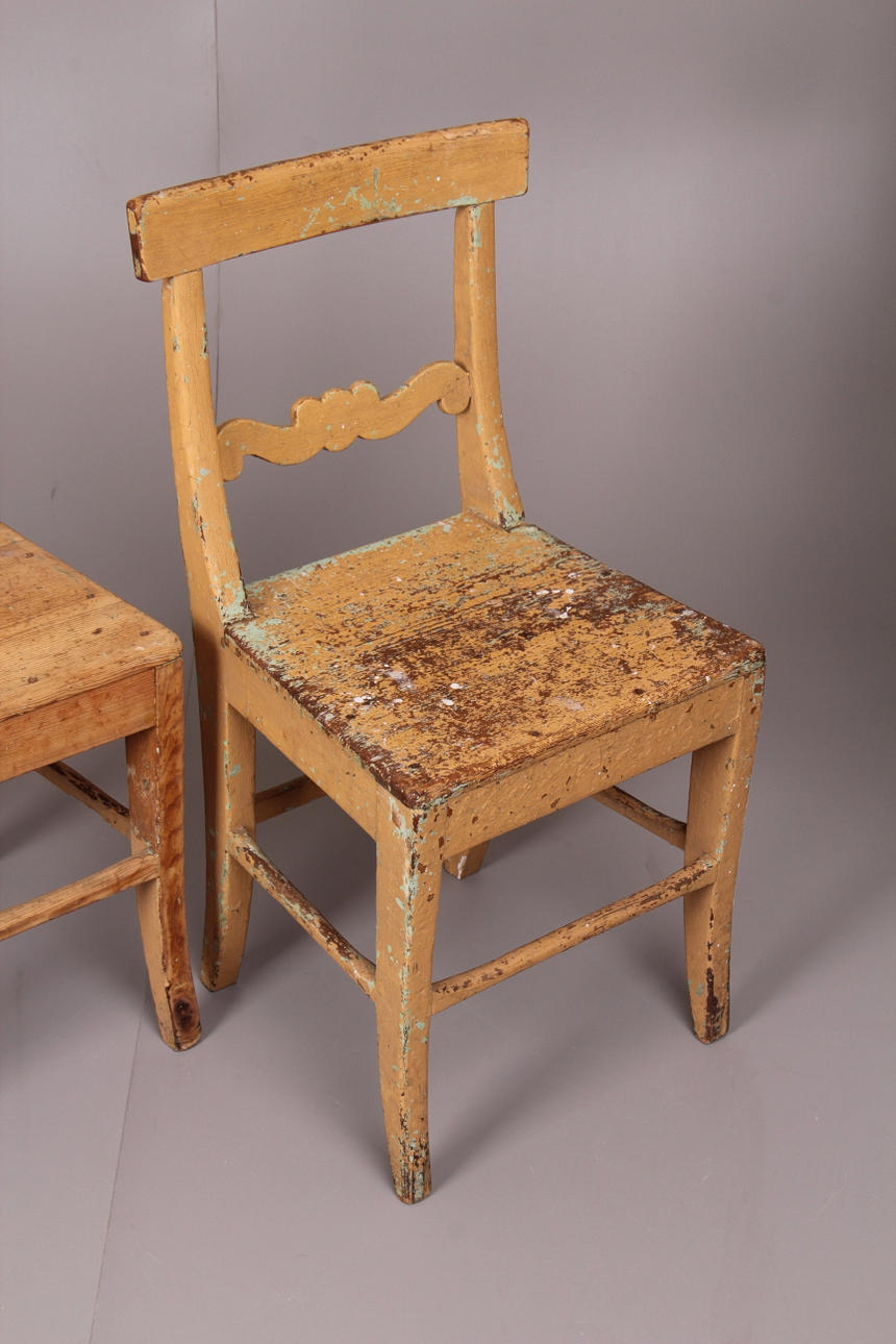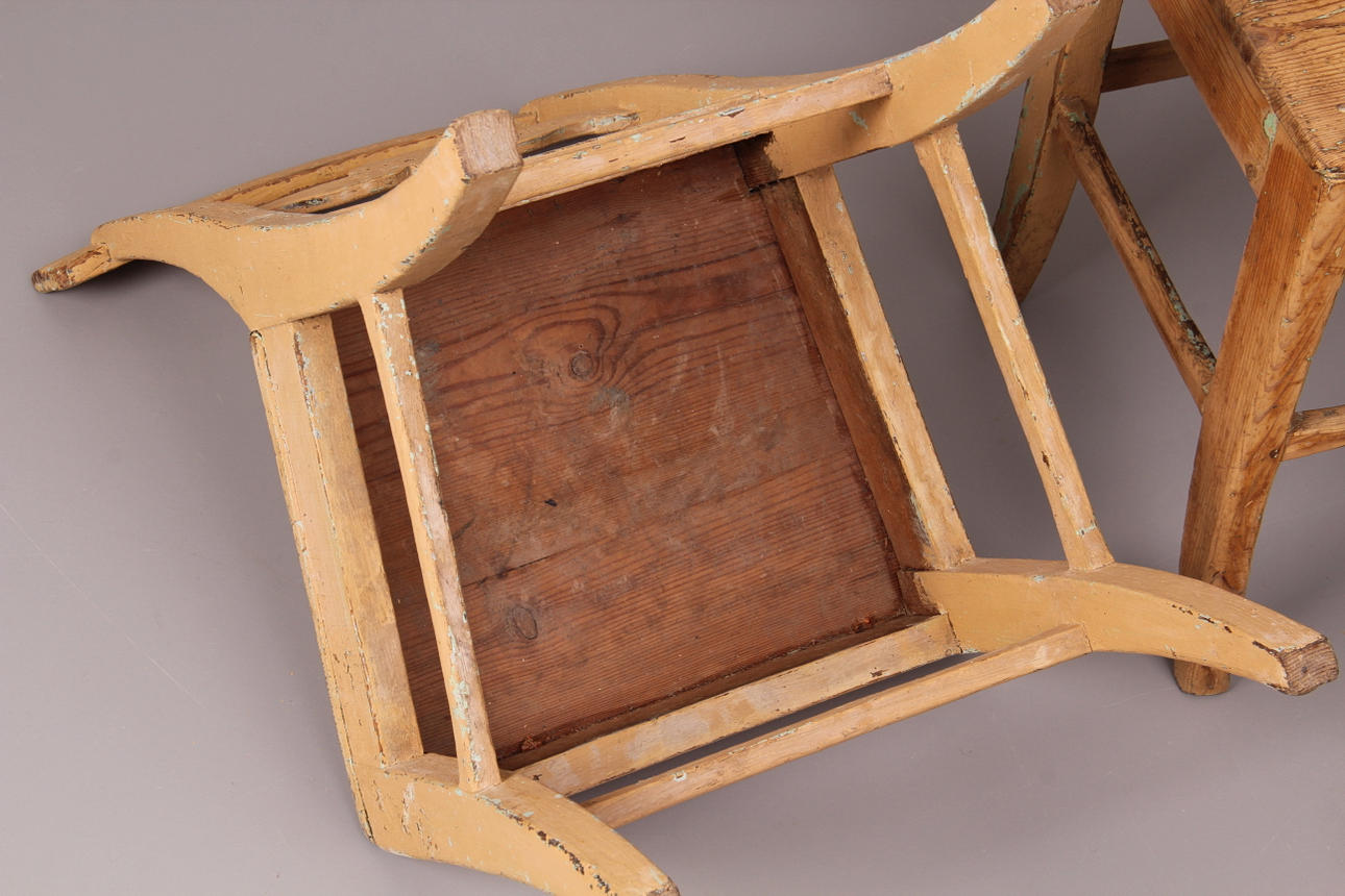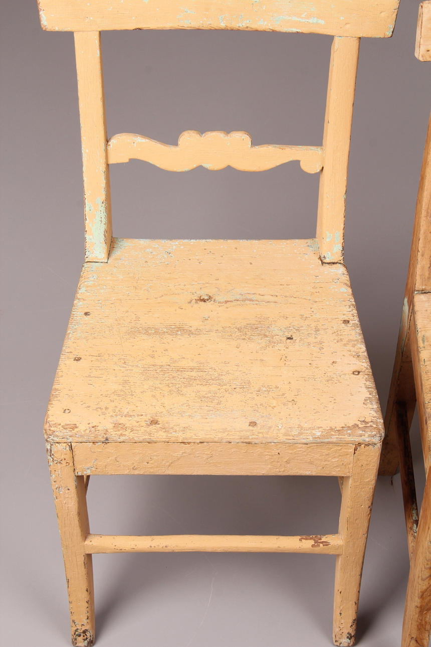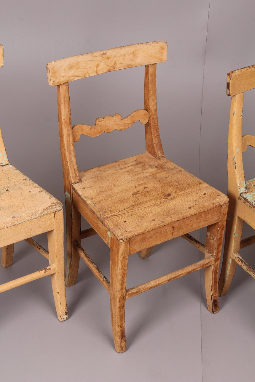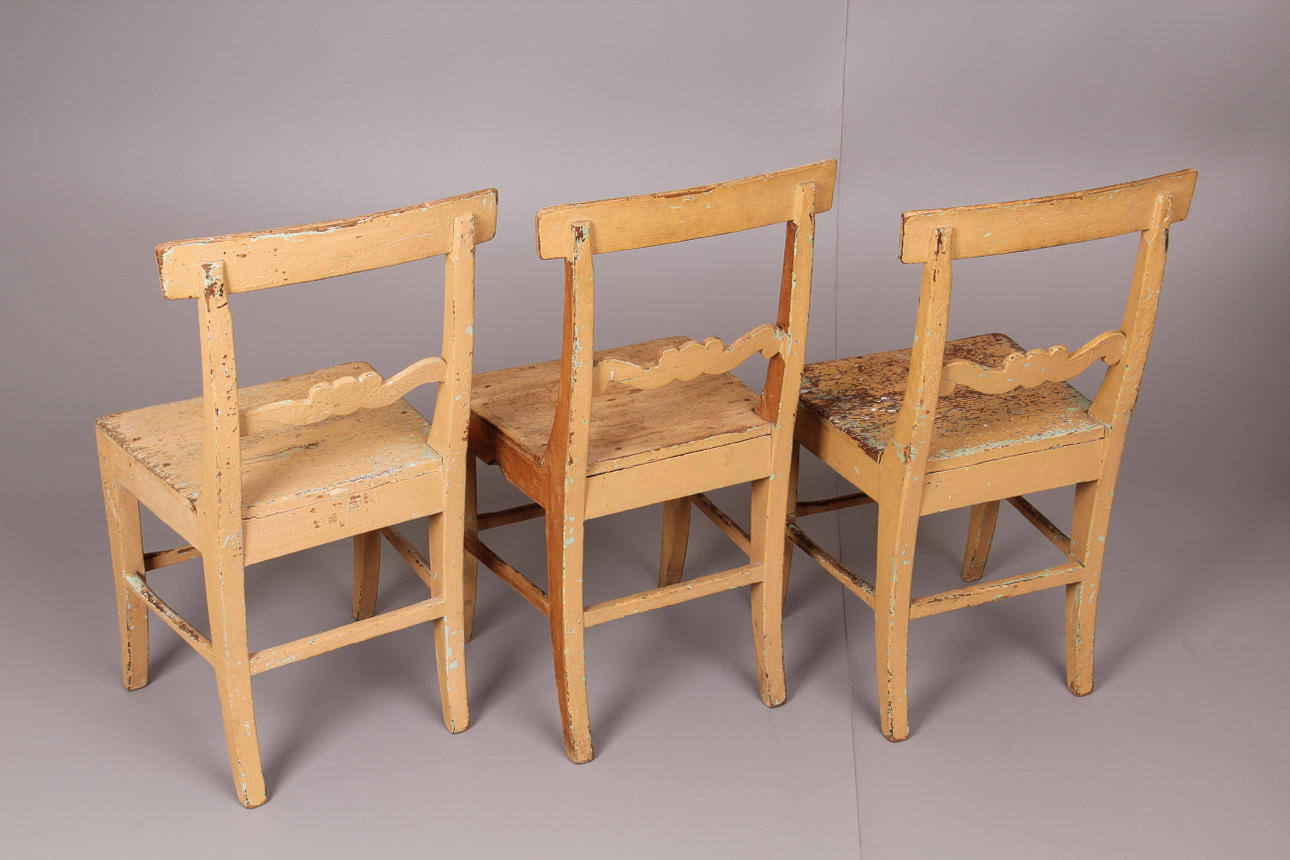 Slitage, ena stolen är delvis slipad, de övriga bemålade.