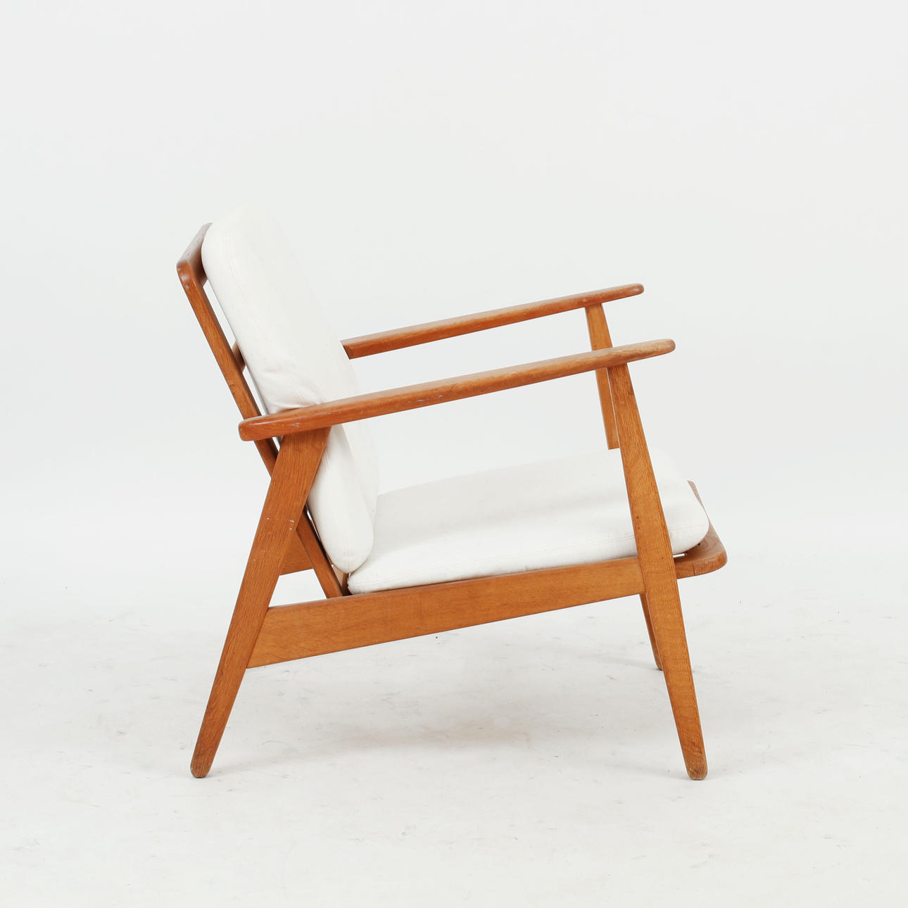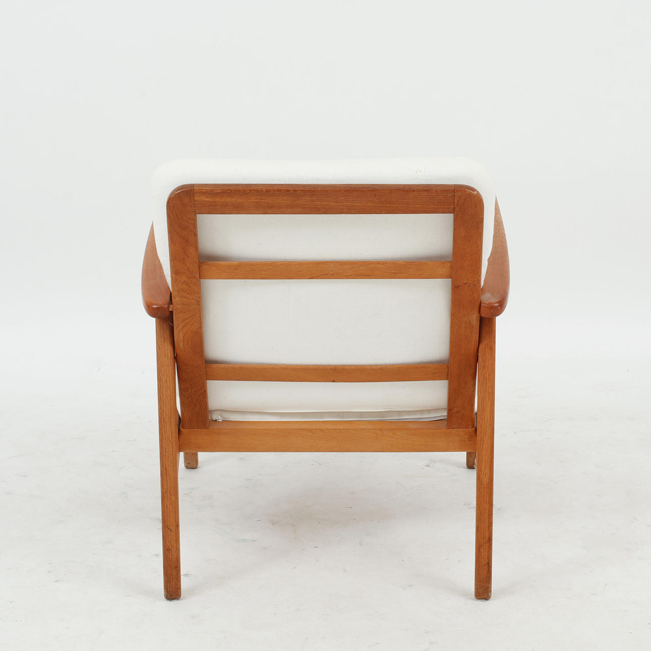 Stomme i ek med armlän i teak. Textilklädda plymåer. Bredd ca cm, sitthöjd ca 38 cm, rygghöjd ca 73 cm.
