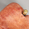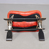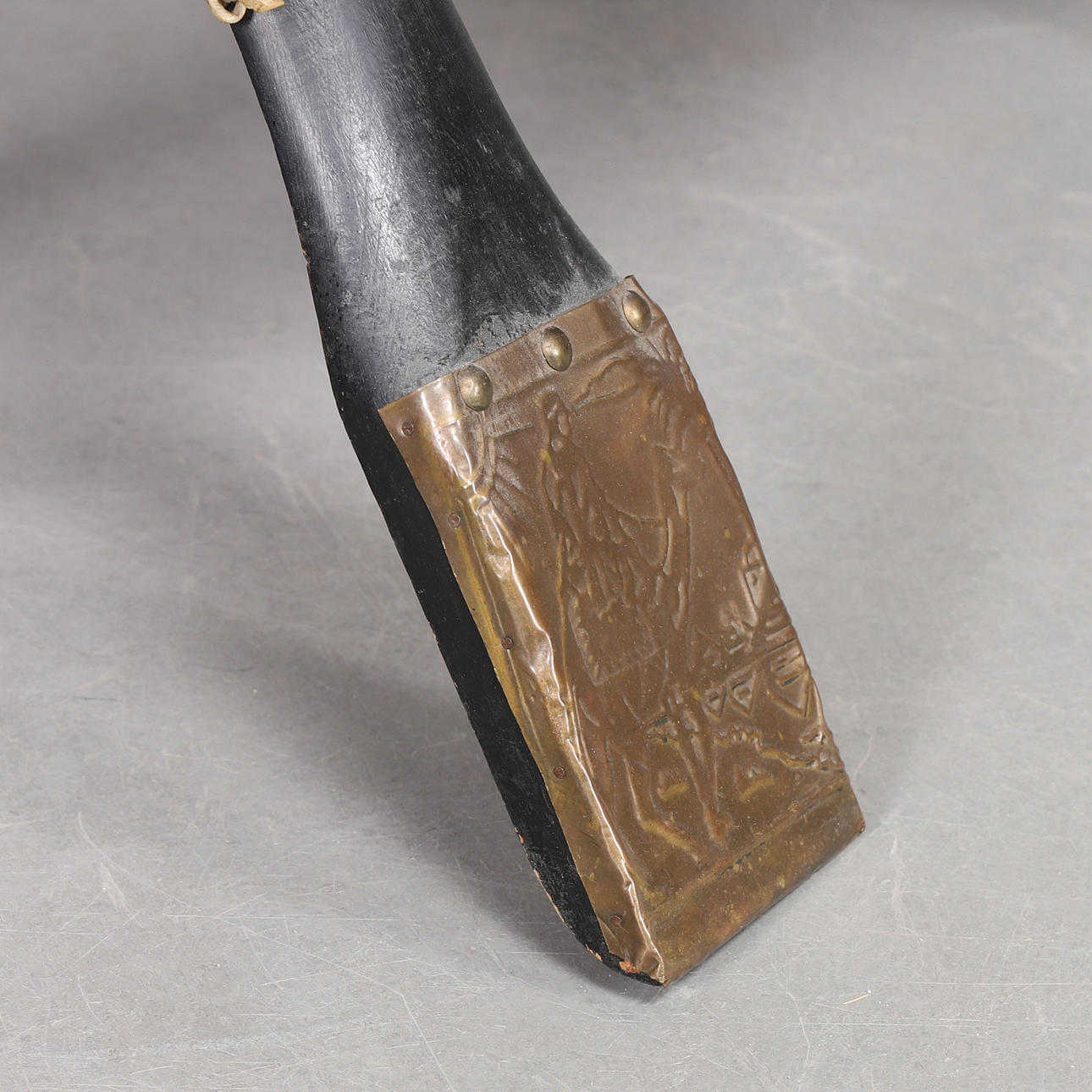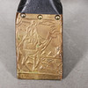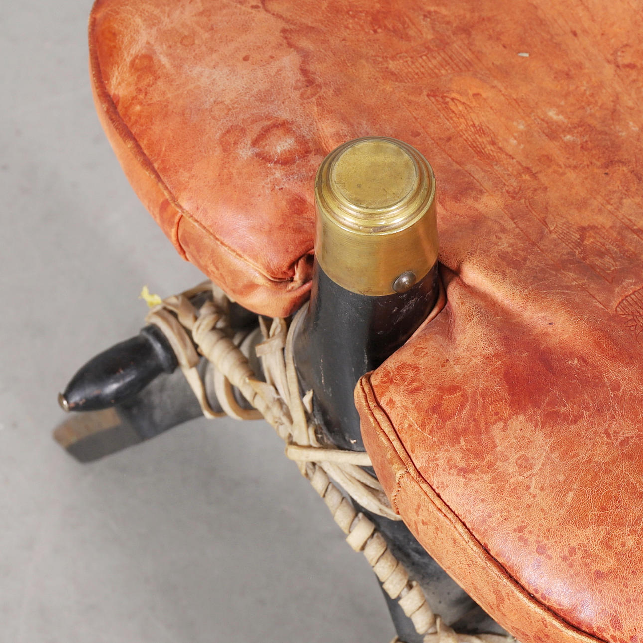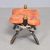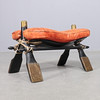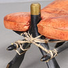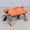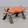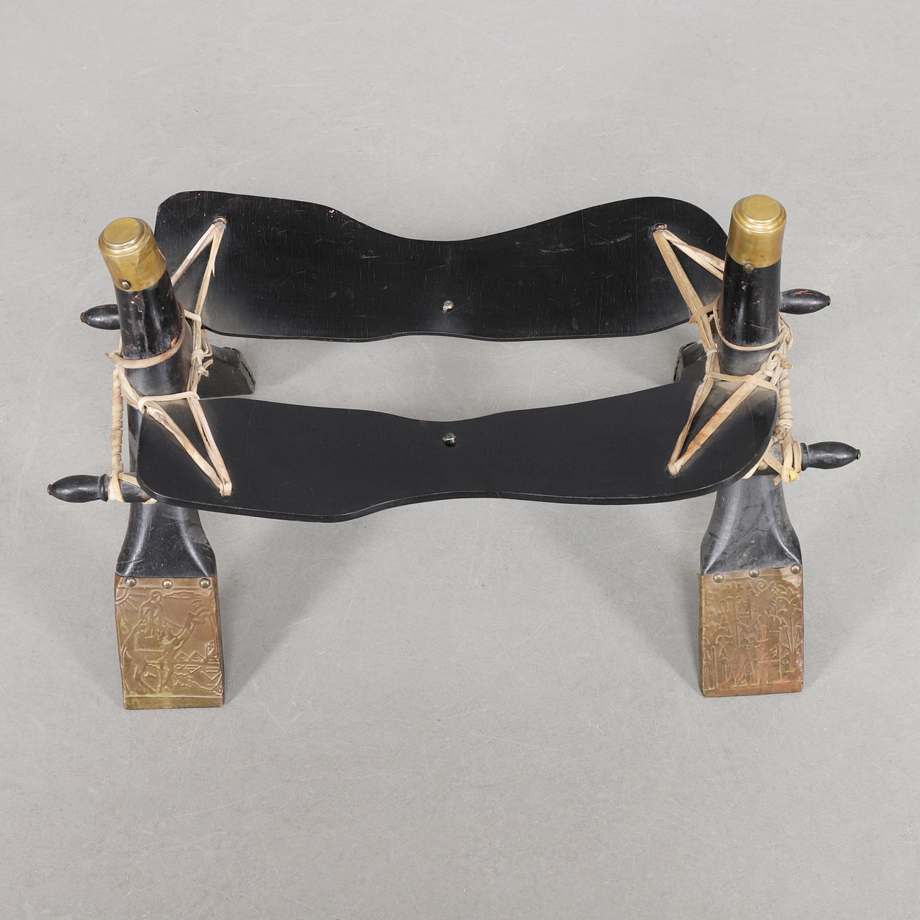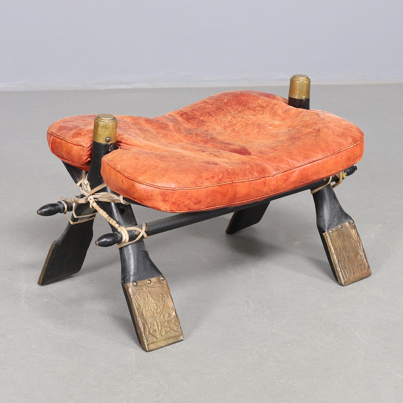 Stomme i trä med beslag i gulmetall, lös läderklädd sittdyna med präglat mönster. Mått: 69 x 41 cm, sitthöjd 32 cm.