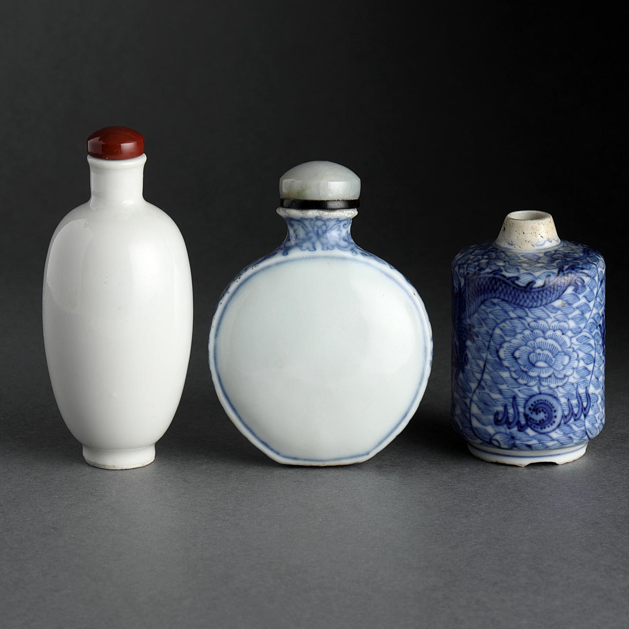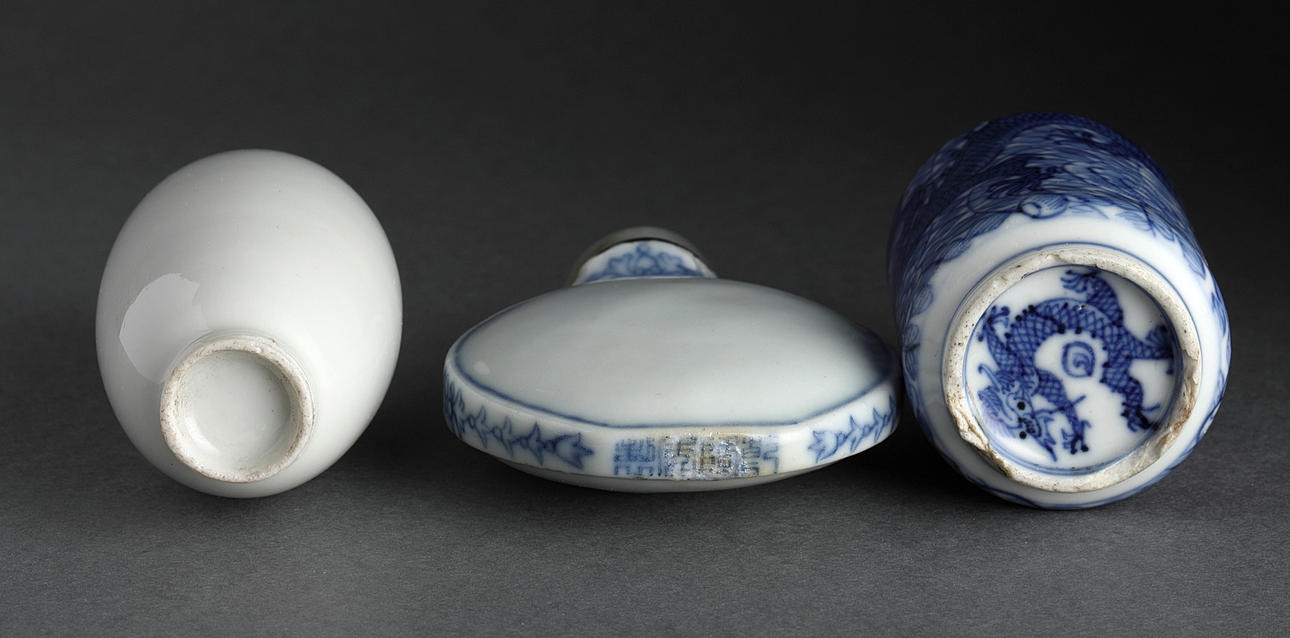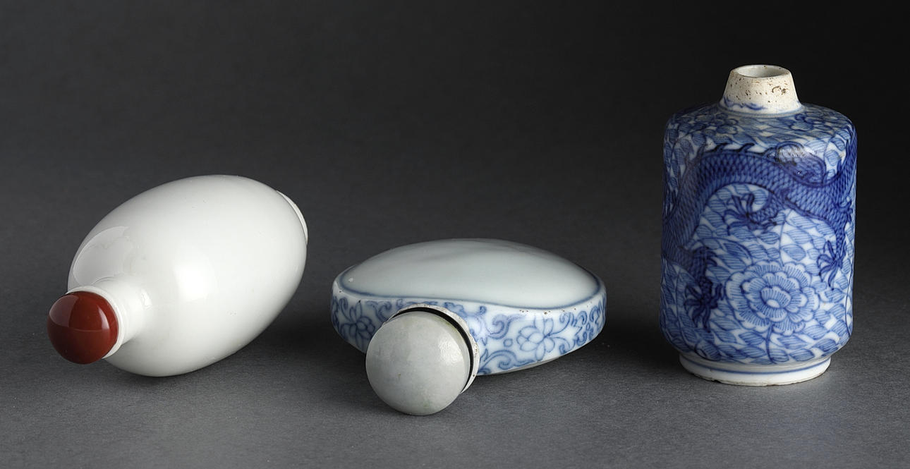 Snuff bottles, 3 pcs., porcelain, China, Qing, 19/20th century.