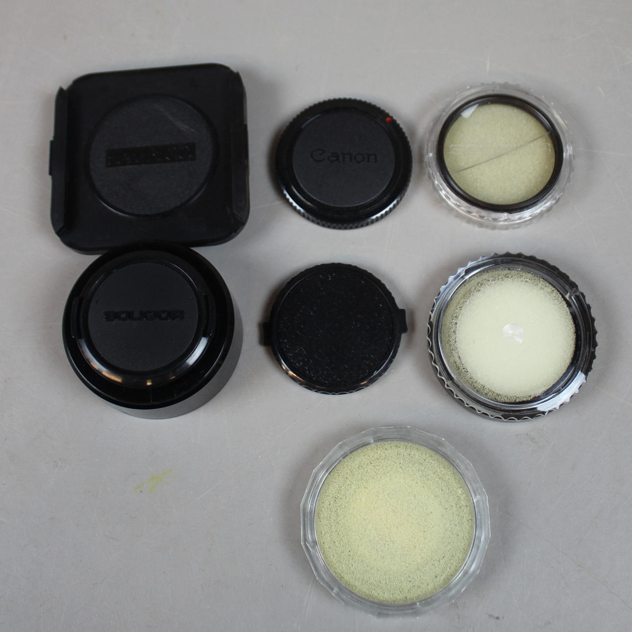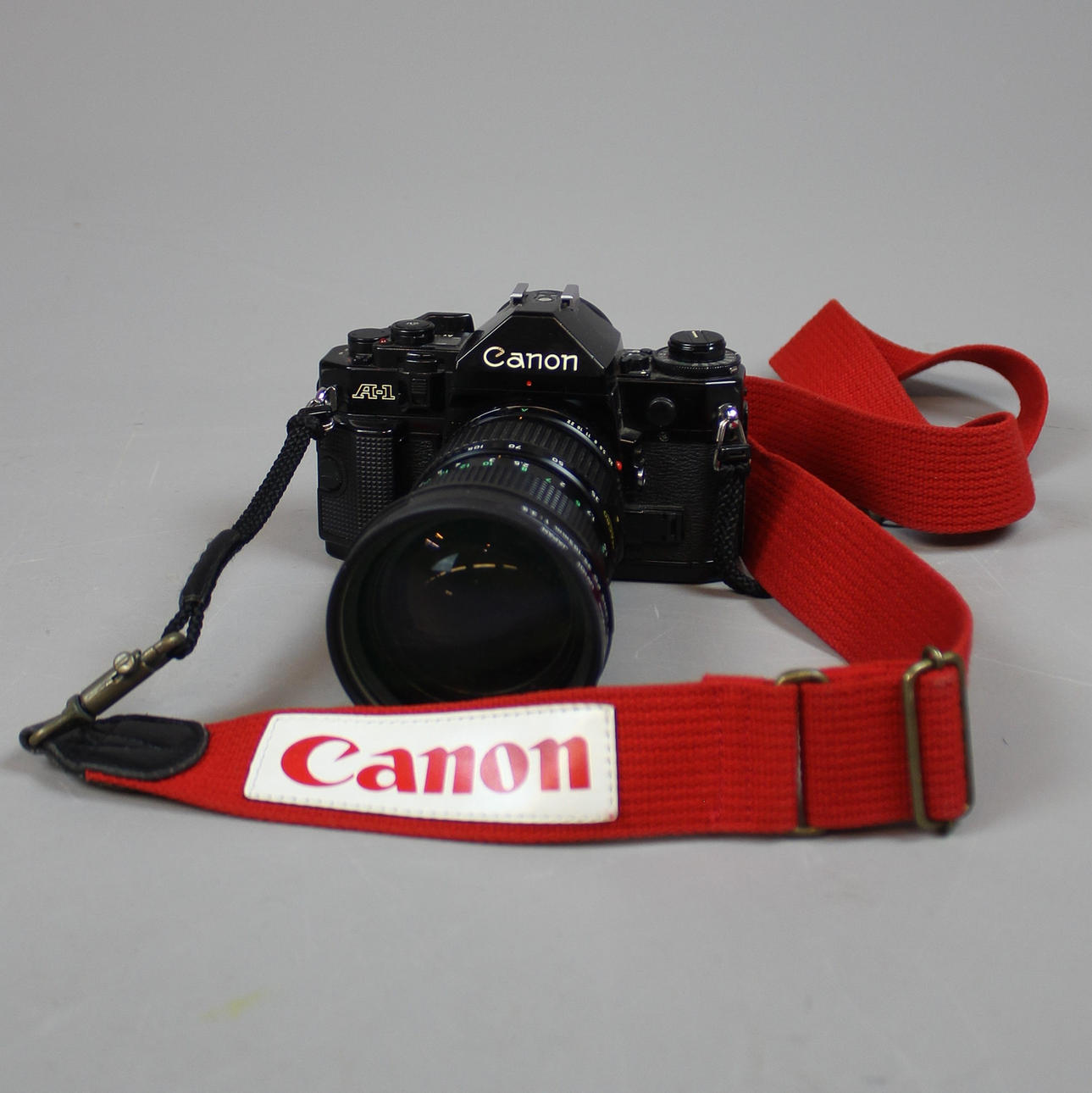 Kamera Canon A-1 snr.270520 Objektiv Canon 35-105mm Objektiv Canon 50mm Objektiv Sigma macro 80-200mm samt diverse filter och linser i väska.