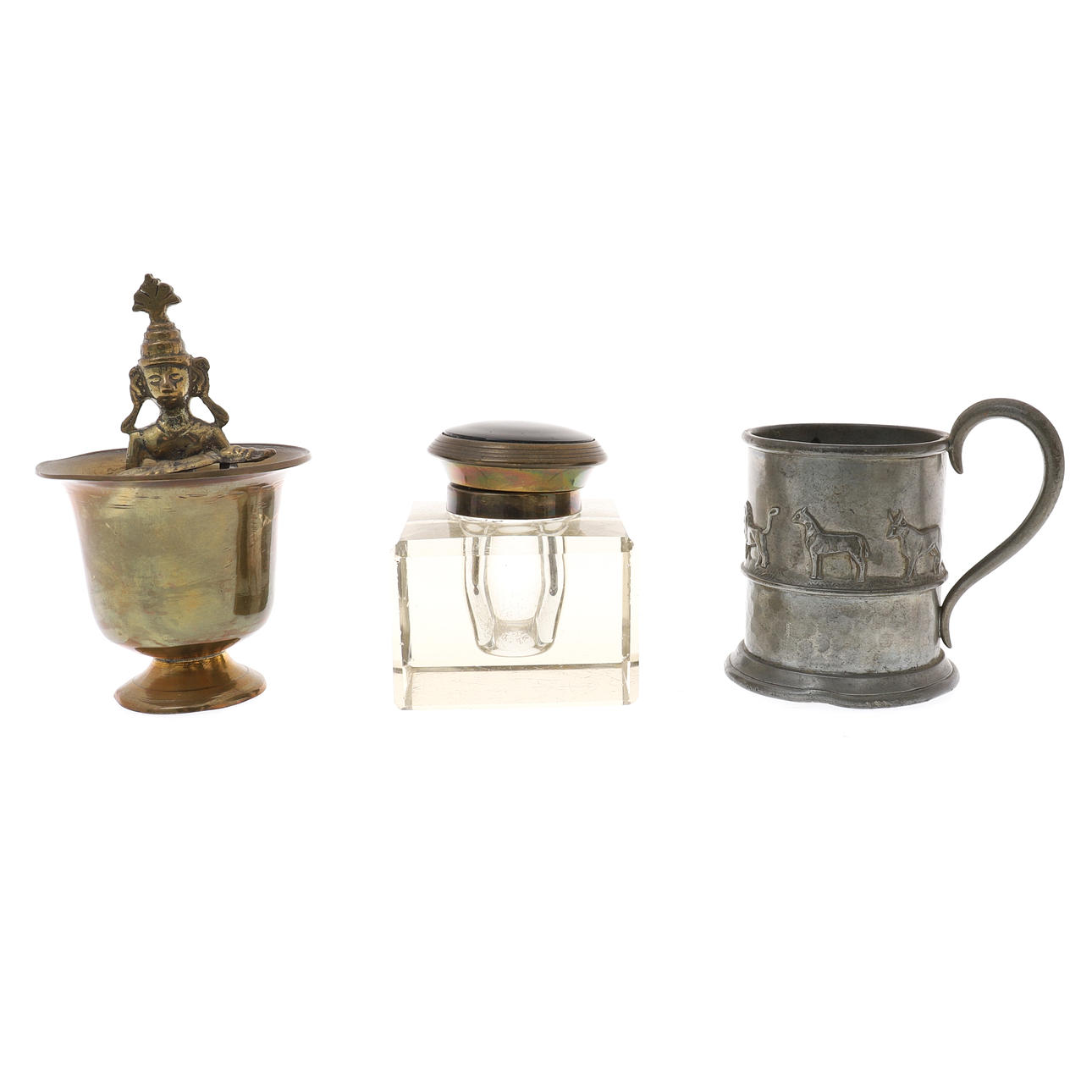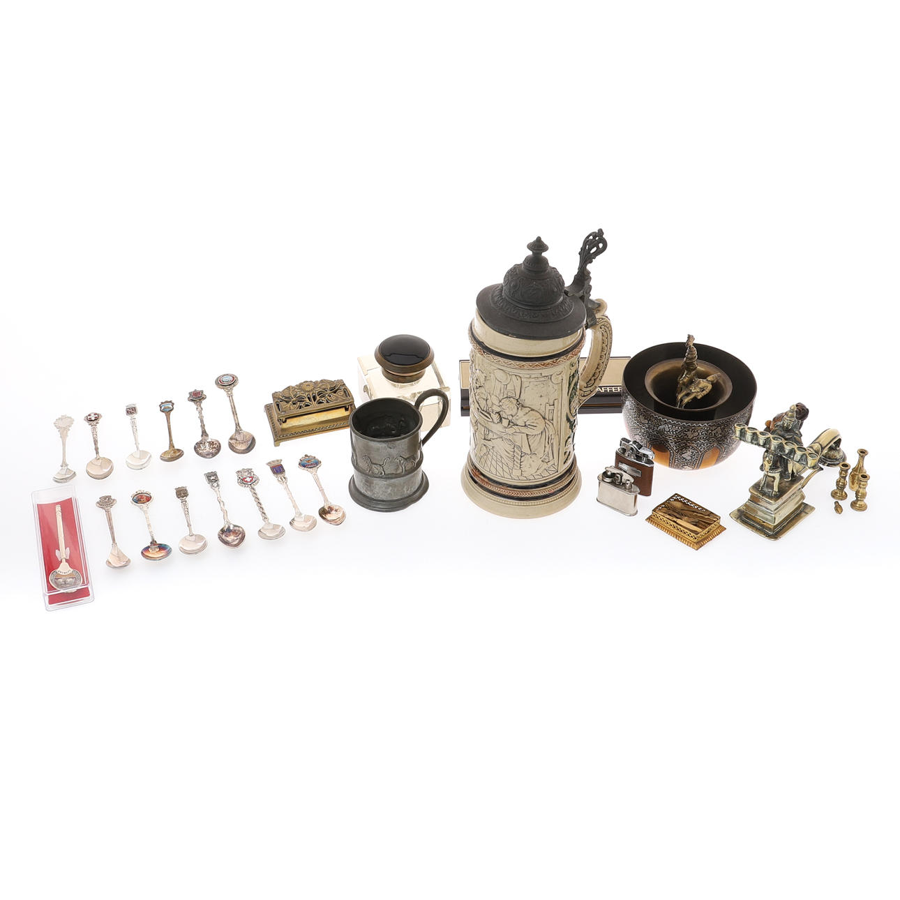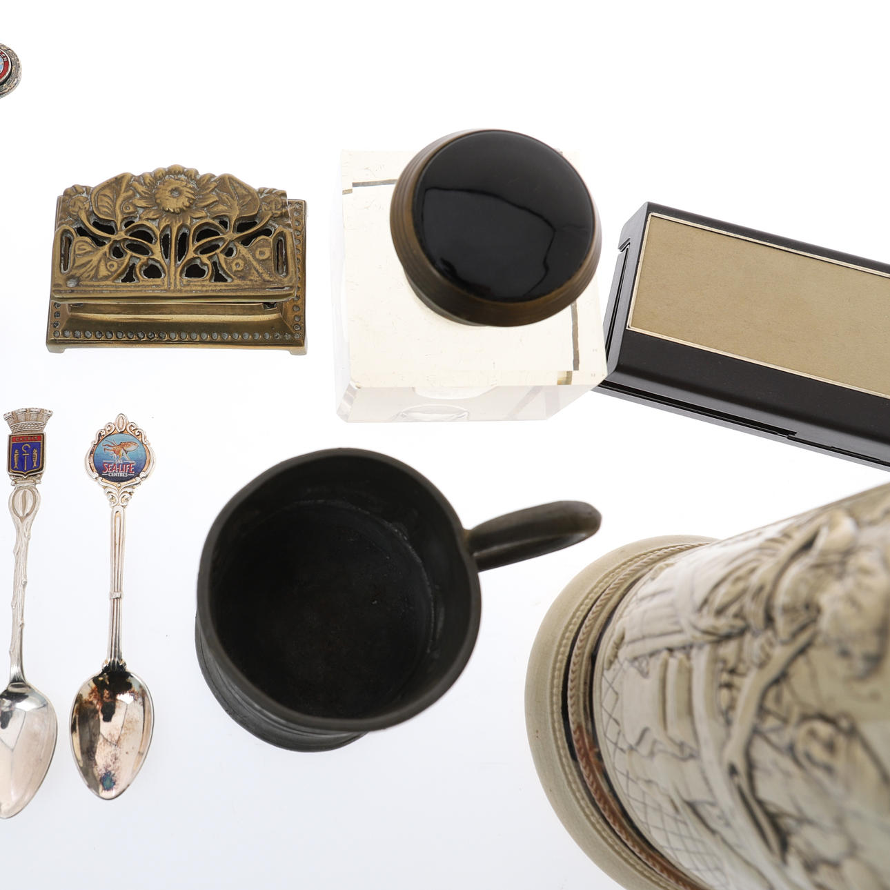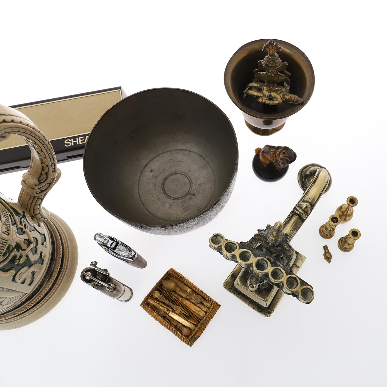 med ett kontinuerligt band av djur, träd och figur, 8,5 cm hög, en blandad metall niello foliate dekorerad skål, 11.5cm diameter x 7.5cm hög, Edwardian block glas inkwell, med svart opalin glas infälld gångjärn lock, 7cm kvadrat, gjuten mässing stämpel box, 8cm bred, asiatisk gjuten mässing menorah, 14,5 cm bred, asiatisk gjuten mässing siffra stödja en annan i sina armar, 13cm hög, snidad hornfigur av en hund, 6cm hög, tretton miniatyrförgyllda metallknivar, gafflar och skedar, i ett bestickbricka, slutet av 1800-talet, Sheaffer borstat stål reservoarpenna, hölje, Parker reservoarpenna, Colibri och Ronson tändare, samling souvenirskedar, tysk keramisk sten och rester av tätningsvaxuppsättning (antal)